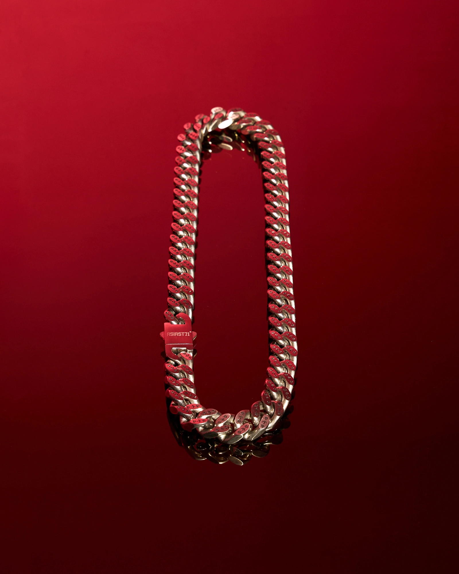 Цепь из высококачественной нержавеющей стали и крупных, плавно изогнутых звеньев с лазерной брендированной гравировкой. Особое внимание уделено фирменному карабину с логотипом Asia St 71, который обеспечивает надежную фиксацию изделия на руке. Элегантный блеск металла создает эффектный визуальный акцент — изделие идеально впишется в любой образ.