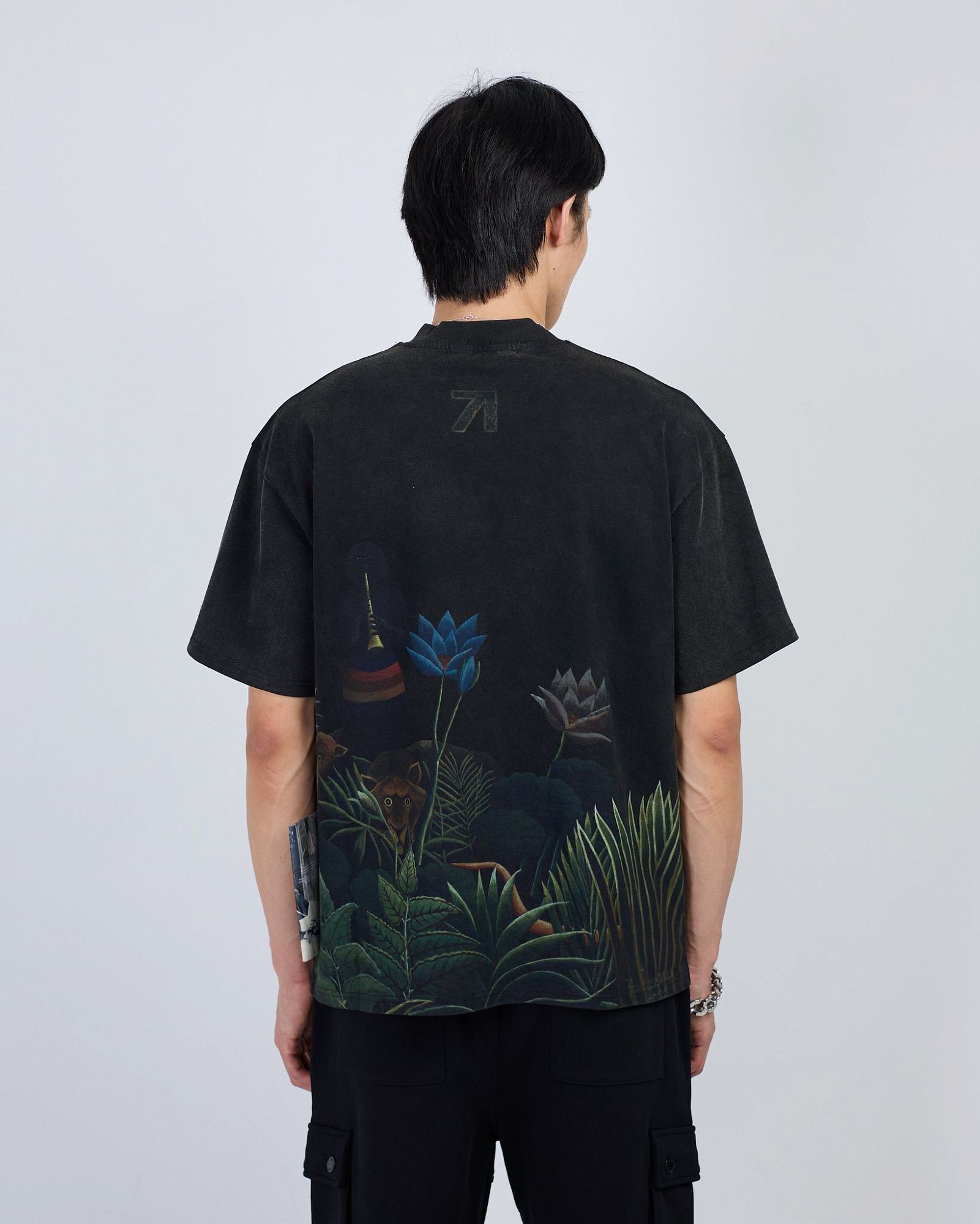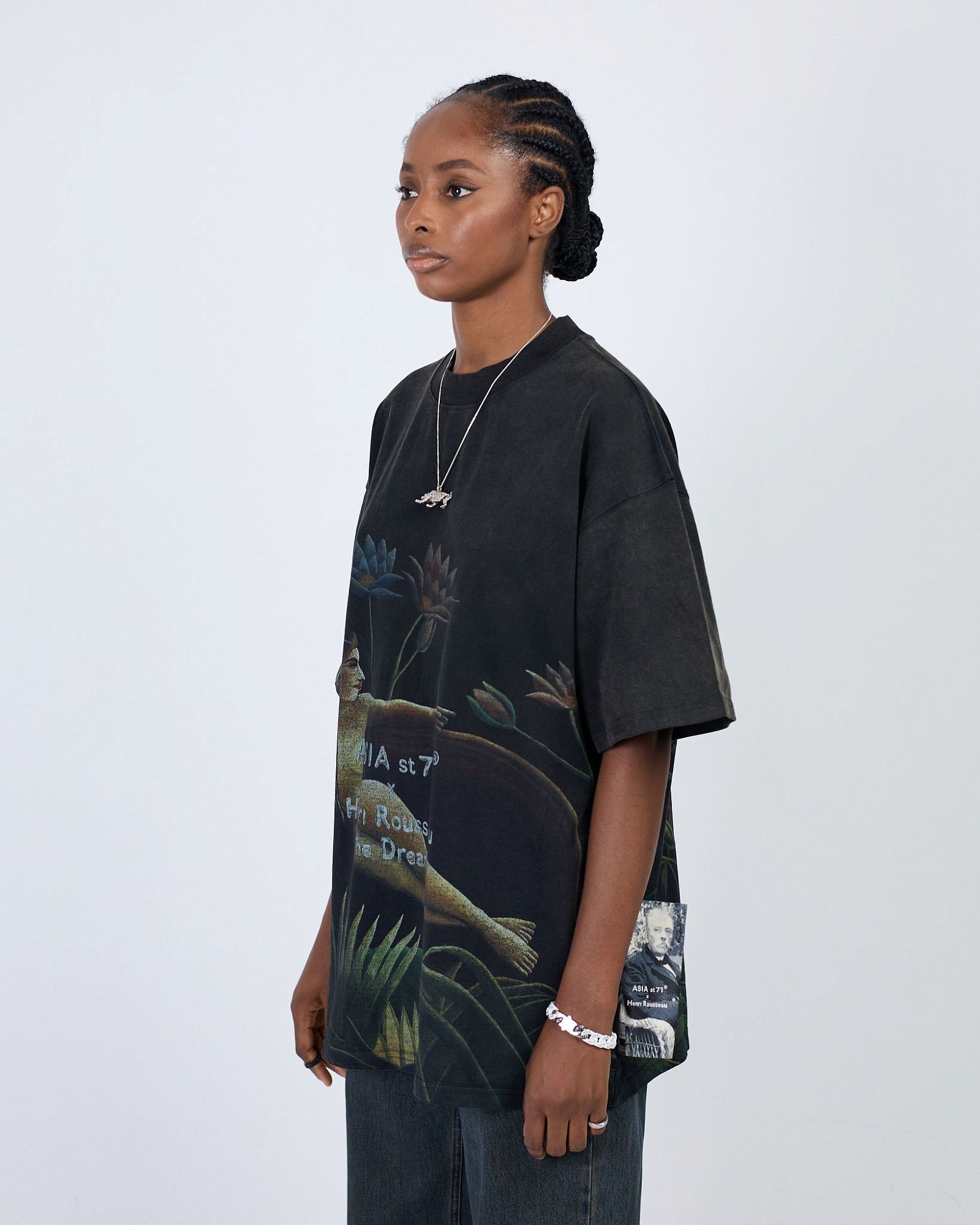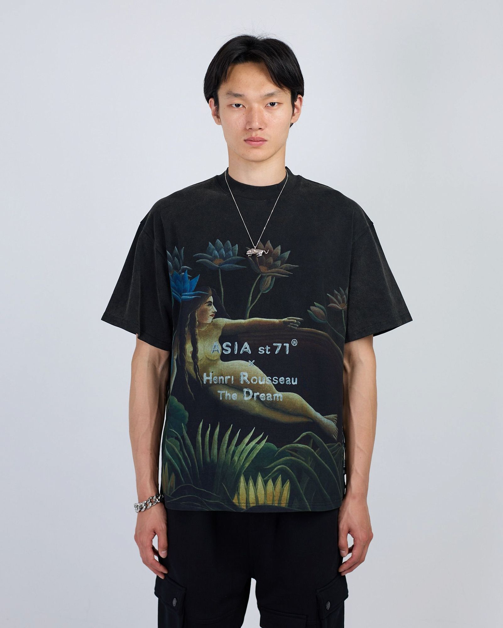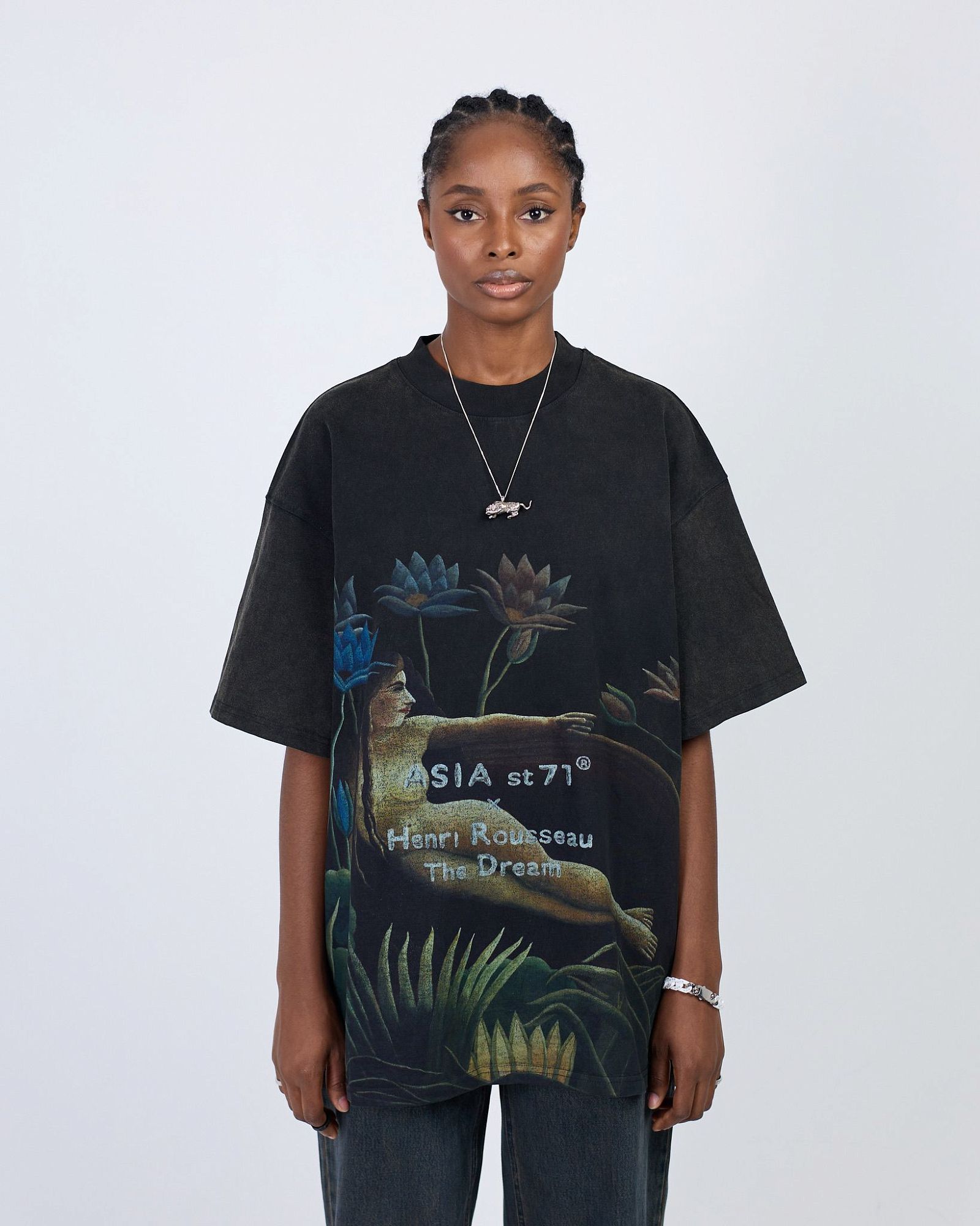 ФУТБОЛКА СВОБОДНОГО ПРЯМОГО КРОЯ С КАРТИНОЙ "THE TRIUMPH OF GALATEA" ВЫПОЛНЕНА ИЗ ПЛОТНОГО 380-GГ ХЛОПКА И ДЕРЖИТ ФОРМУ.