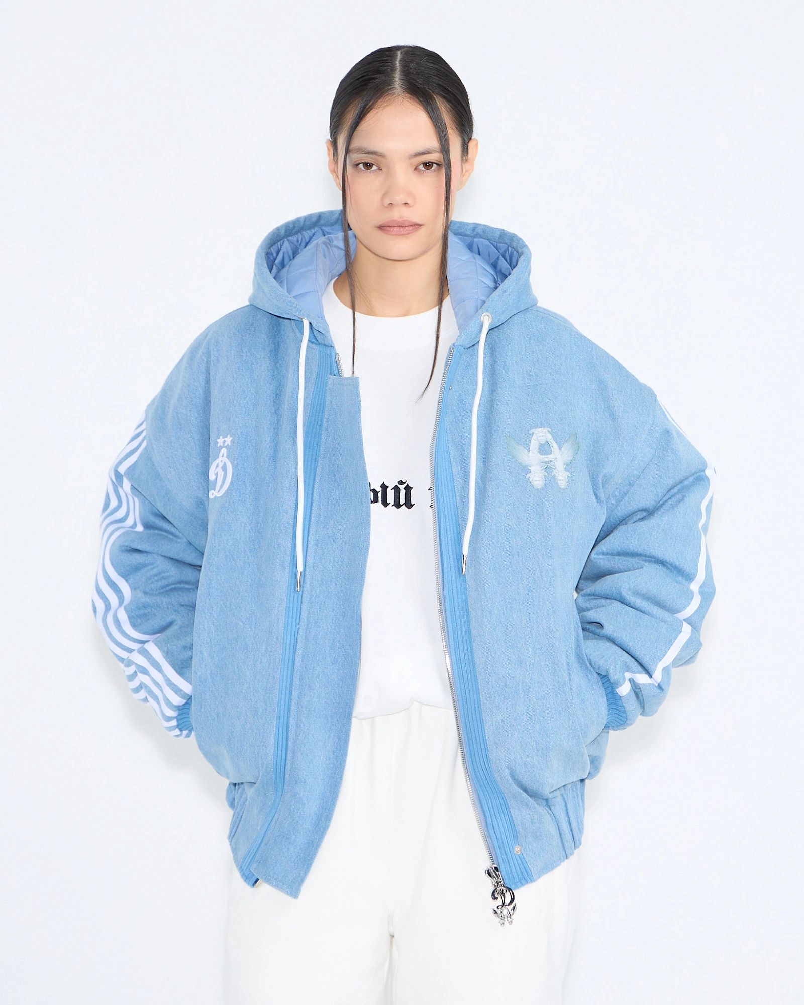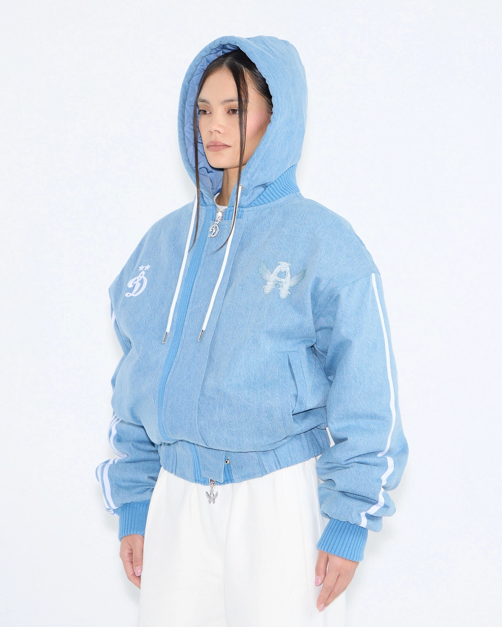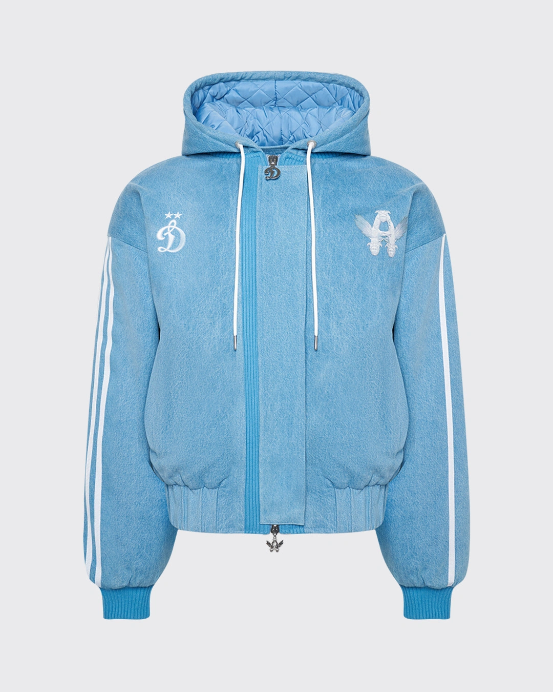 Бомбер из коллаборации ФК «Динамо» × ASIA ST 71. Объёмный силуэт, full длина, плотный материал, имитирующий деним и сохраняющий форму при носке, белые шнурки с металлическими эглетами, стальная молния с металлическими бегунками в виде символов «D» и «Flying A». По краю изделия и на рукавах плотные манжеты, внутри — утеплитель, а поверх молнии ветрозащитная планка.
