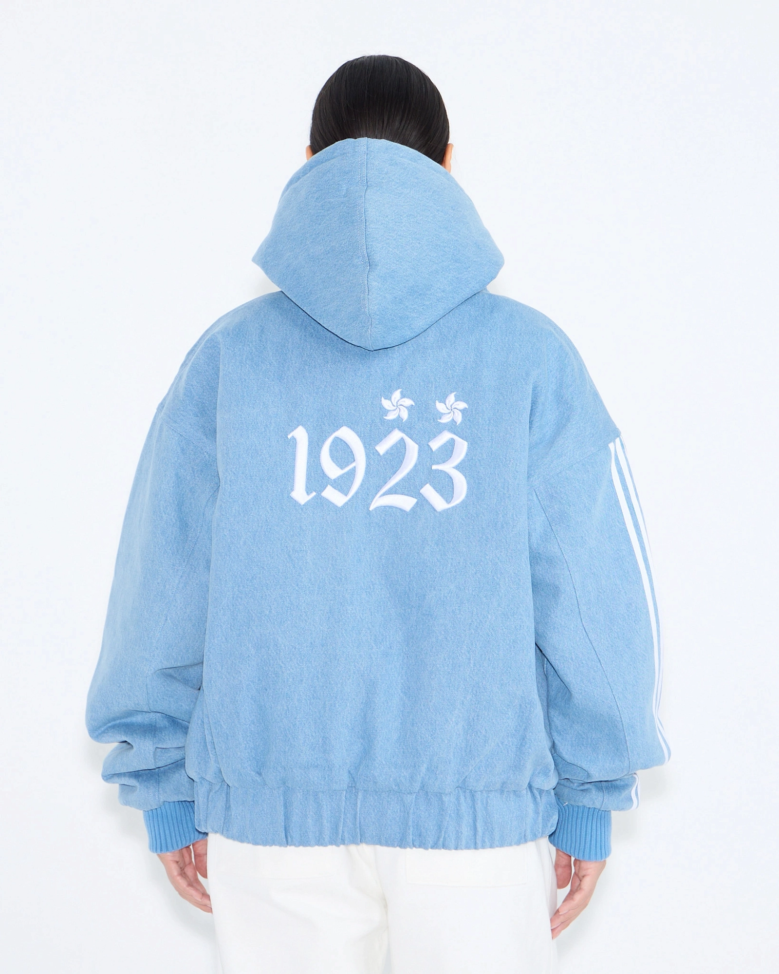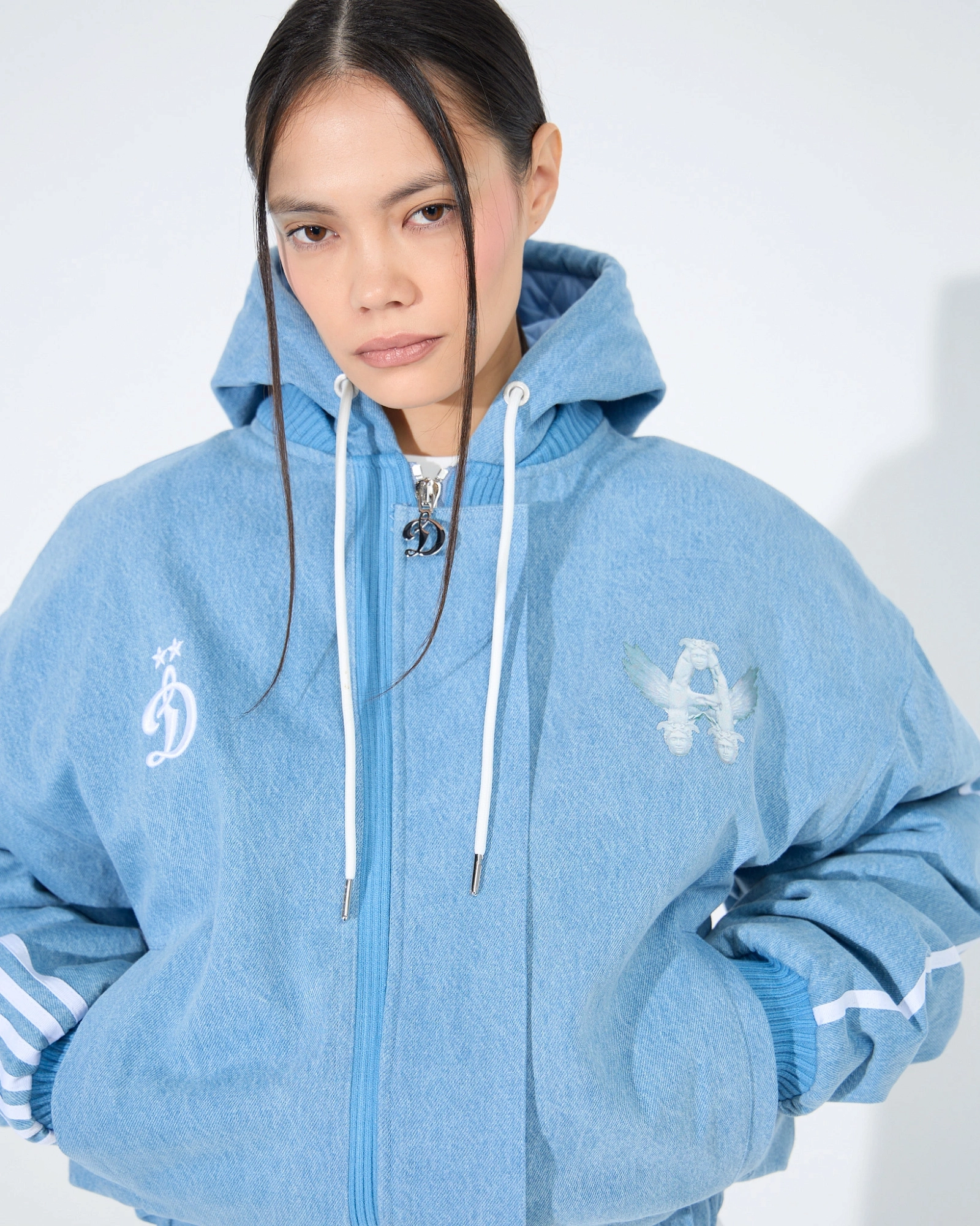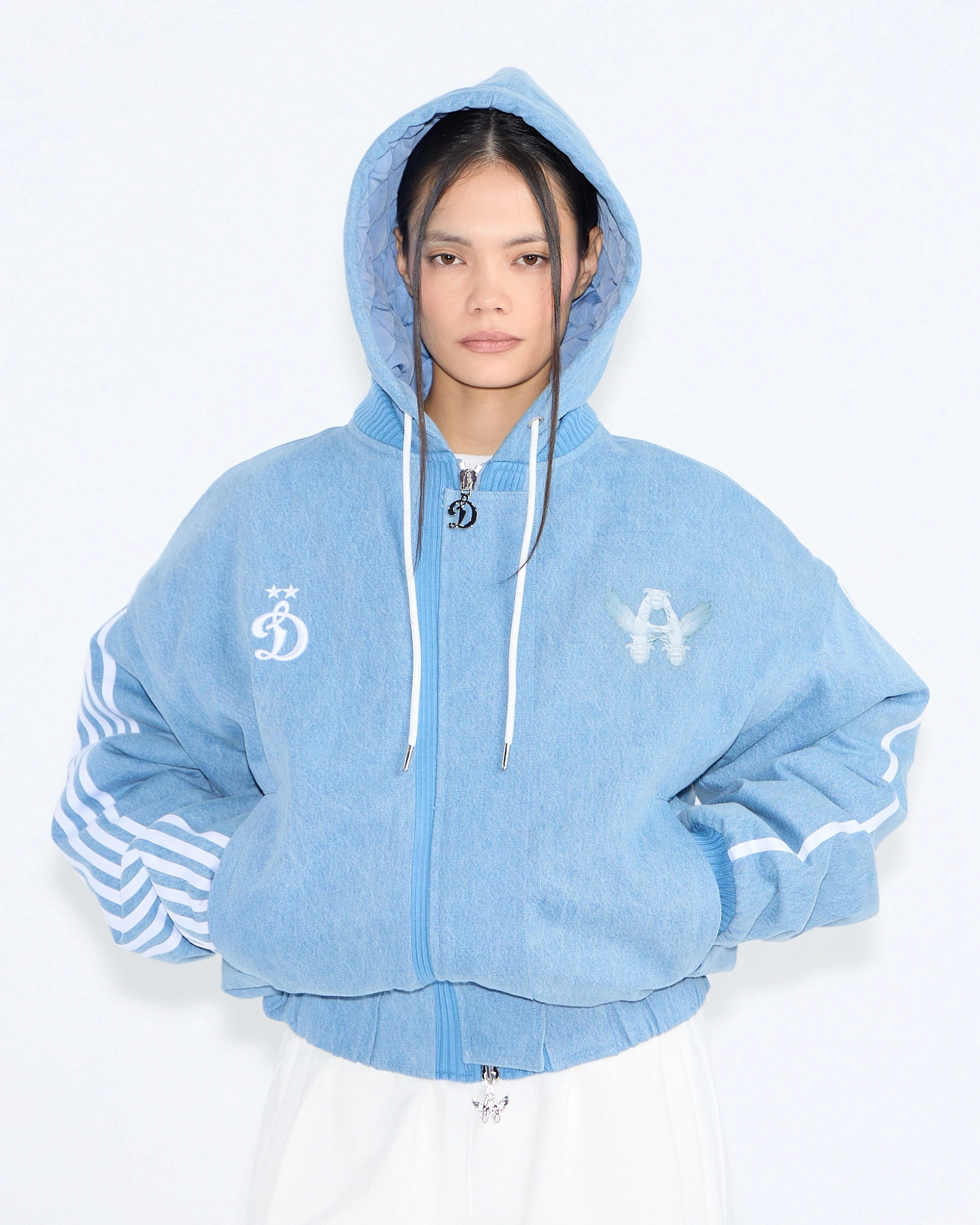 Бомбер из коллаборации ФК «Динамо» × ASIA ST 71. Объёмный силуэт, full длина, плотный материал, имитирующий деним и сохраняющий форму при носке, белые шнурки с металлическими эглетами, стальная молния с металлическими бегунками в виде символов «D» и «Flying A». По краю изделия и на рукавах плотные манжеты, внутри — утеплитель, а поверх молнии ветрозащитная планка.