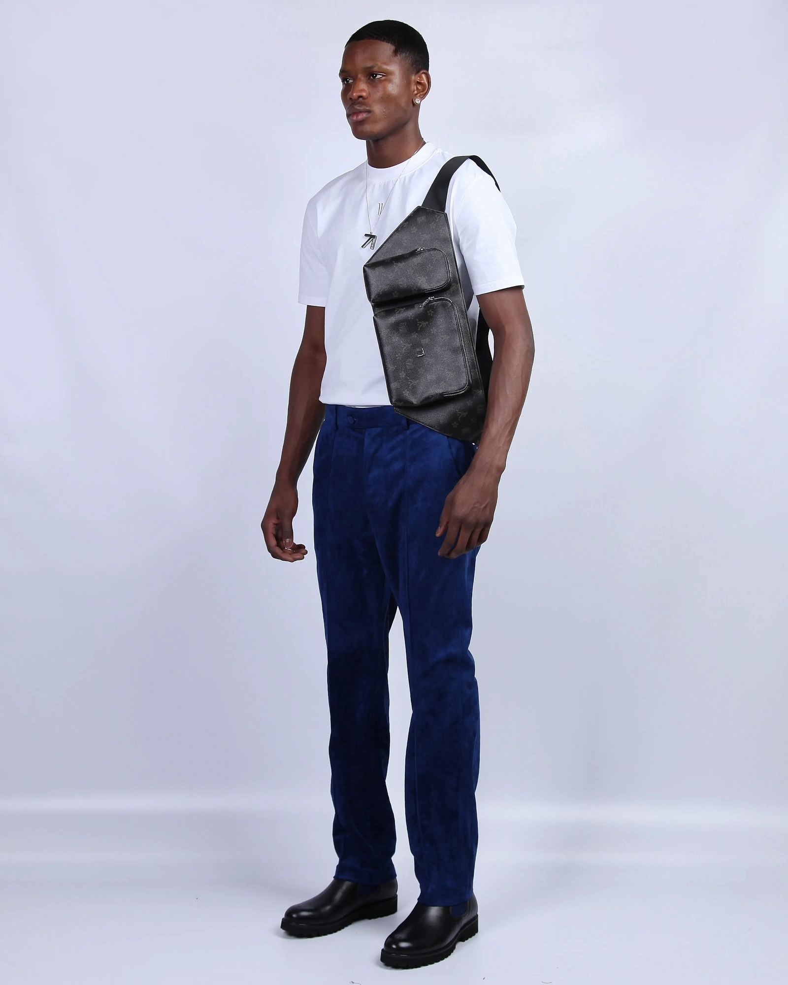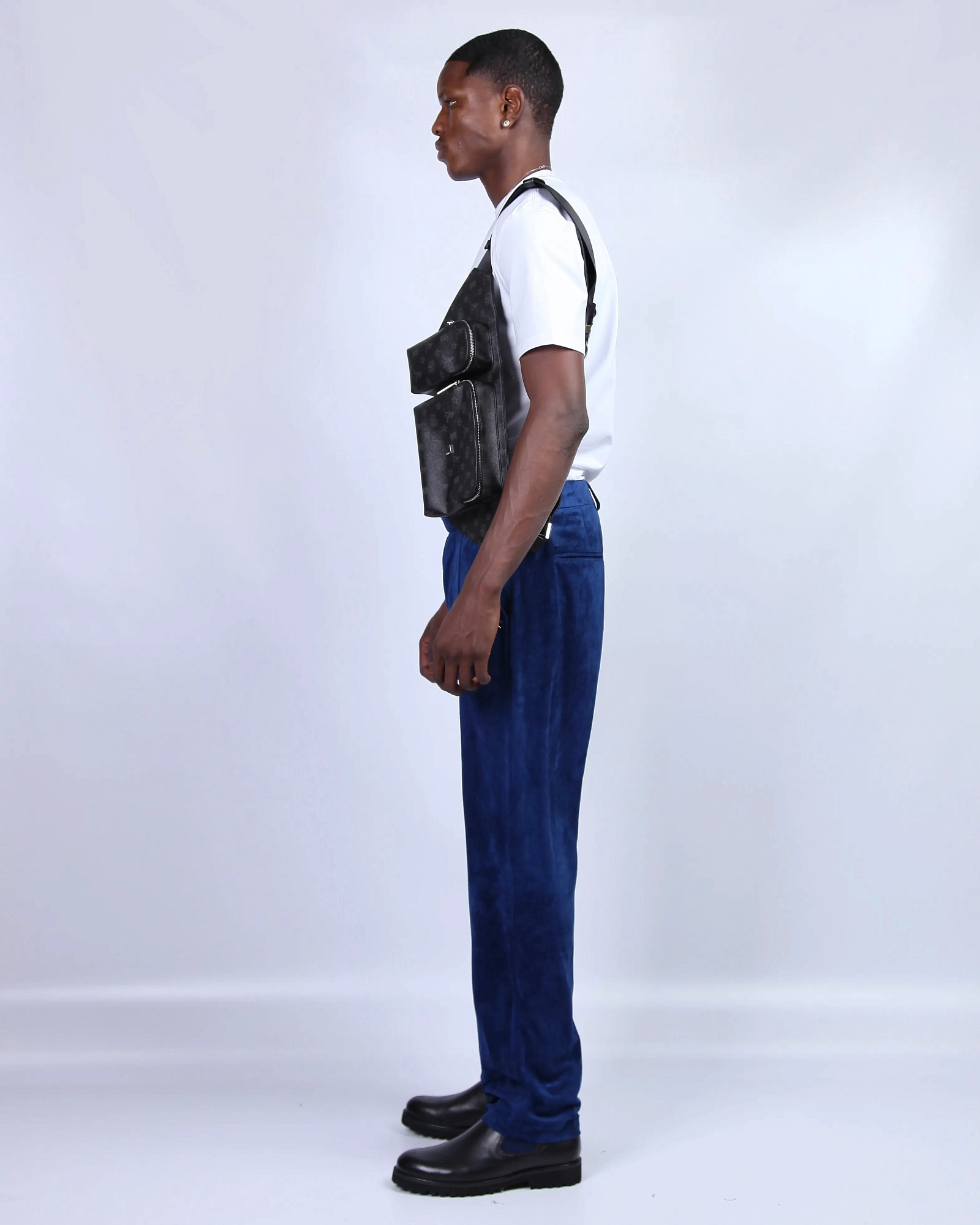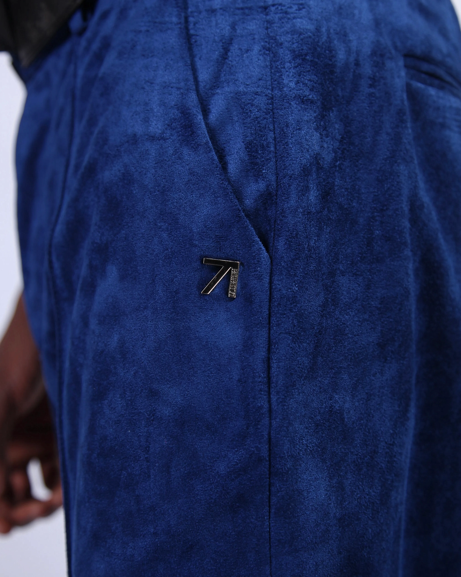 Брюки из классической коллекции с прямым кроем, выполненные из плотного велюра для максимального комфорта. Модель дополнена декоративными швами по передней части вдоль штанины, что придаёт ей стильный вид. Брендированная стальная стрелка расположена у левого кармана, добавляя изысканный акцент.