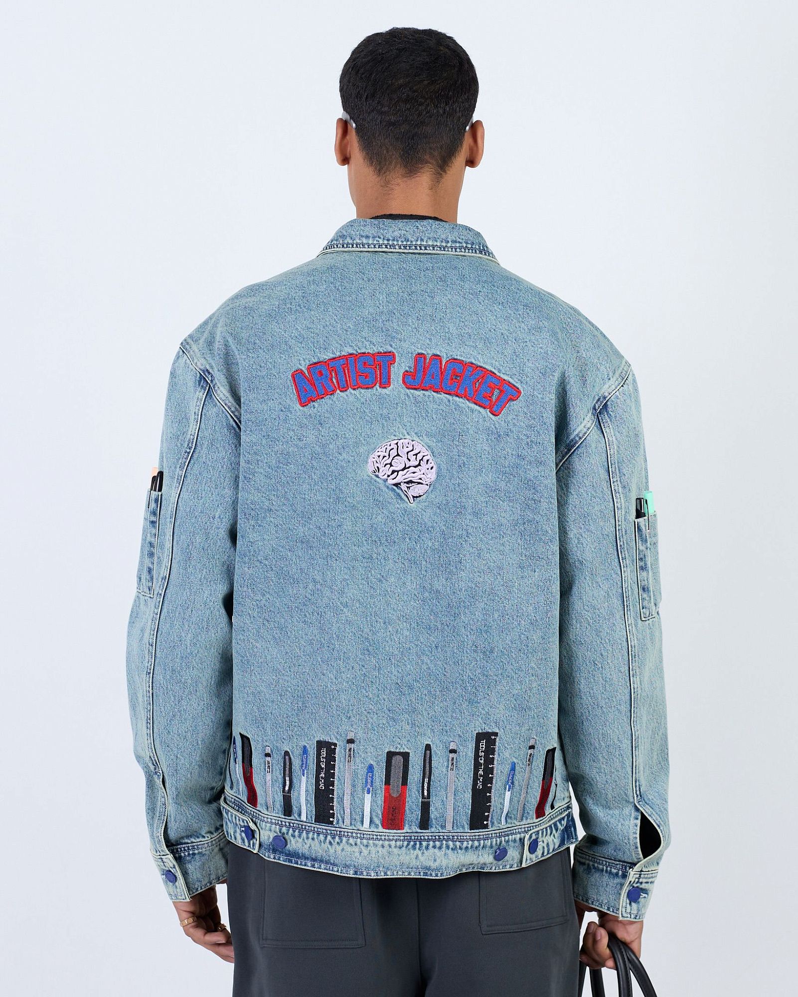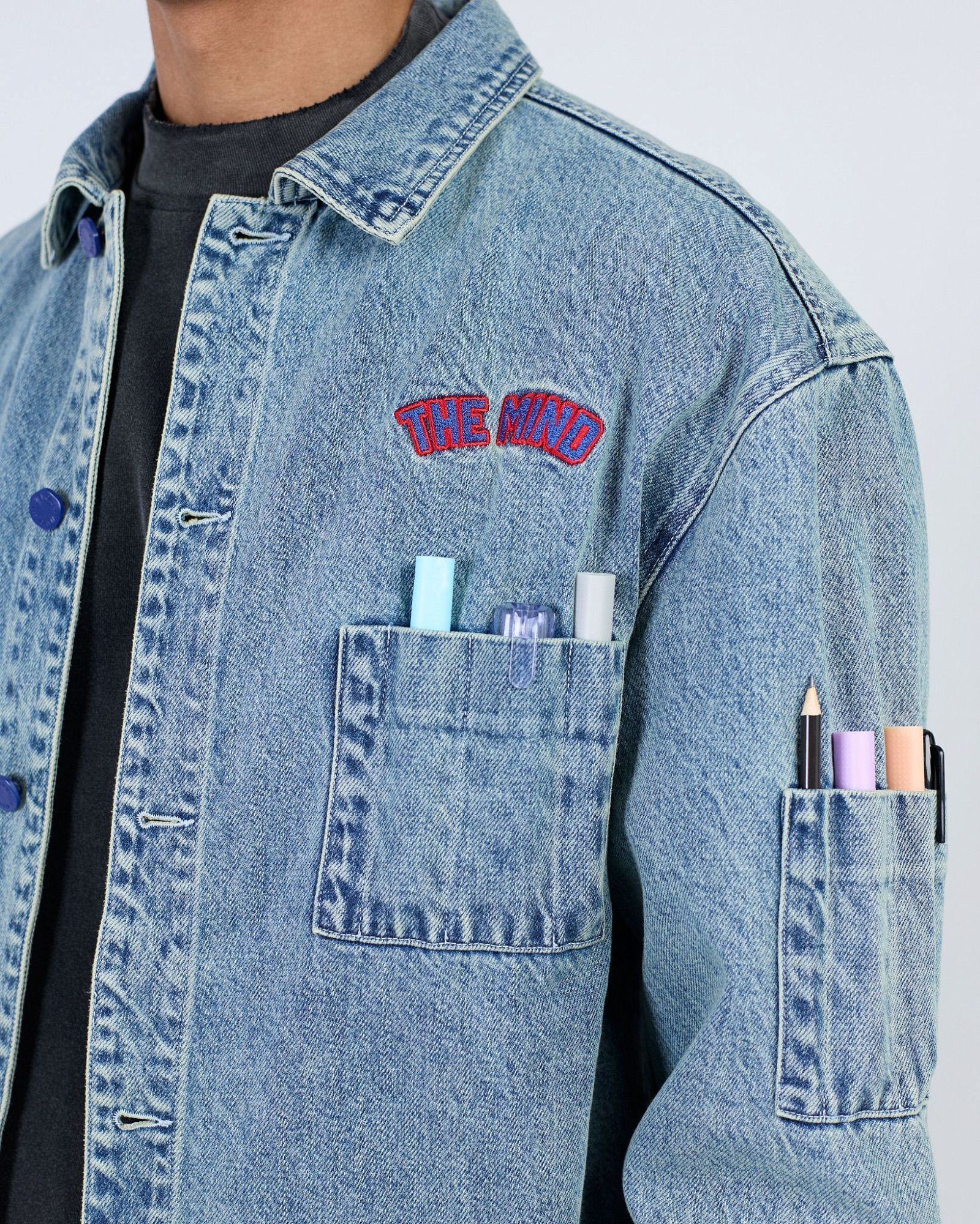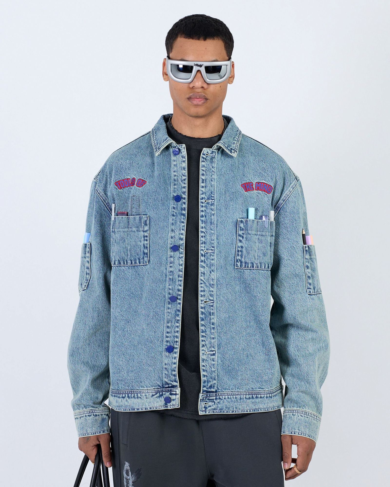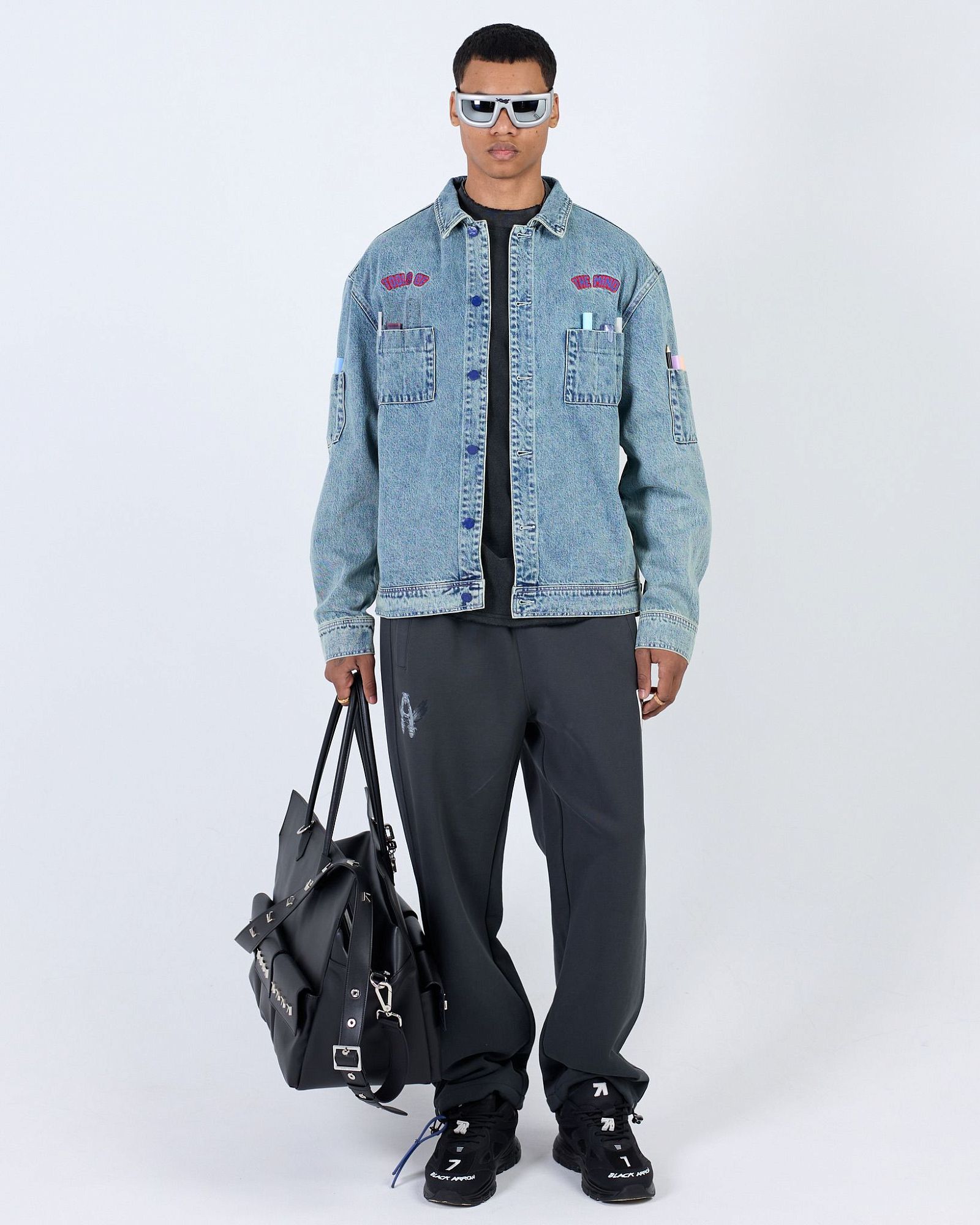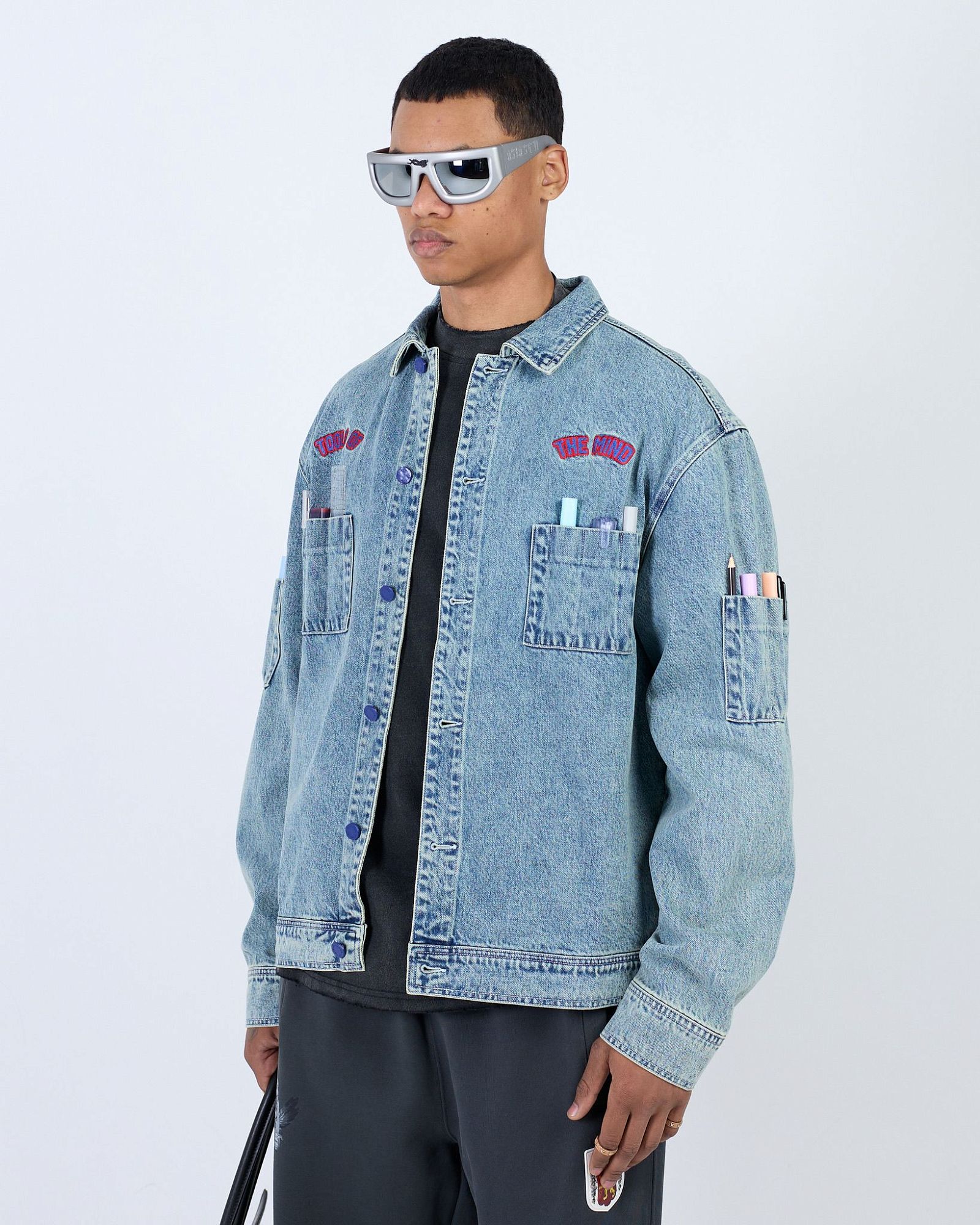 ОФИЦИАЛЬНАЯ КОЛЛАБОРАЦИЯ ASIA ST 71 X TAKE MY MUFFIN. ДЖИНСОВКА ПРЯМОГО СВОБОДНОГО КРОЯ ВЫПОЛНЕНА ИЗ ПЛОТНОГО ХЛОПКА, ДЕРЖИТ ФОРМУ. ЛОГОТИПЫ НАНЕСЕНЫ ПЛОСКОЙ МНОГОЦВЕТНОЙ ВЫШИВКОЙ, ИСПОЛЬЗОВАНА БРЕНДИРОВАННАЯ СТАЛЬНАЯ ФУРНИТУРА. ДЖИНСОВКА ИМЕЕТ ФАКТУРНЫЙ ОБЪЕМ НА РУКАВАХ И ГРУДИ, ВЫПОЛНЕННЫЙ В ТЕХНИКЕ EMBOSSING И ИМИТИРУЮЩИЙ КОСТЮМ МАЙОРА ПЭЙНА. МЫ ПРЕДЛАГАЕМ СОЧЕТАТЬ АЙТЕМ С ДРУГИМ ДЕНИМОМ В ЭТОМ ЖЕ ЦВЕТЕ КАК TOTAL LOOK ИЛИ ВЫБРАТЬ ЯРКИЕ ЦВЕТА ДЛЯ КОНТРАСТНОГО ЯРКОГО ОБРАЗА."
