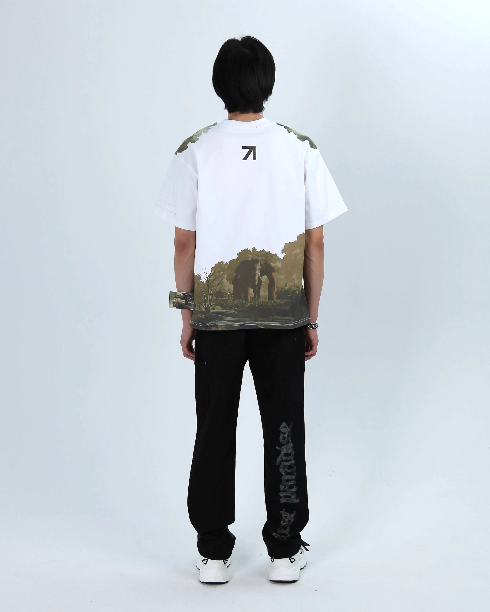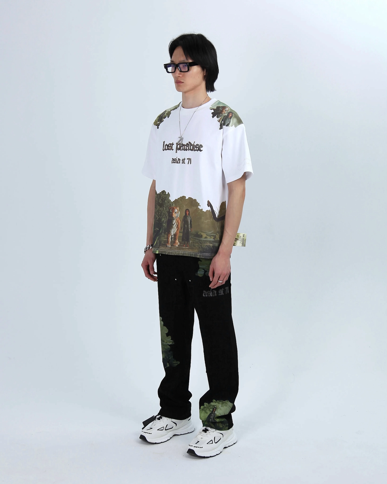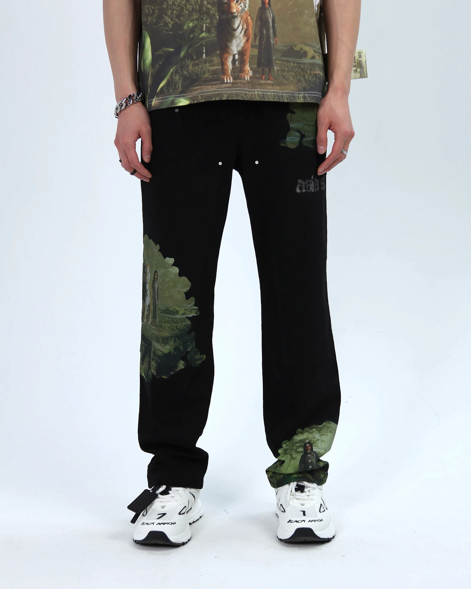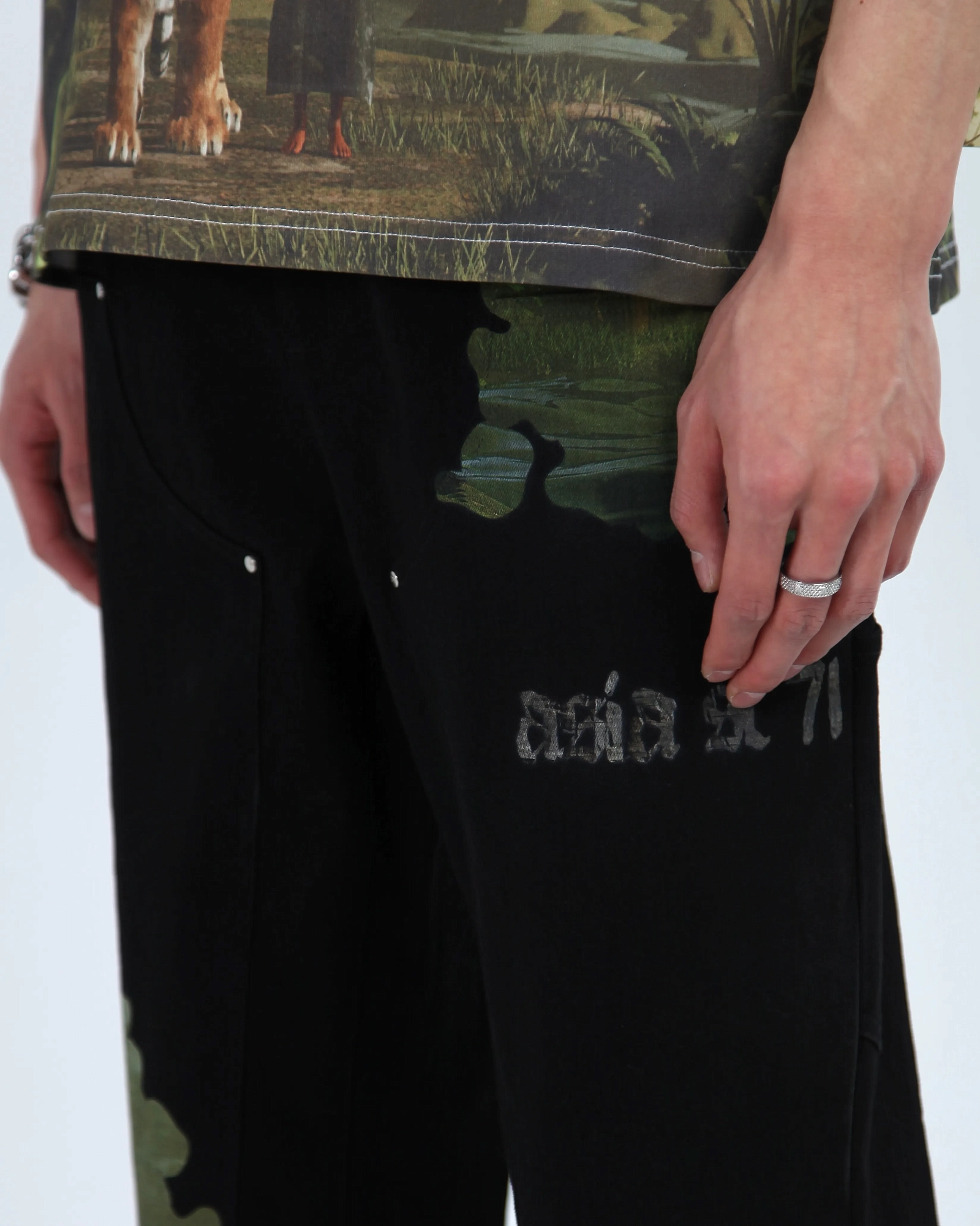 WASHED. СПУЩЕННЫЙ ПЛЕЧЕВОЙ ШОВ, МОЛНИЯ ПОД ЗАКРЫТОЙ ПЛАНКОЙ И КЛАССИЧЕСКИЕ ЛАЦКАНЫ. ПРИНТ НАНЕСЕН ЛАЗЕРНОЙ ПЕЧАТЬЮ И ПАТЧАМИ. БРЕНДИРОВАННАЯ СТАЛЬНАЯ ФУРНИТУРА.