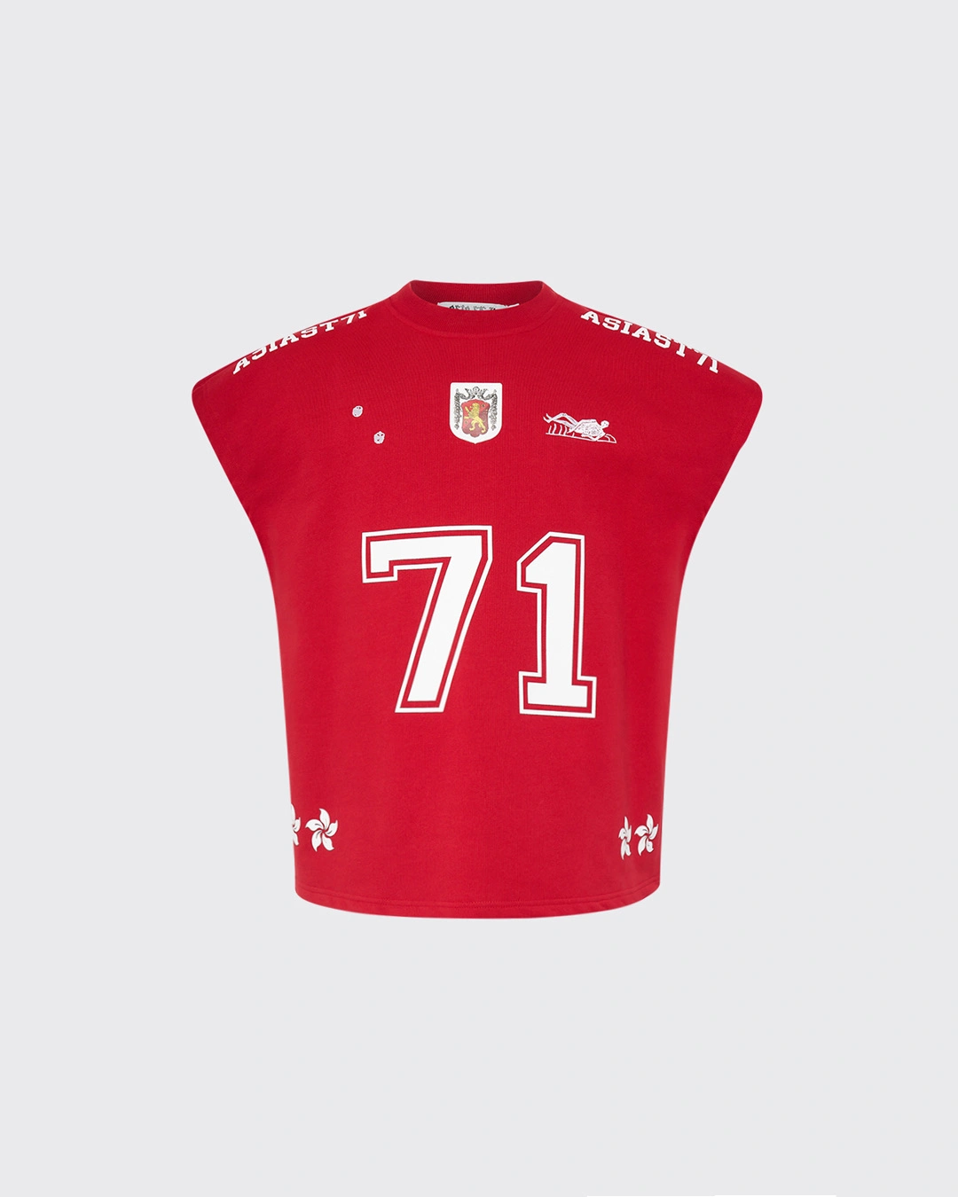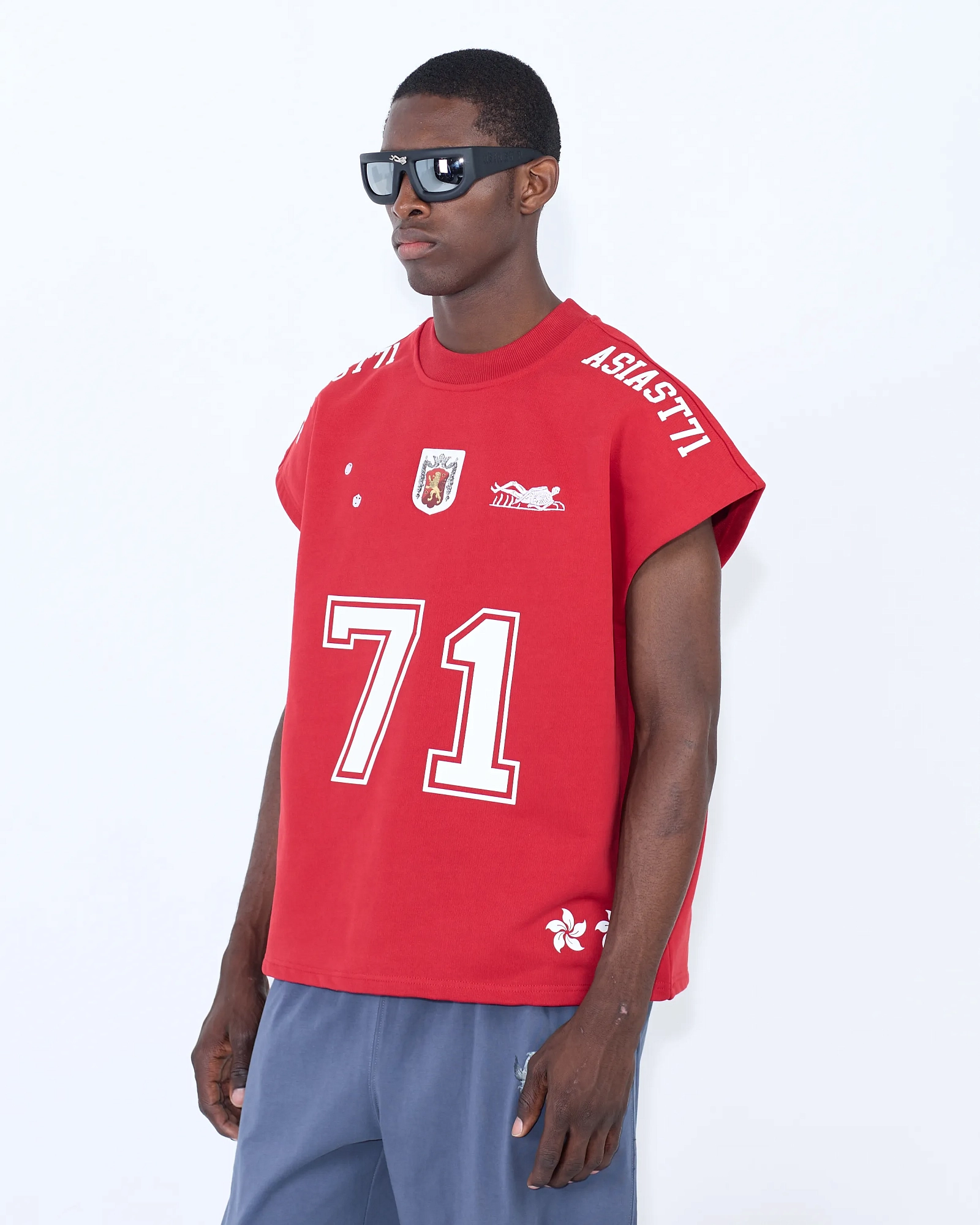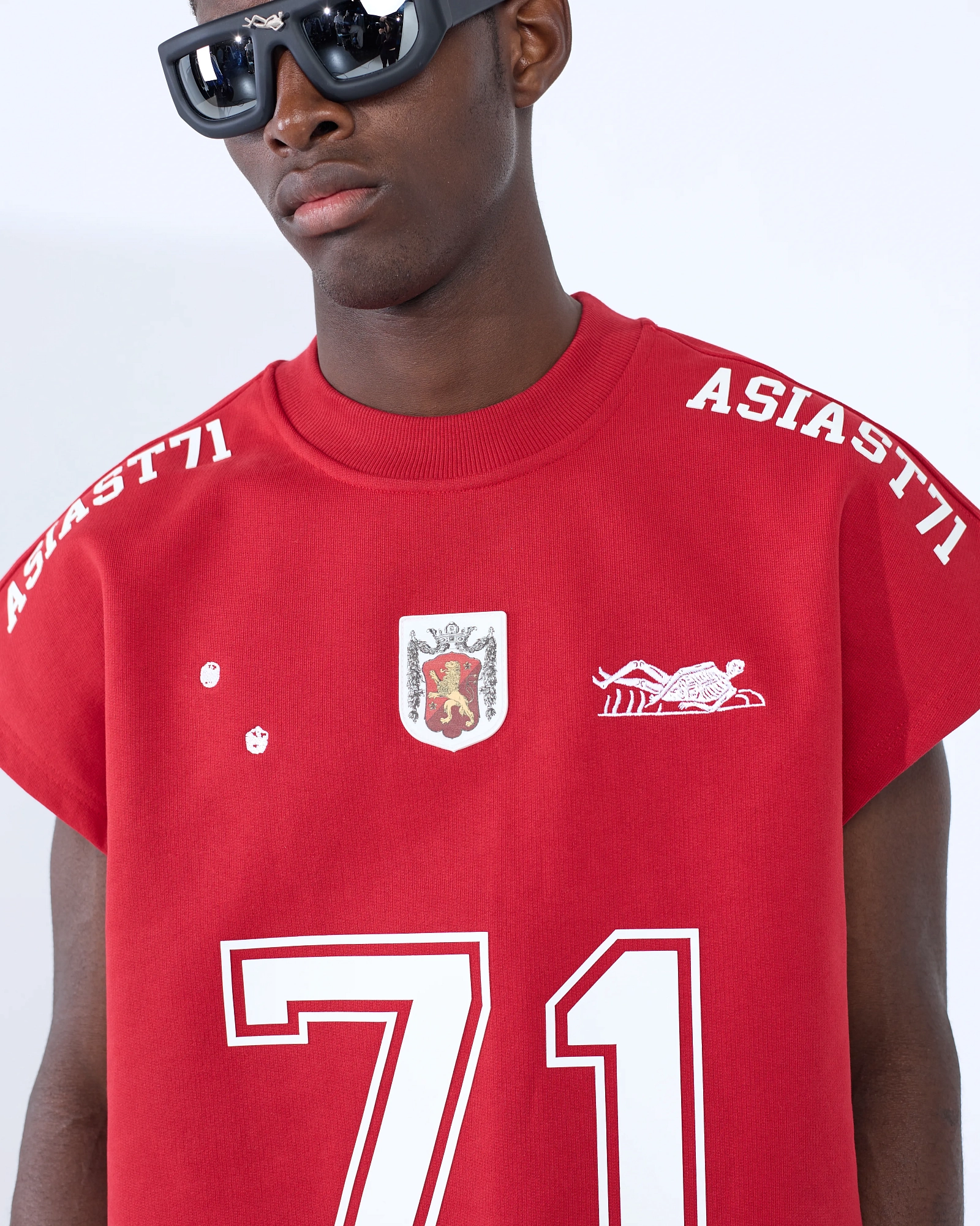 ОВЕРСАЙЗ-ТОП В СТИЛИСТИКЕ СПОРТИВНОЙ ФОРМЫ: ПЛОТНЫЙ ХЛОПКОВЫЙ ТРИКОТАЖ, РЕБРИСТАЯ КРУГЛАЯ ГОРЛОВИНА, ШИРОКАЯ ПЛЕЧЕВАЯ ЛИНИЙ И ГЛУБОКИЕ ПРОЙМЫ С ВОЗМОЖНОСТЬЮ НАДЕТЬ ТОП НА ЛОНГСЛИВ. КРУПНЫЙ ЛОГО «71» ПО ЦЕНТРУ, ФИРМЕННЫЕ НАДПИСИ НА ПЛЕЧАХ, ШЕВРОН-ГЕРБ И МЕЛКИЕ СИМВОЛЫ КАК НАШИВКИ КОМАНДЫ. СОЧЕТАЙТЕ С НЕЙЛОНОВЫМИ ШОРТАМИ, ДЖОГГЕРАМИ И ДЕНИМОМ."
