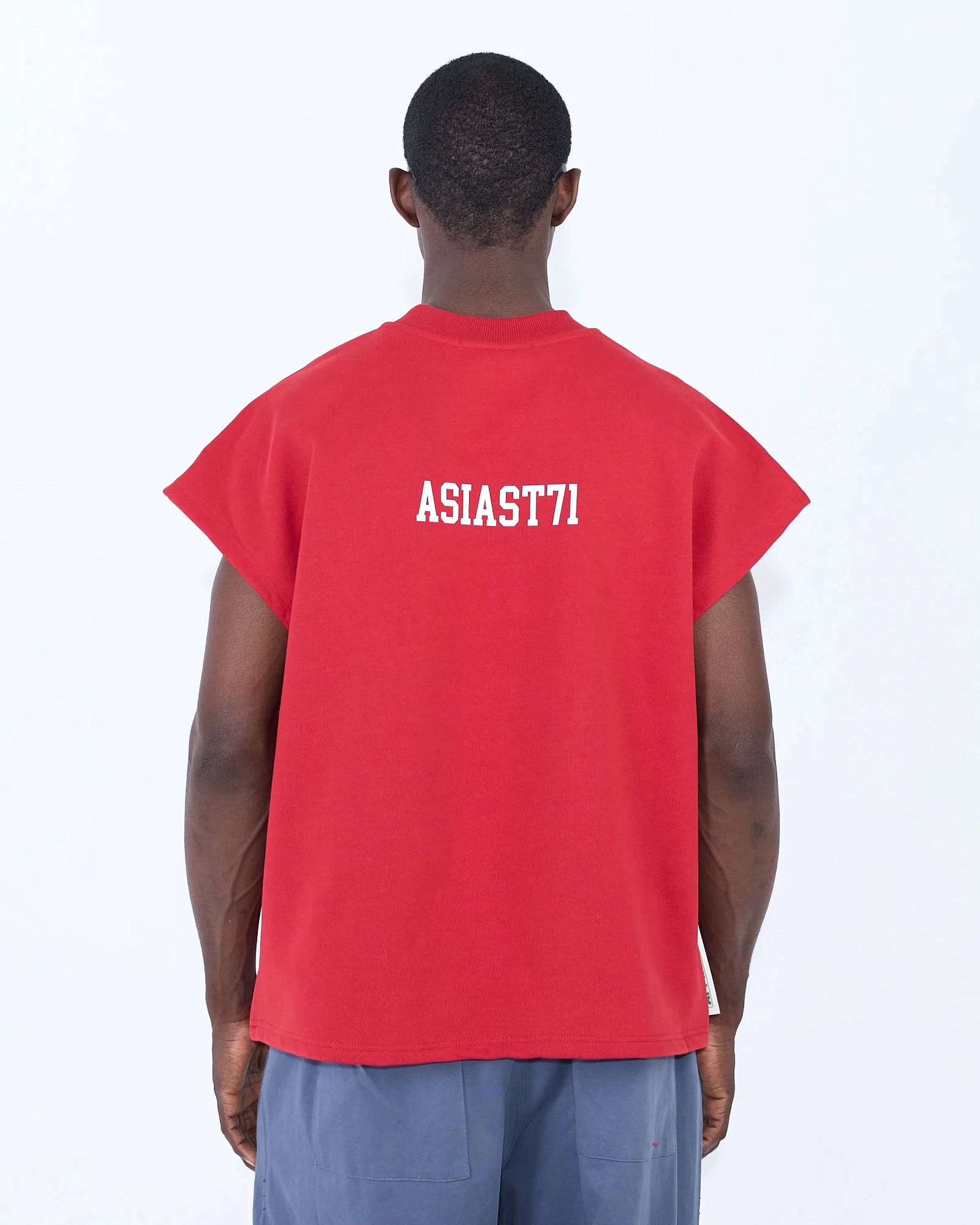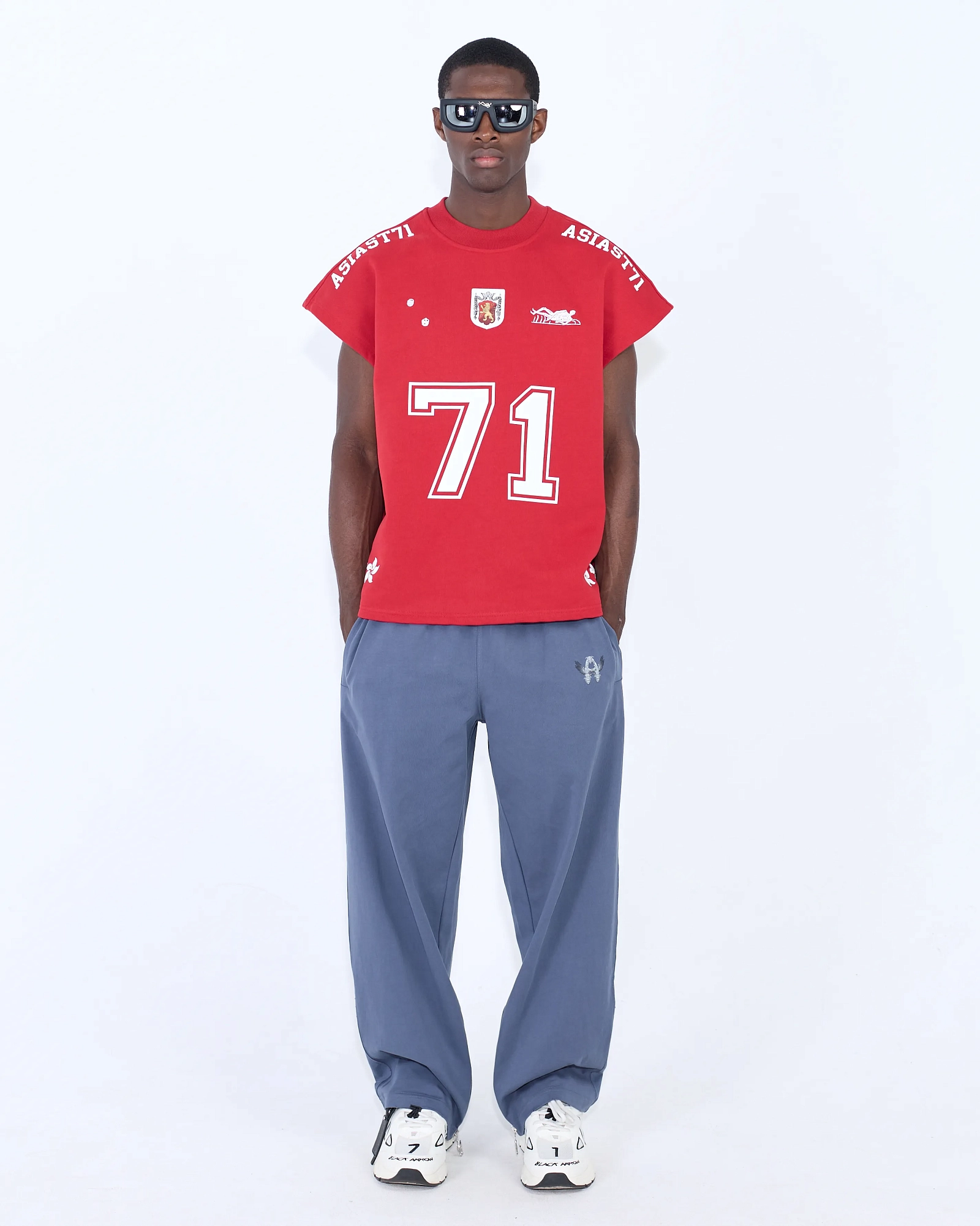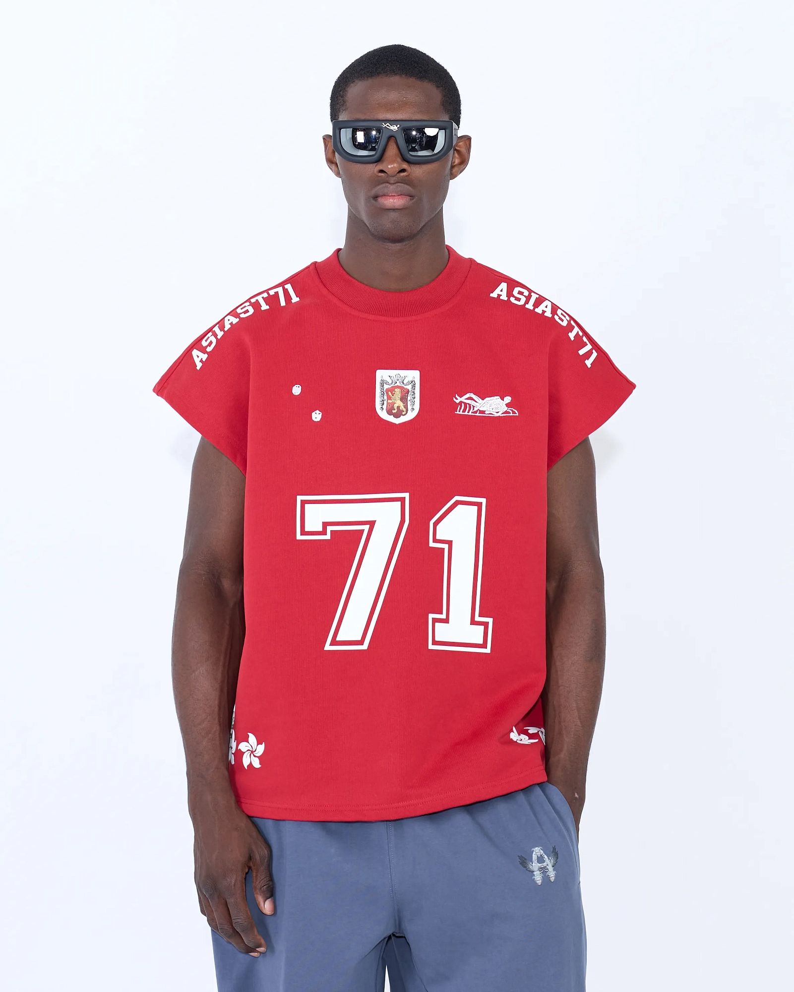 ОВЕРСАЙЗ-ТОП В СТИЛИСТИКЕ СПОРТИВНОЙ ФОРМЫ: ПЛОТНЫЙ ХЛОПКОВЫЙ ТРИКОТАЖ, РЕБРИСТАЯ КРУГЛАЯ ГОРЛОВИНА, ШИРОКАЯ ПЛЕЧЕВАЯ ЛИНИЙ И ГЛУБОКИЕ ПРОЙМЫ С ВОЗМОЖНОСТЬЮ НАДЕТЬ ТОП НА ЛОНГСЛИВ. КРУПНЫЙ ЛОГО «71» ПО ЦЕНТРУ, ФИРМЕННЫЕ НАДПИСИ НА ПЛЕЧАХ, ШЕВРОН-ГЕРБ И МЕЛКИЕ СИМВОЛЫ КАК НАШИВКИ КОМАНДЫ. СОЧЕТАЙТЕ С НЕЙЛОНОВЫМИ ШОРТАМИ, ДЖОГГЕРАМИ И ДЕНИМОМ."