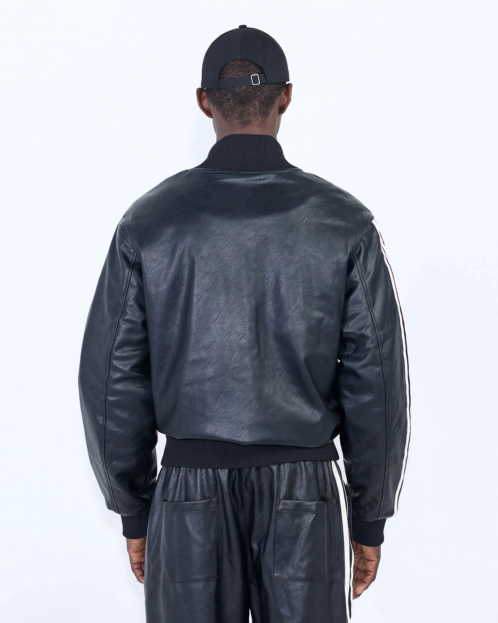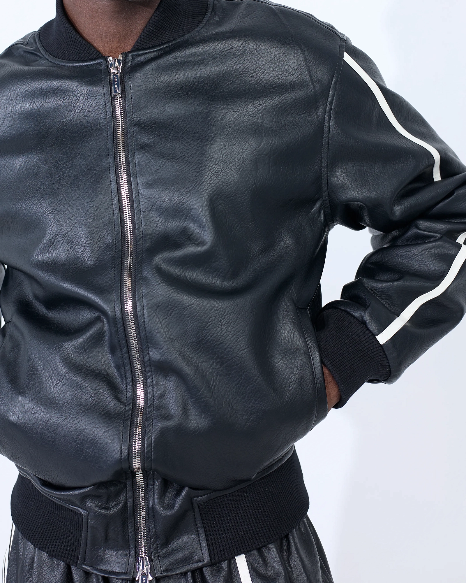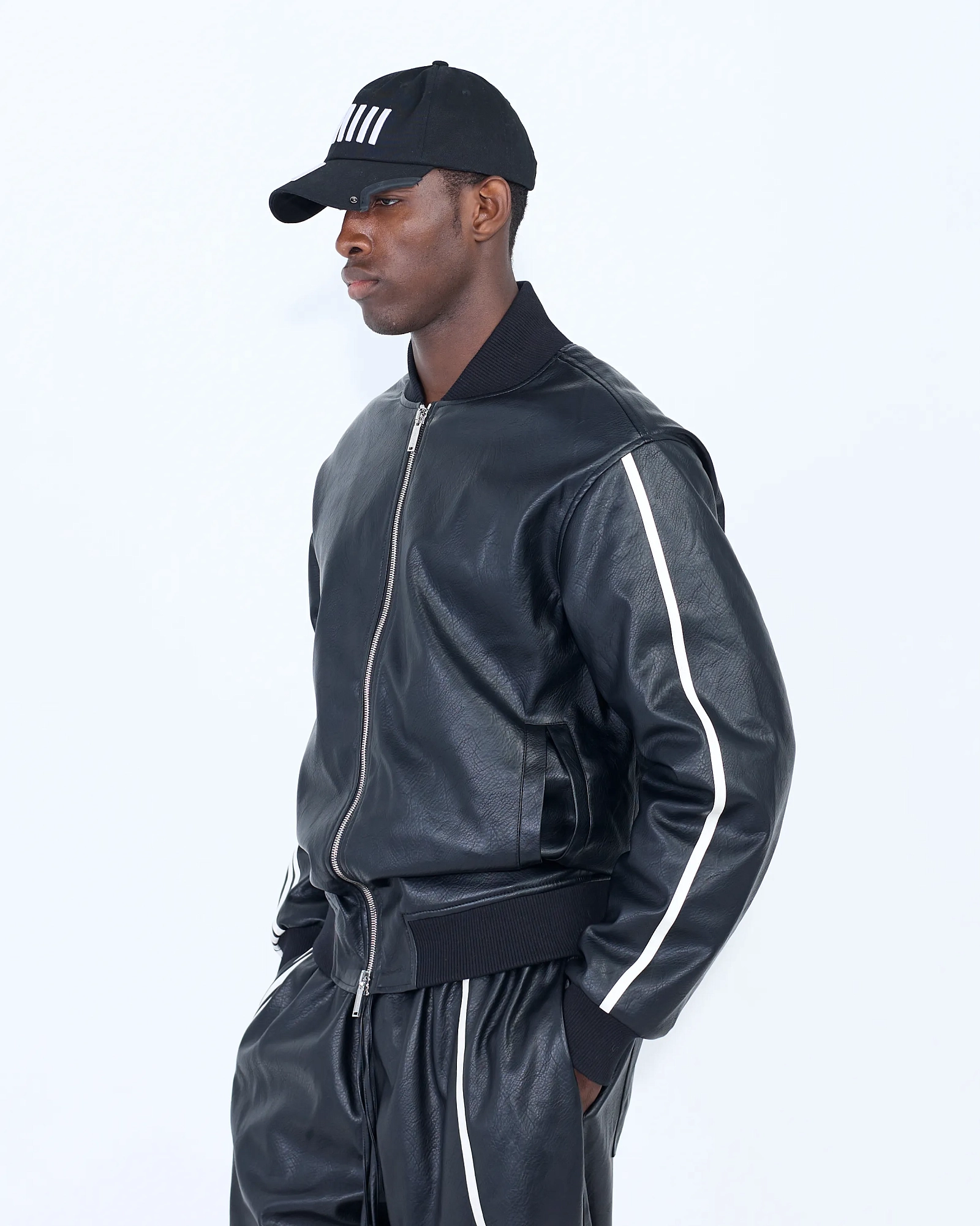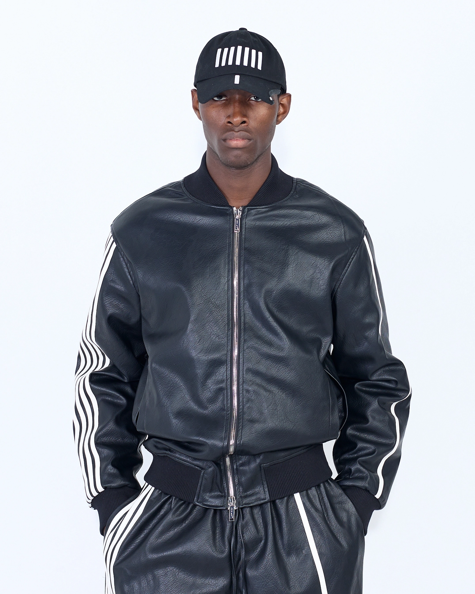 БРЮКИ STRIPES ВЫПОЛНЕНЫ ИЗ МЯГКОЙ ЭКОКОЖИ С МАТОВОЙ ФАКТУРОЙ. ПРЯМОЙ КРОЙ И ЭЛАСТИЧНЫЙ ПОЯС НА КУЛИСКЕ. КОНТРАСТНЫЕ ЛАМПАСЫ ВИЗУАЛЬНО ВЫТЯГИВАЮТ СИЛУЭТ И ПРИДАЮТ МОДЕЛИ СПОРТИВНЫЙ АКЦЕНТ. БРЮКИ МОЖНО НОСИТЬ С КУРТКОЙ ОТ КОМПЛЕКТА ДЛЯ СОЗДАНИЯ ЦЕЛЬНОГО ОБРАЗА."