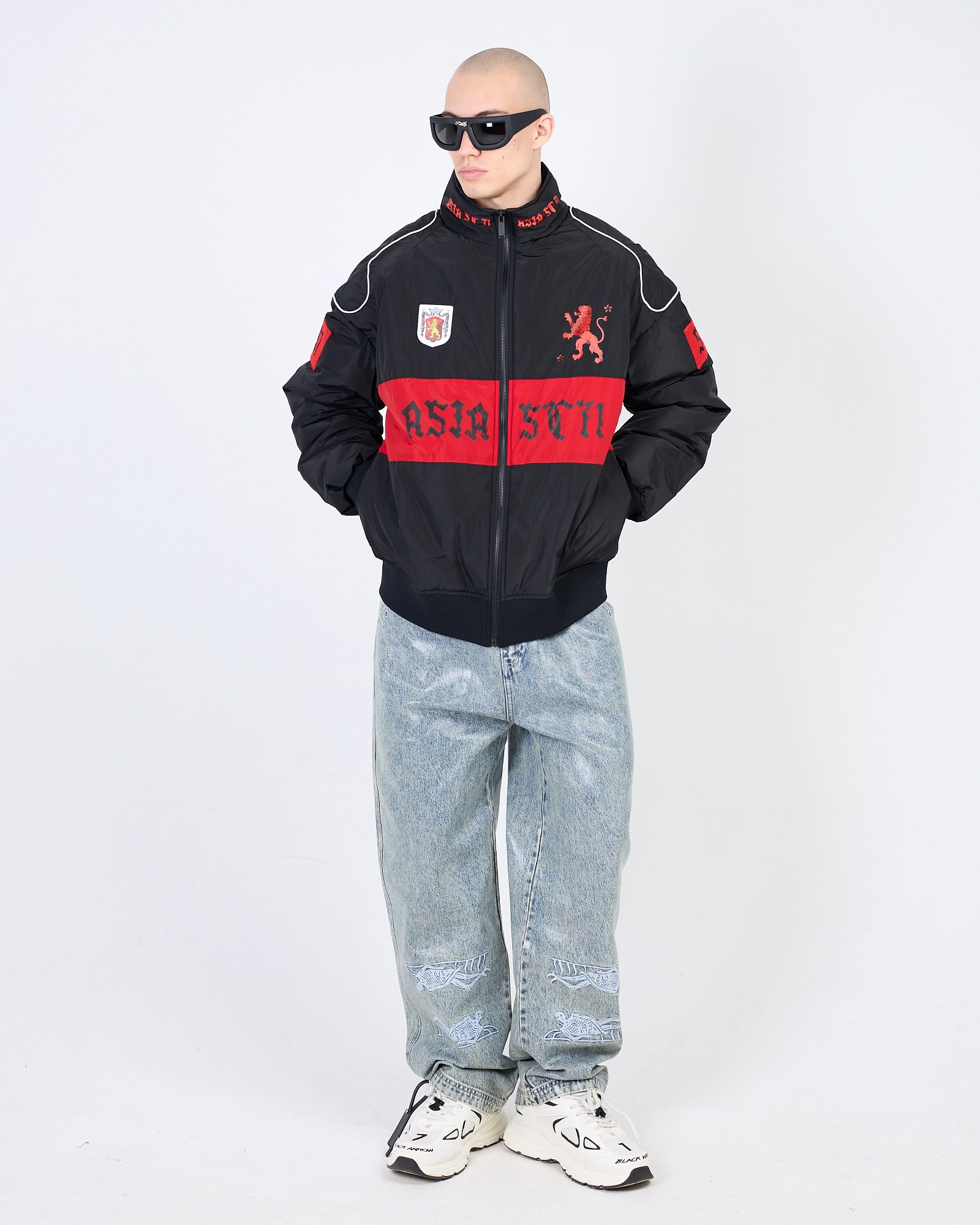 КЛАССИЧЕСКИЕ БРЮКИ В ТОНКУЮ ПОЛОСКУ — С ДЕРЗКИМ КОНСТРУКТИВНЫМ АКЦЕНТОМ. ПРЯМОЙ КРОЙ СОЧЕТАЕТСЯ С ПРОРЕЗЯМИ В НА КОЛЕНЯХ, СОЗДАВАЯ КОНТРАСТ МЕЖДУ ТРАДИЦИОННОЙ ФОРМОЙ БРЮК И STREETWEAR ЭСТЕТИКОЙ. СТРЕЛКИ И СТРОГИЙ ПОЯС С ПРЯЖКОЙ ПОДЧЕРКИВАЮТ ЛАКОНИЧНУЮ СТИЛИСТИКУ. ЗАВЕРШАЕТ ОБРАЗ МЕТАЛЛИЧЕСКАЯ БРОШЬ FLYING A.