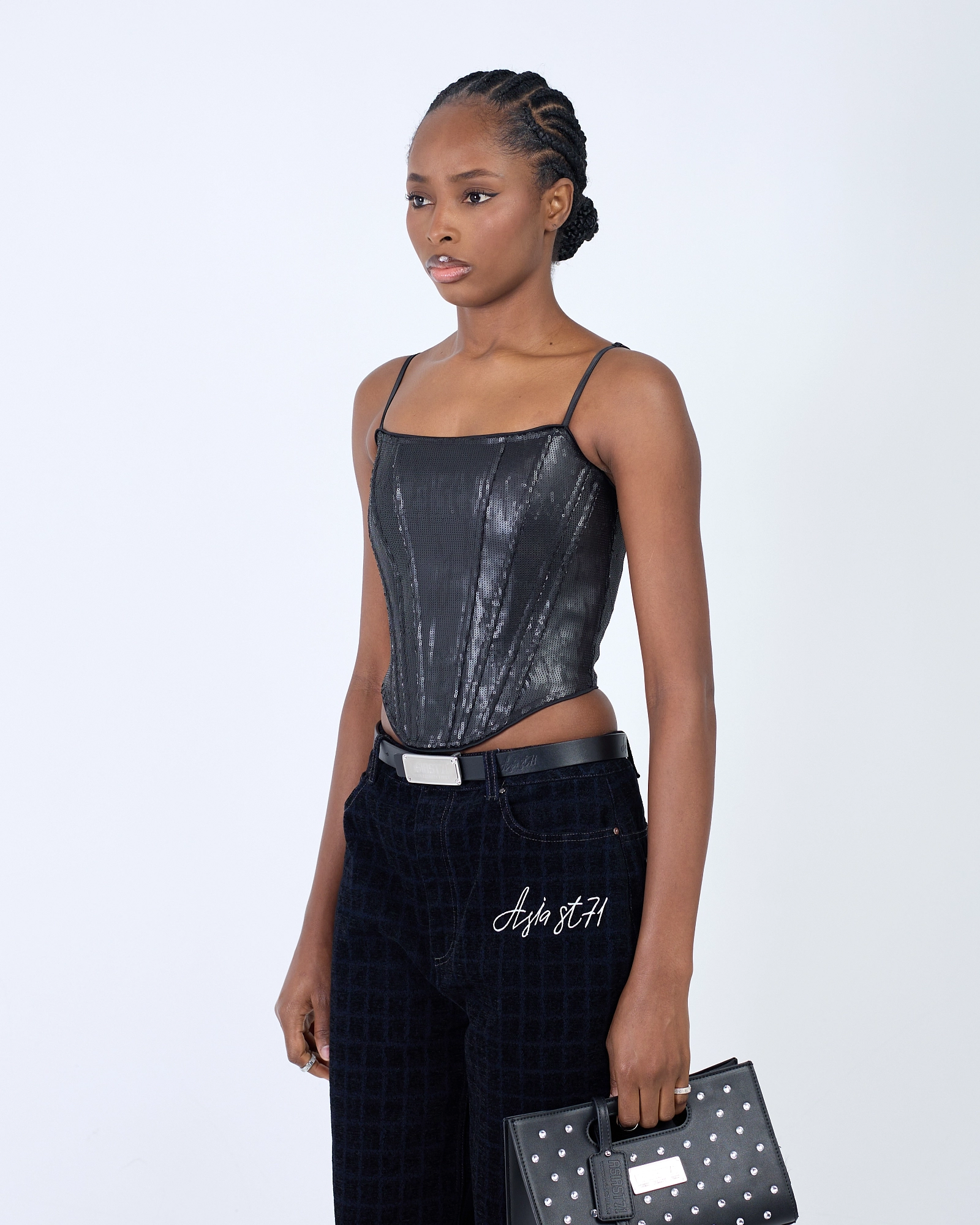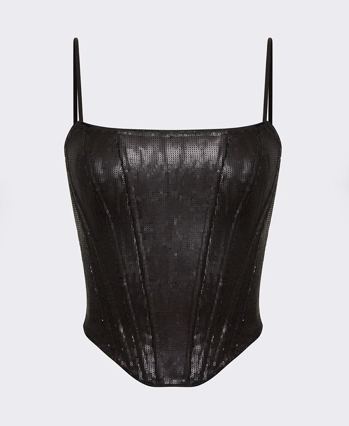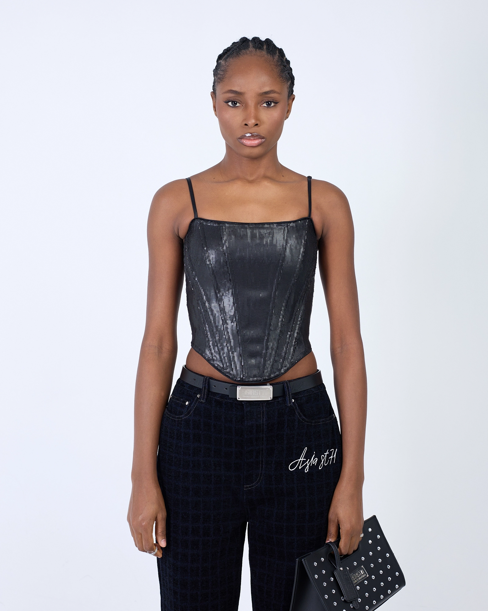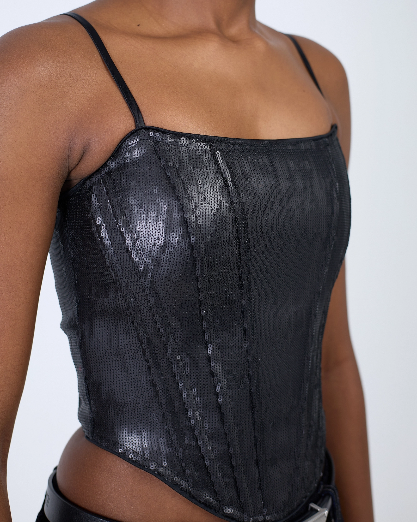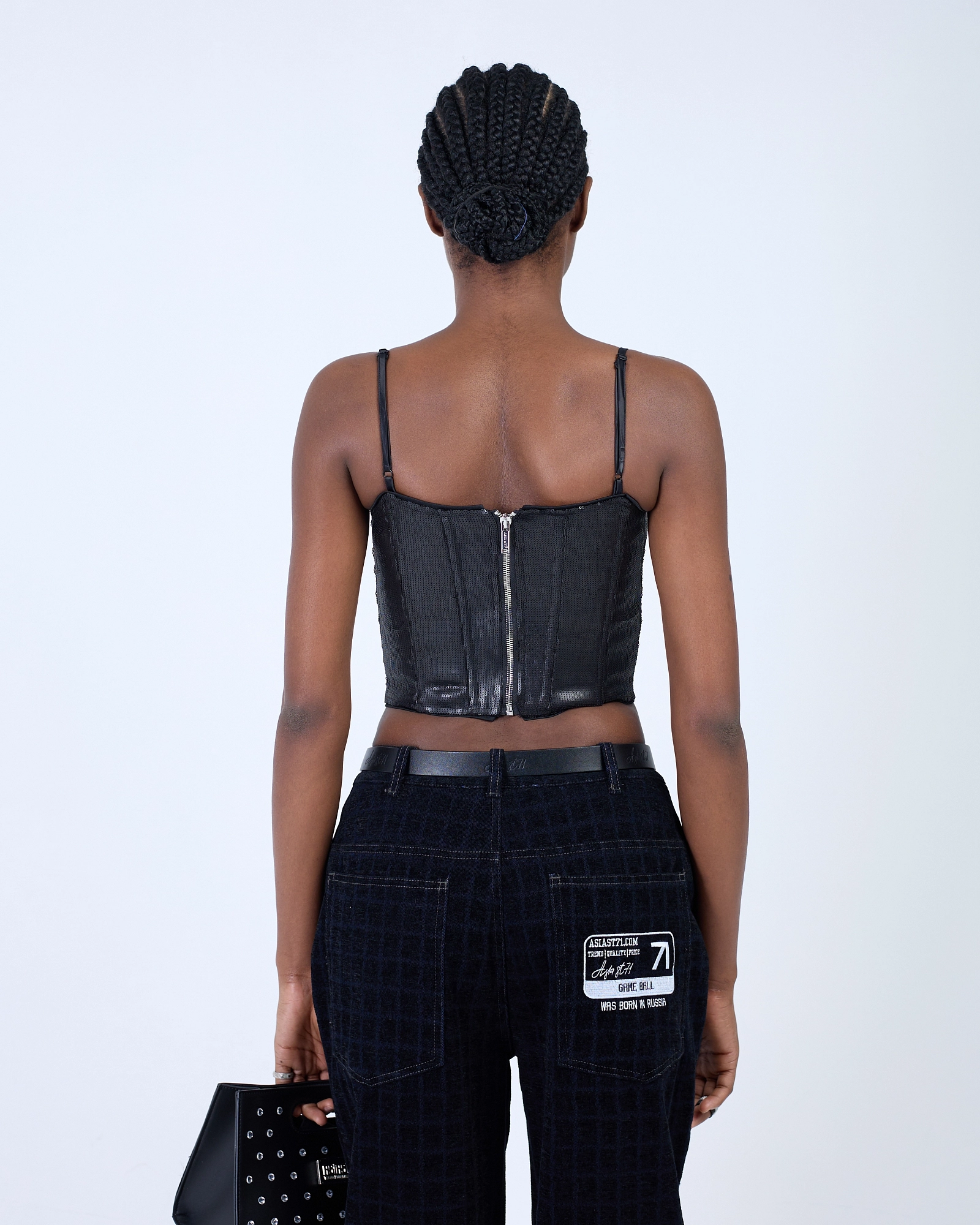ТОП ВЫПОЛНЕН ИЗ ЖАТОЙ ТКАНИ. МОДЕЛЬ МОДЕЛИРУЮЩАЯ ФИГУРУ ЗА СЧЕТ ЭЛЕМЕНТОВ КОРСЕТА И АКЦЕНТНЫХ РУКАВОВ - ФОНАРИКОВ. ВЫРЕЗ НА ГРУДИ И ШНУРОВКА НА ШЕЕ ПОЗВОЛЯЮТ РЕГУЛИРОВАТЬ ПОСАДКУ ТОПА ПО ФИГУРЕ. АКЦЕНТ В ВИДЕ ШИПОВ ПОДЧЕРКНЕТ ВАШ ОБРАЗ."