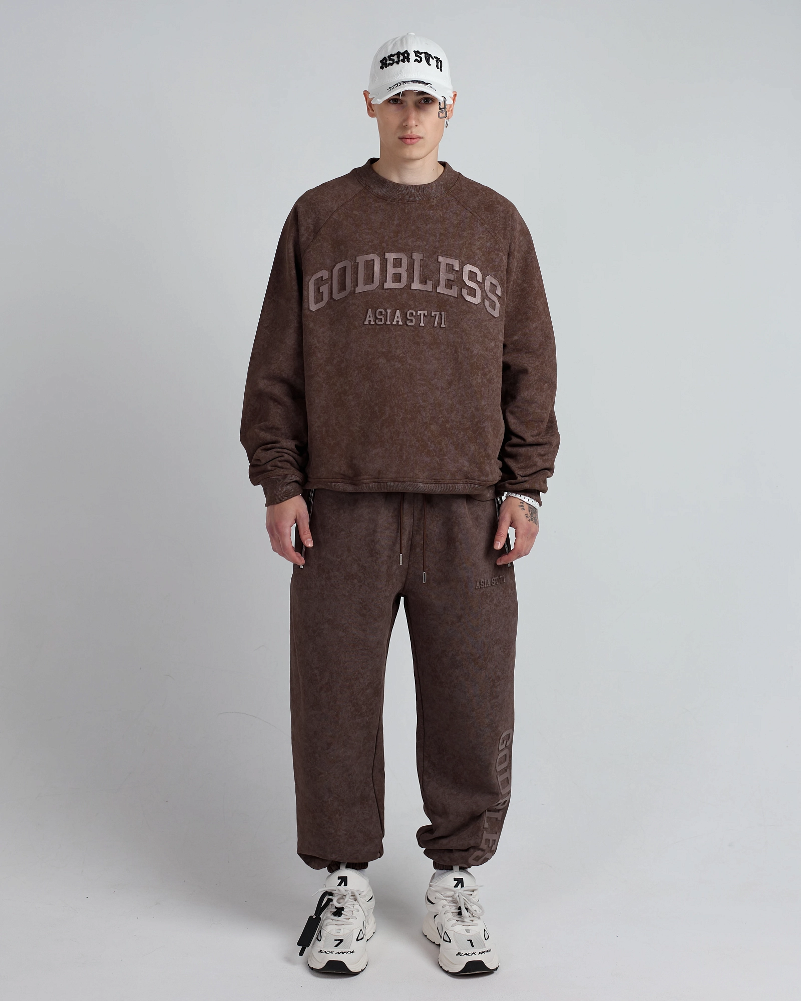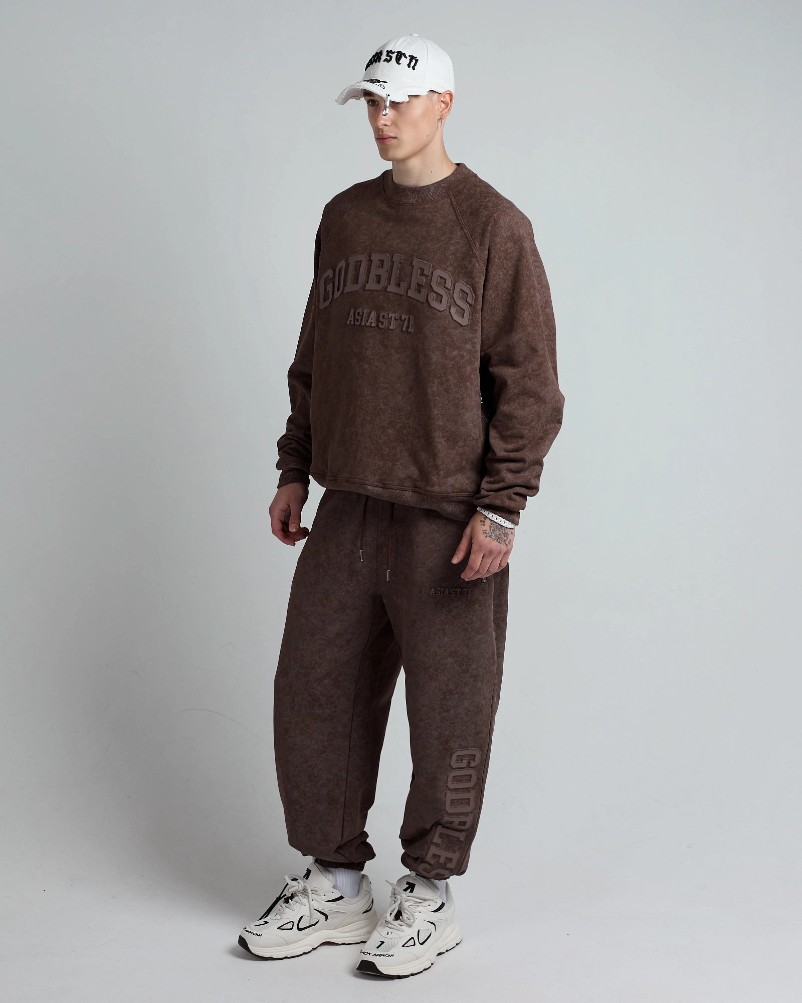 Джоггеры от костюма Godbless, выполненные из плотного хлопка 3-х нитки свободного кроя с эффектом washed. Модель дополнена принтом, выполненным выдавкой в технике embossing. Оснащены двумя прорезными карманами на молнии сбоку, а также двумя задними карманами. Брендированная стальная фурнитура и шнуровка с металлическими наконечниками добавляют стильный акцент.