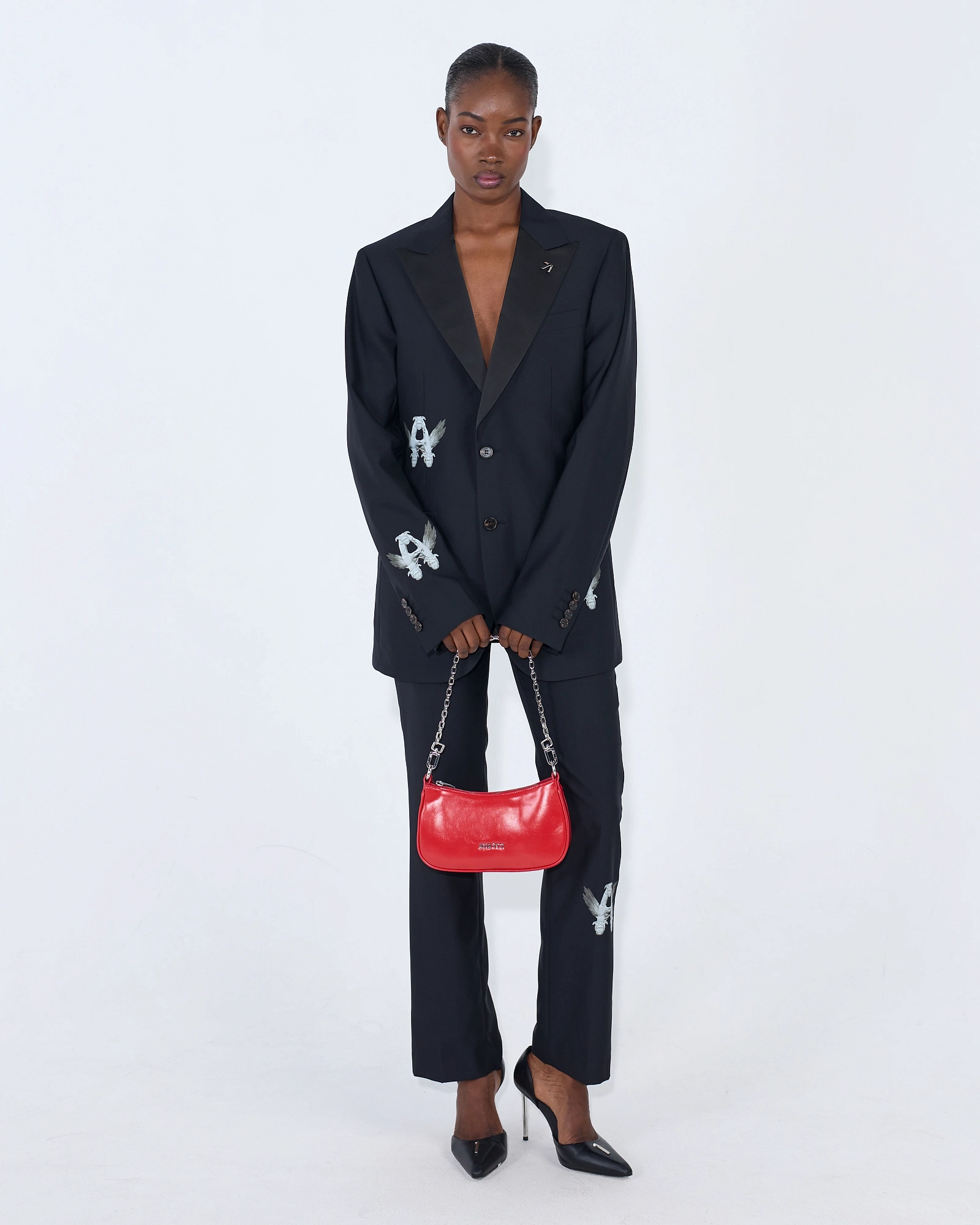 Мы рекомендуем расставить акценты в образе с помощью сумки и туфель, а также добавить украшения. "
