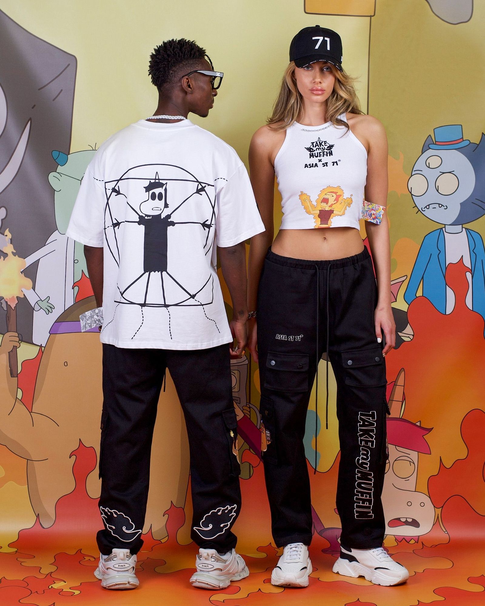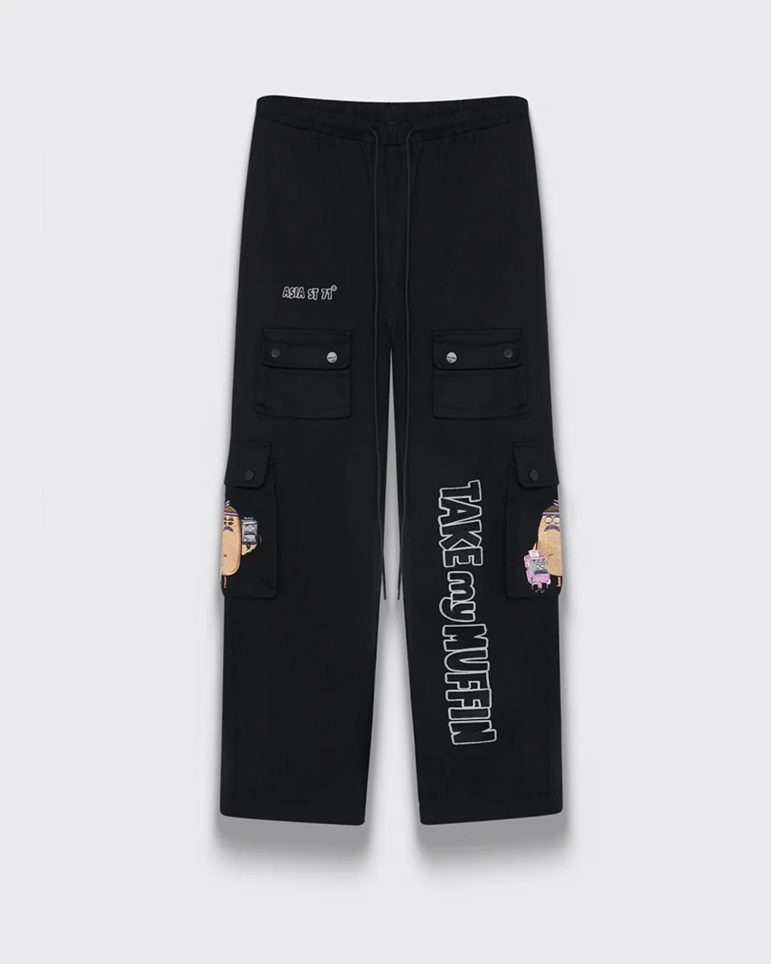Брюки карго свободного кроя из коллекции Take My Muffin оснащены комфортной резинкой на поясе, позволяющей регулировать посадку. Они имеют накладные карманы, длинную шнуровку. Принт выполнен в технике плоской многоцветной вышивки.