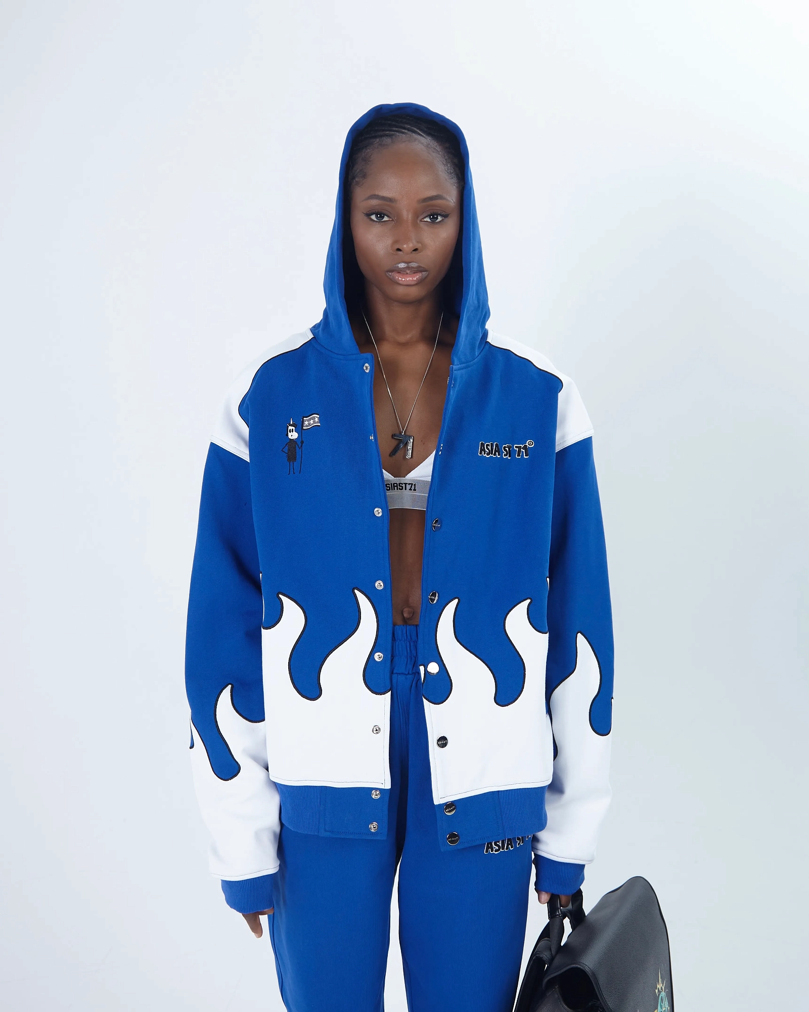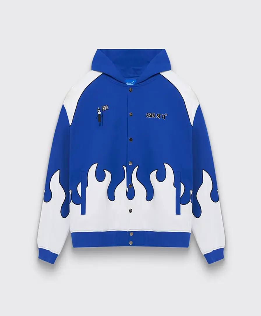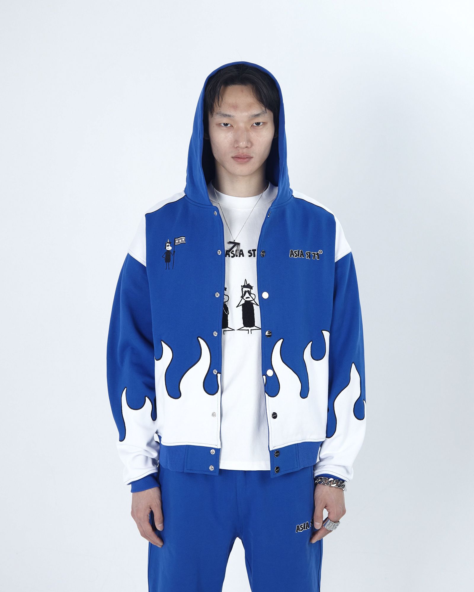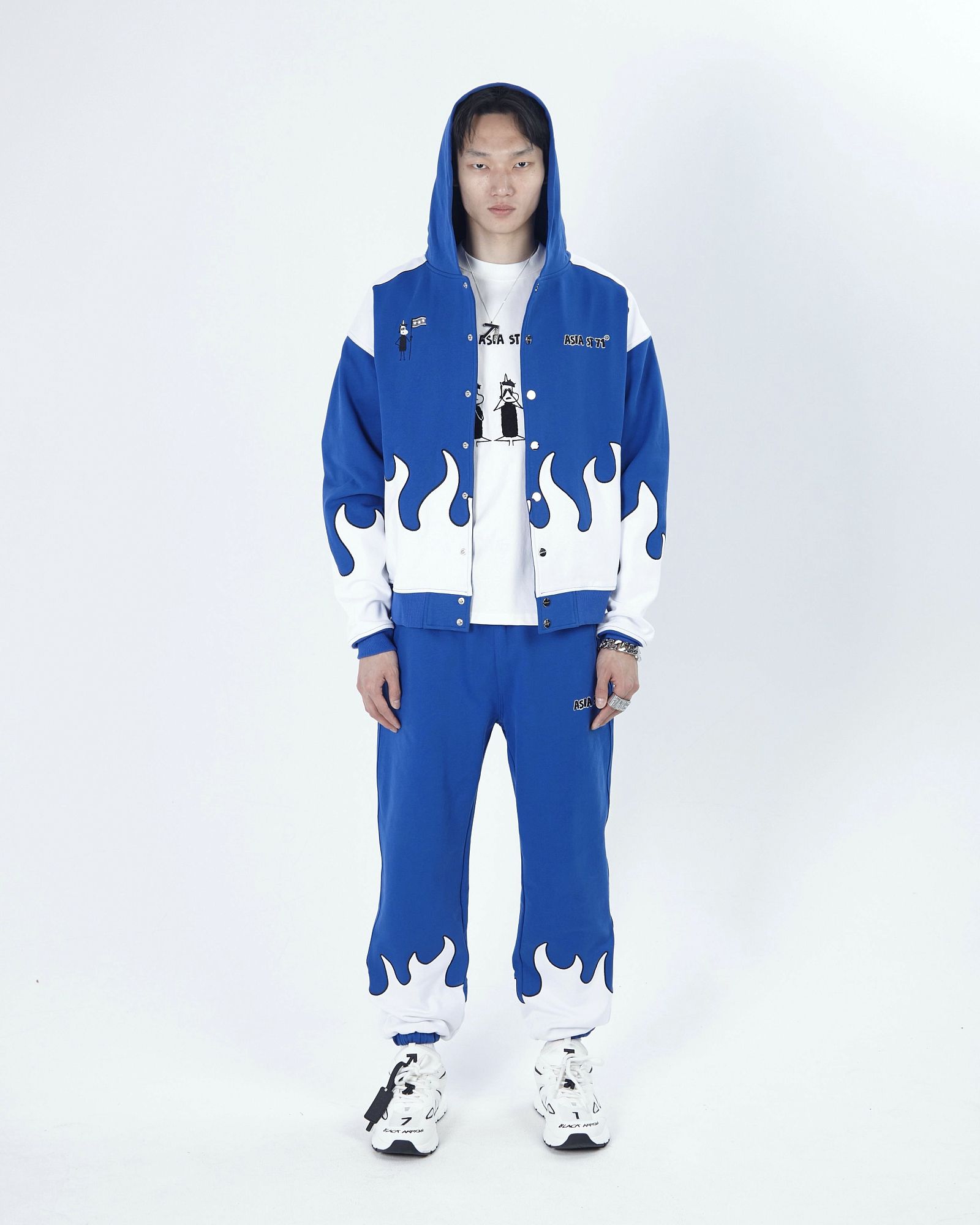 string(494) "Олимпийка от костюма из официальной коллаборации Asia St 71 x Take My Muffin выполнена из плотного хлопка и имеет свободный крой. Логотипы выполнены вышивкой и 3D нашивками из синели. Принт нанесен методом термотрансферной печати, а по бокам расположены контрастные белые лампасы."