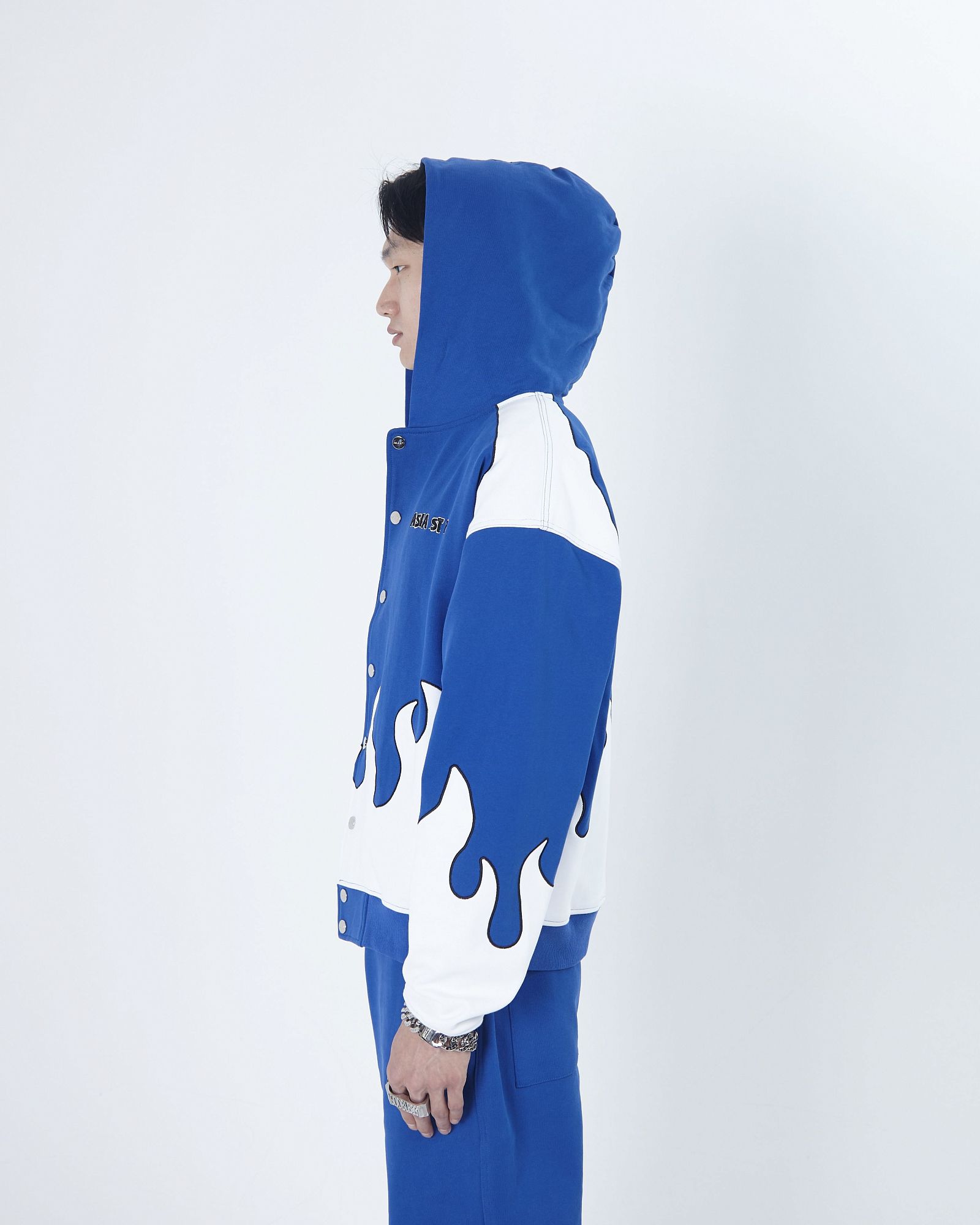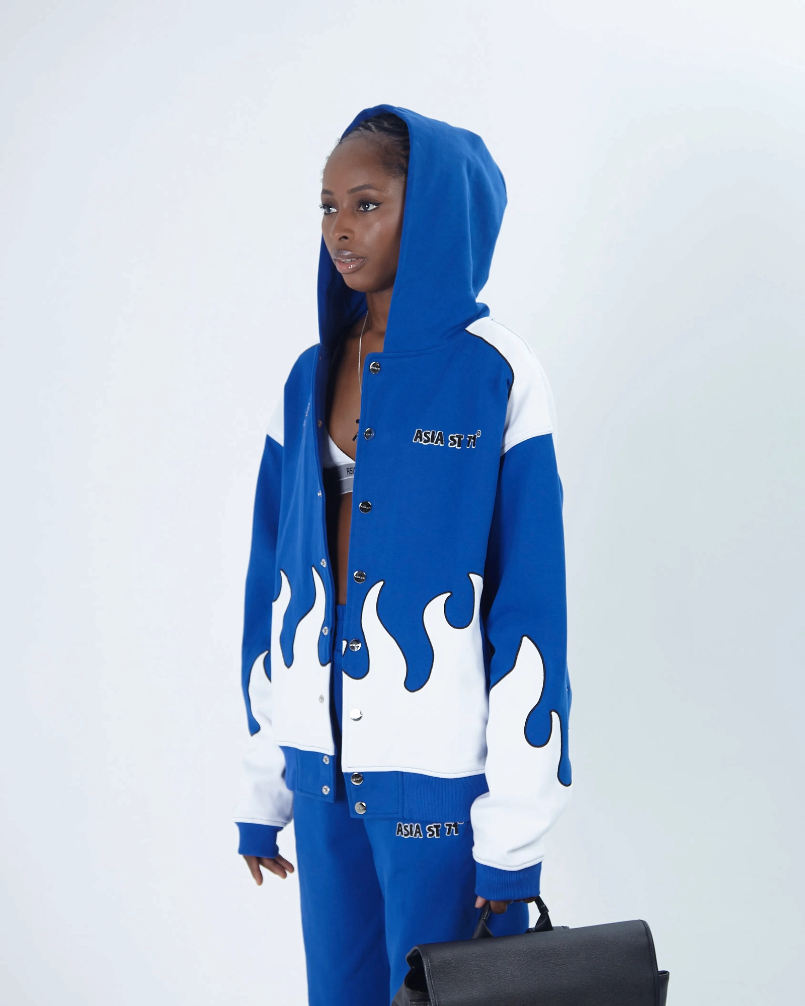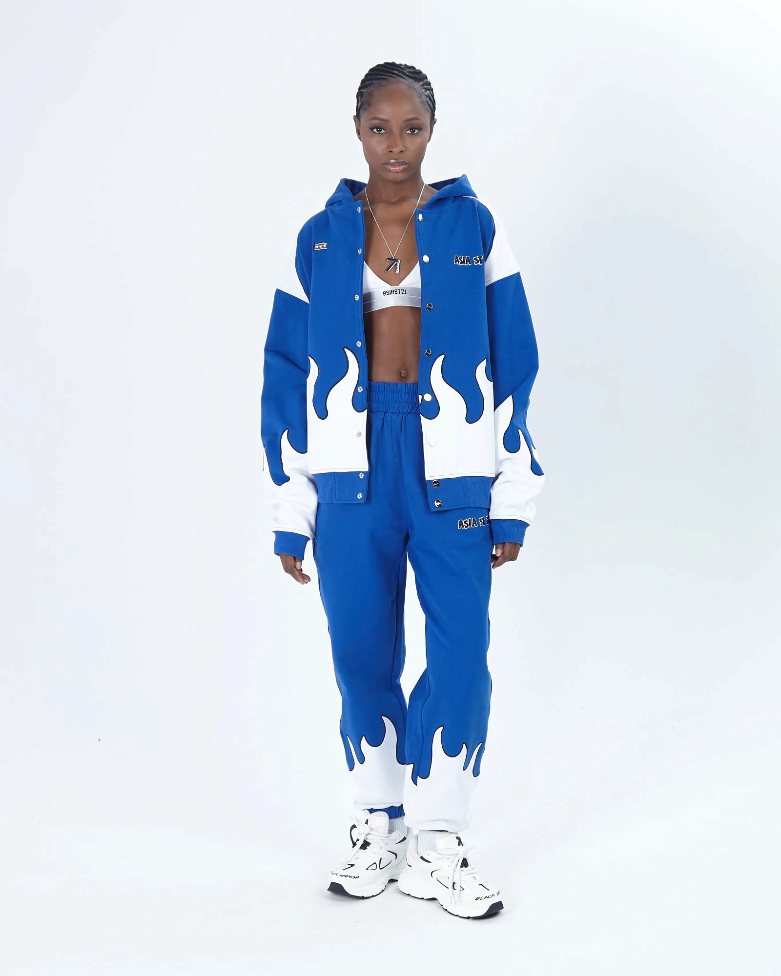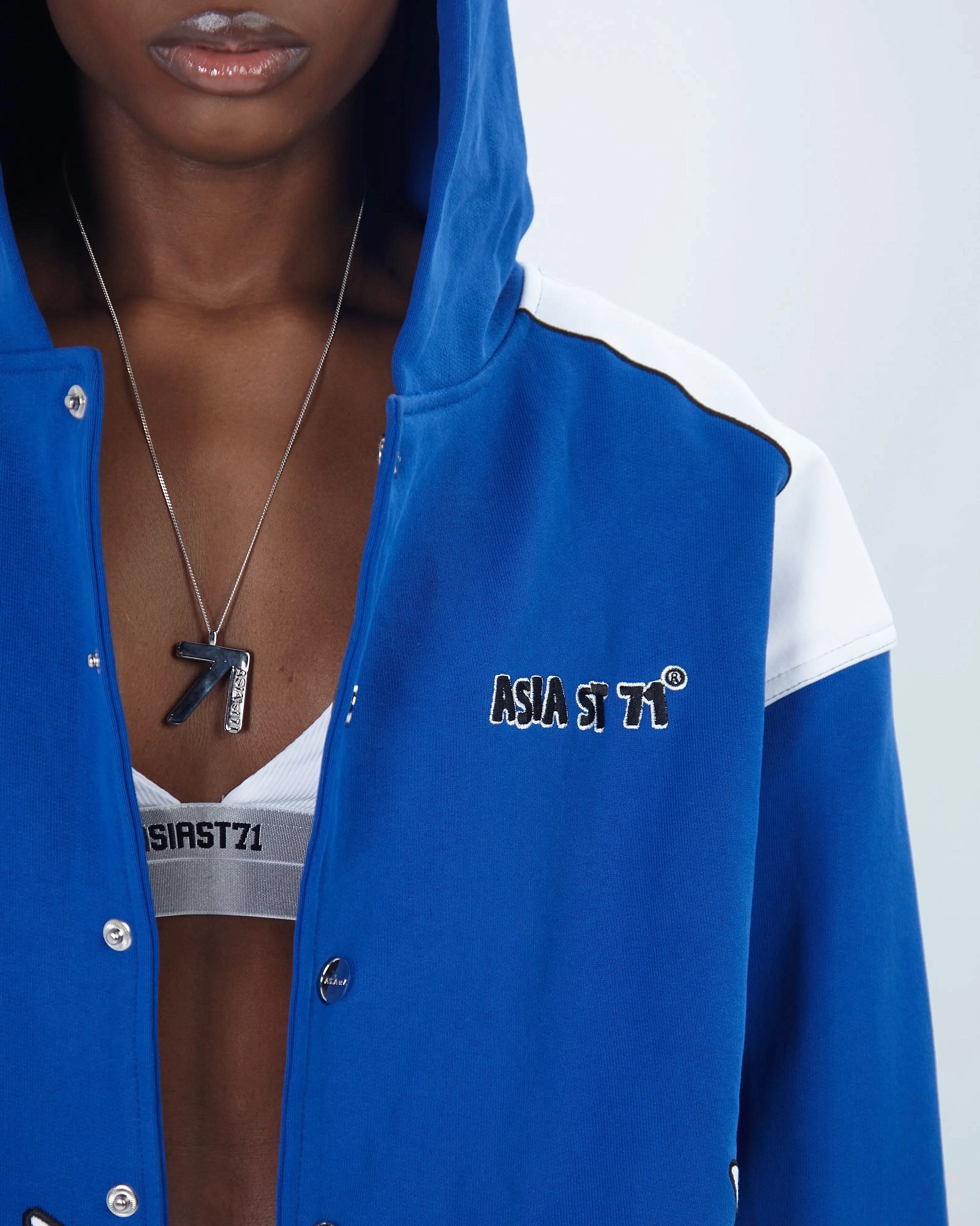 string(494) "Олимпийка от костюма из официальной коллаборации Asia St 71 x Take My Muffin выполнена из плотного хлопка и имеет свободный крой. Логотипы выполнены вышивкой и 3D нашивками из синели. Принт нанесен методом термотрансферной печати, а по бокам расположены контрастные белые лампасы."