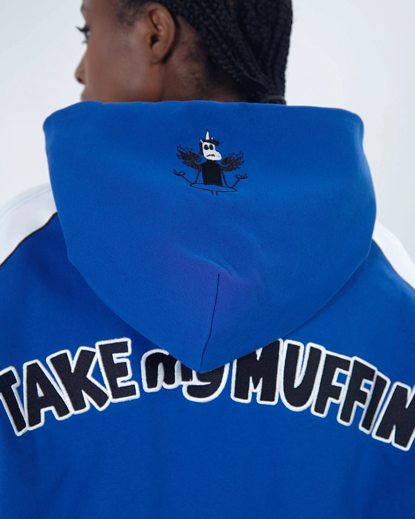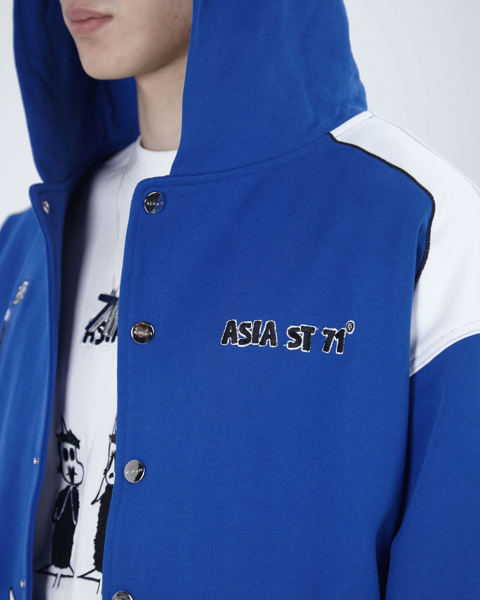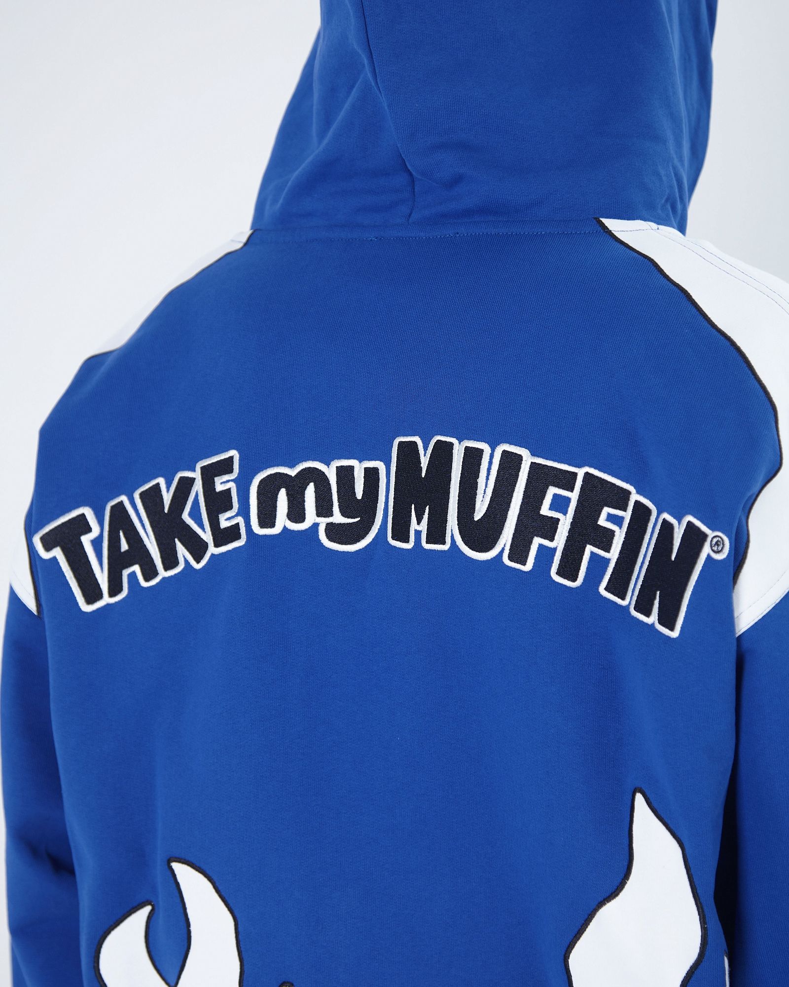 ASIA ST 71 X TAKE MY MUFFIN ВЫПОЛНЕНА ИЗ ПЛОТНОГО ХЛОПКА И ИМЕЕТ СВОБОДНЫЙ КРОЙ. ЛОГОТИПЫ ВЫПОЛНЕНЫ ВЫШИВКОЙ И 3D НАШИВКАМИ ИЗ СИНЕЛИ. ПРИНТ НАНЕСЕН МЕТОДОМ ТЕРМОТРАНСФЕРНОЙ ПЕЧАТИ, А ПО БОКАМ РАСПОЛОЖЕНЫ КОНТРАСТНЫЕ БЕЛЫЕ ЛАМПАСЫ."