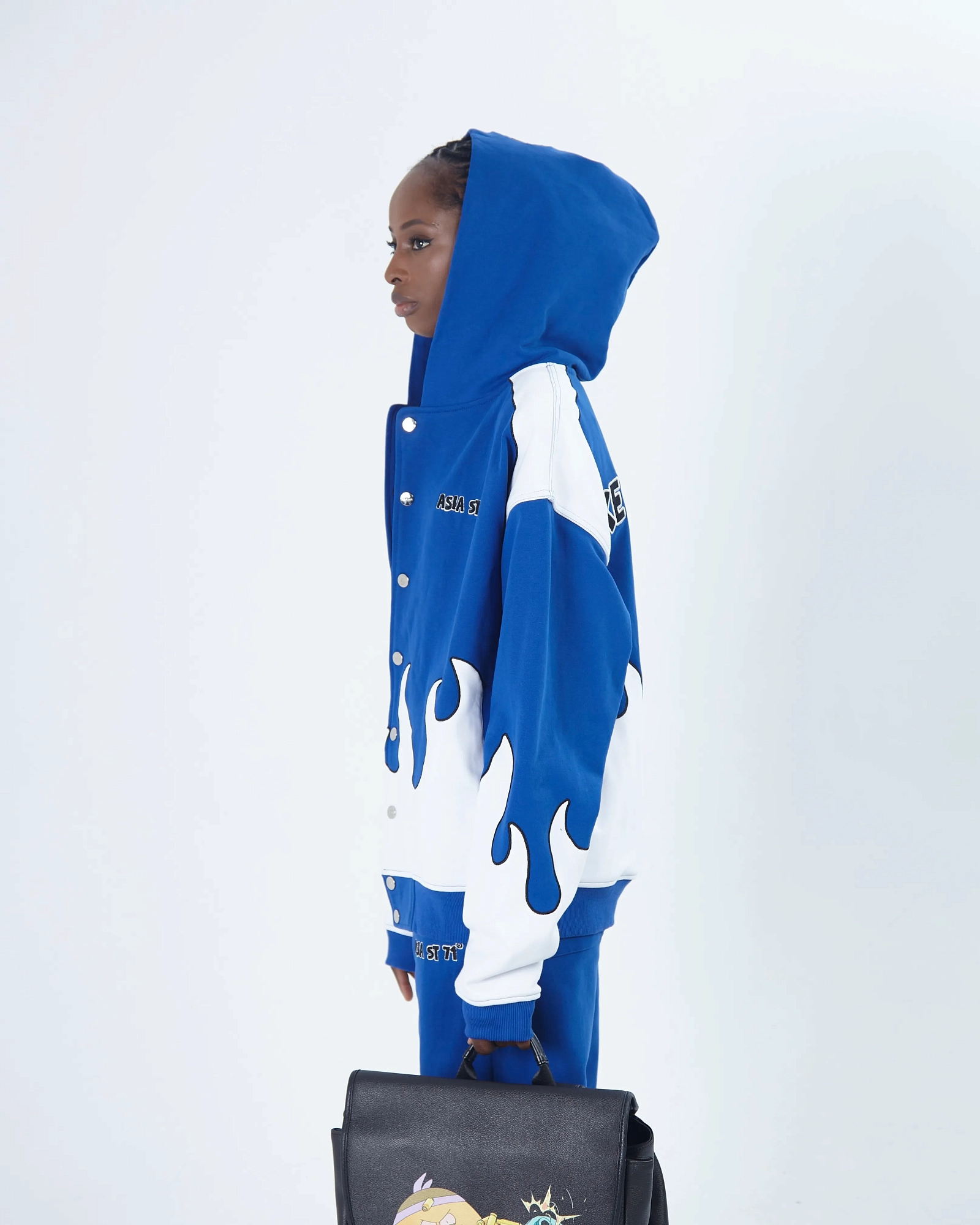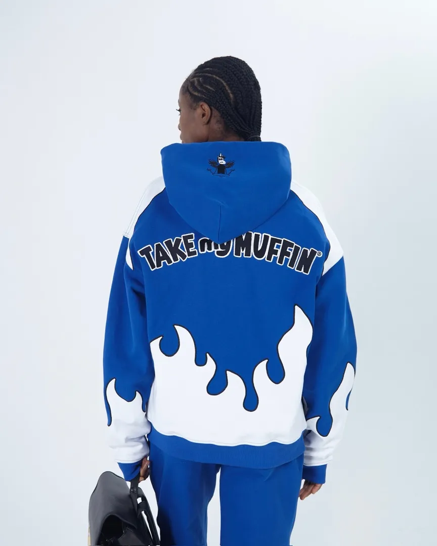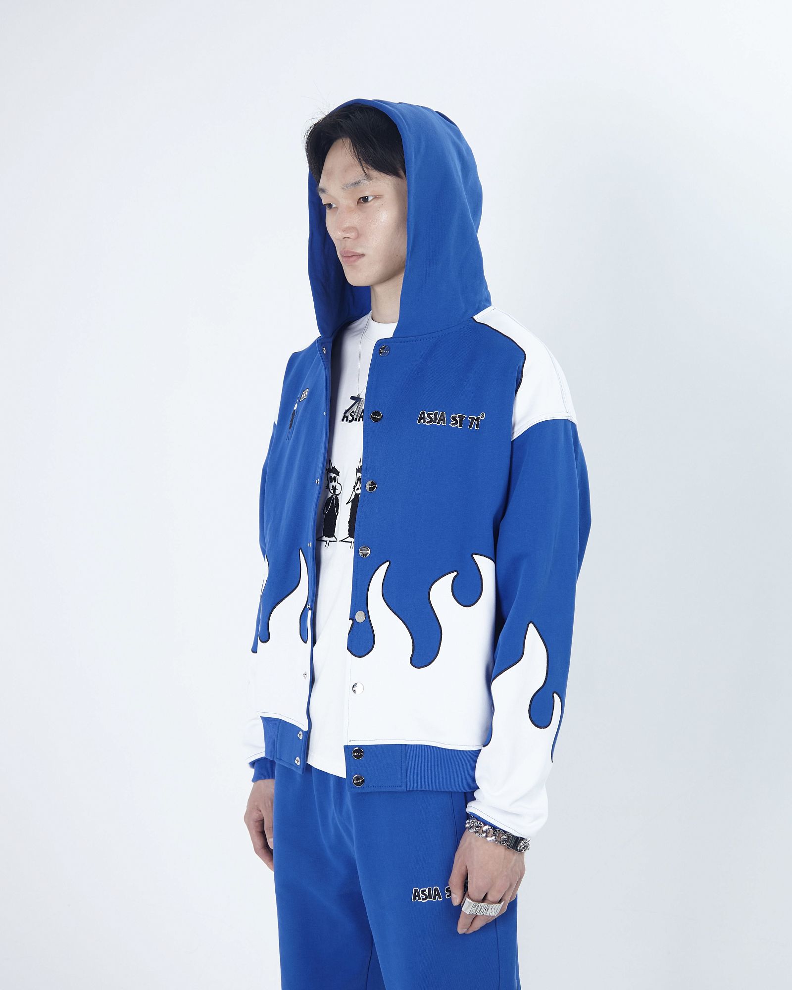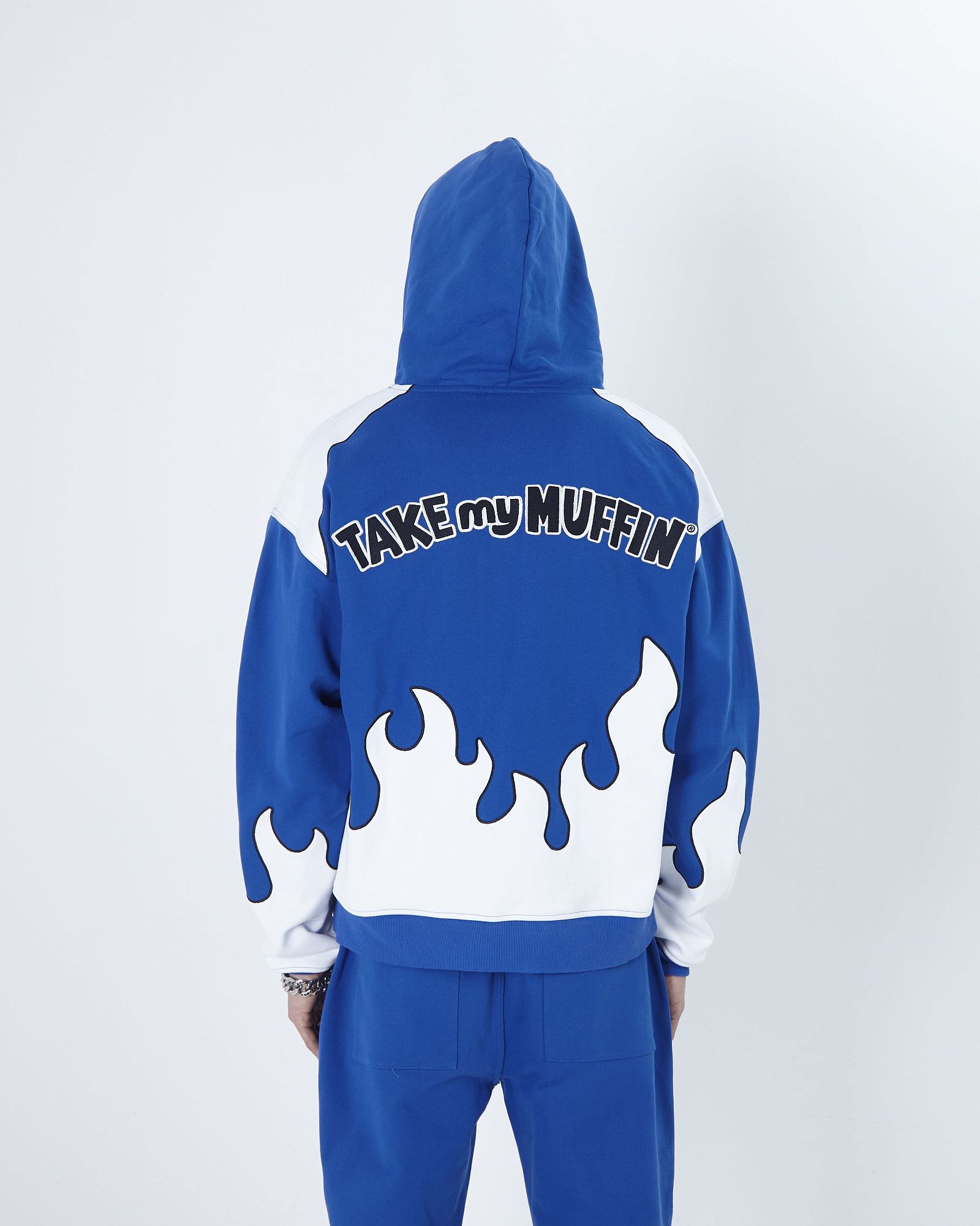 ASIA ST 71 X TAKE MY MUFFIN ВЫПОЛНЕНА ИЗ ПЛОТНОГО ХЛОПКА И ИМЕЕТ СВОБОДНЫЙ КРОЙ. ЛОГОТИПЫ ВЫПОЛНЕНЫ ВЫШИВКОЙ И 3D НАШИВКАМИ ИЗ СИНЕЛИ. ПРИНТ НАНЕСЕН МЕТОДОМ ТЕРМОТРАНСФЕРНОЙ ПЕЧАТИ, А ПО БОКАМ РАСПОЛОЖЕНЫ КОНТРАСТНЫЕ БЕЛЫЕ ЛАМПАСЫ."