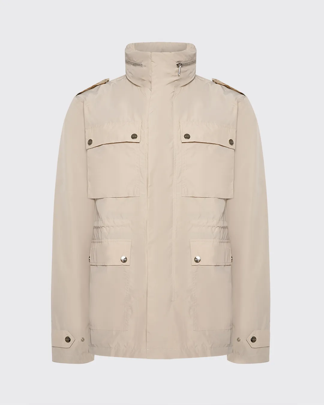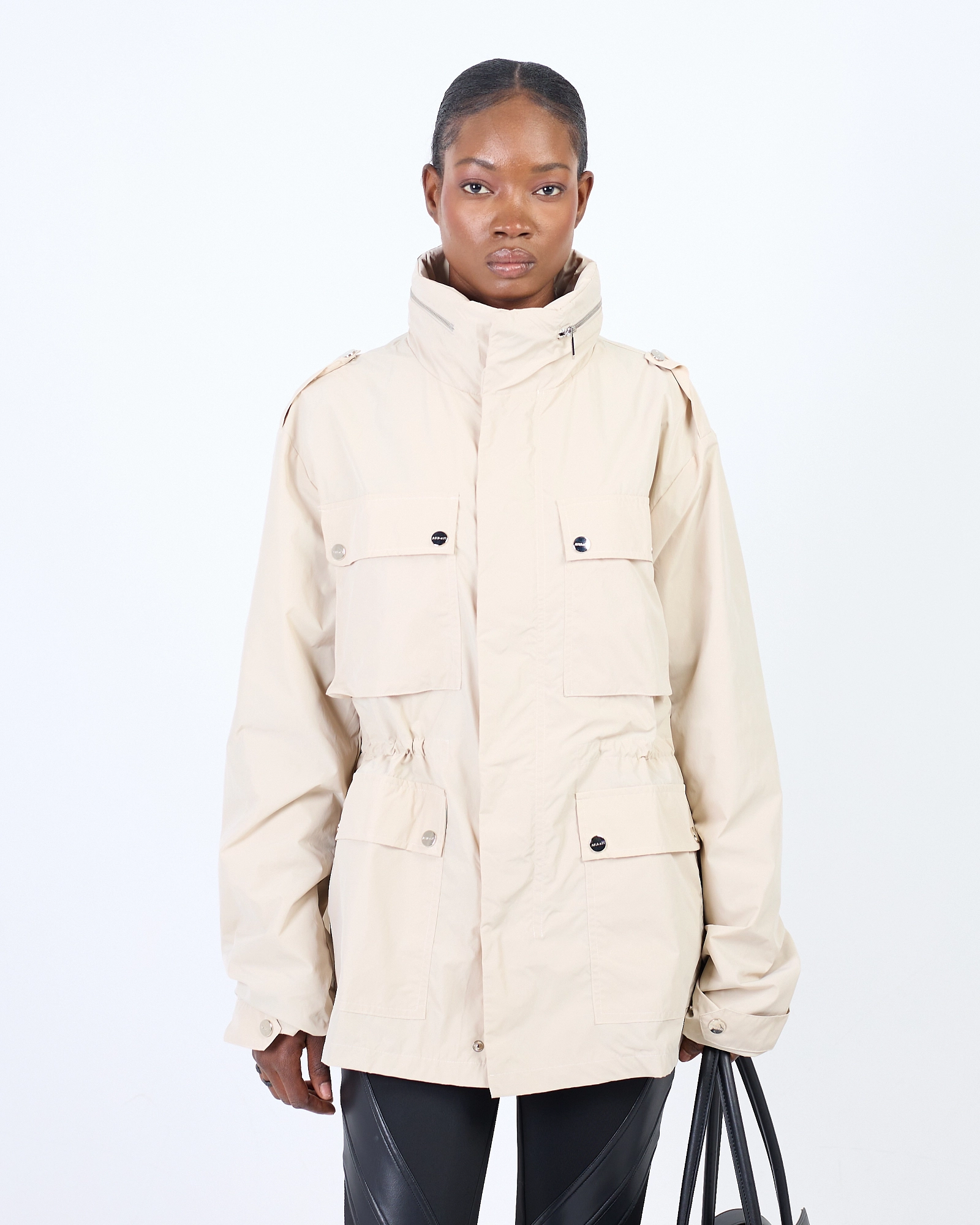 КУРТКА СВОБОДНОГО КРОЯ ИЗ НЕЙЛОНА, ВНУТРИ ПОДКЛАДКА С ПРИНТОМ. ОБЪЕМНЫЕ НАКЛАДАНЫЕ КАРМАНЫ НА ГРУДИ, ДВА ВНУТРЕННИХ КАРМАНА НА МОЛНИИ, ПОТАЙНОЙ КАПЮШОН НА ВОРОТЕ-СТОЙКА. ВНУТРЕННЯЯ ШНУРОВКА НА ТАЛИИ И ПАТЫ НА РУКАВАХ С ВОЗМОЖНОСТЬЮ РЕГУЛИРОВКИ ОБХВАТА. БРЕНДИРОВАННАЯ СТАЛЬНАЯ ФУРНИТУРА.