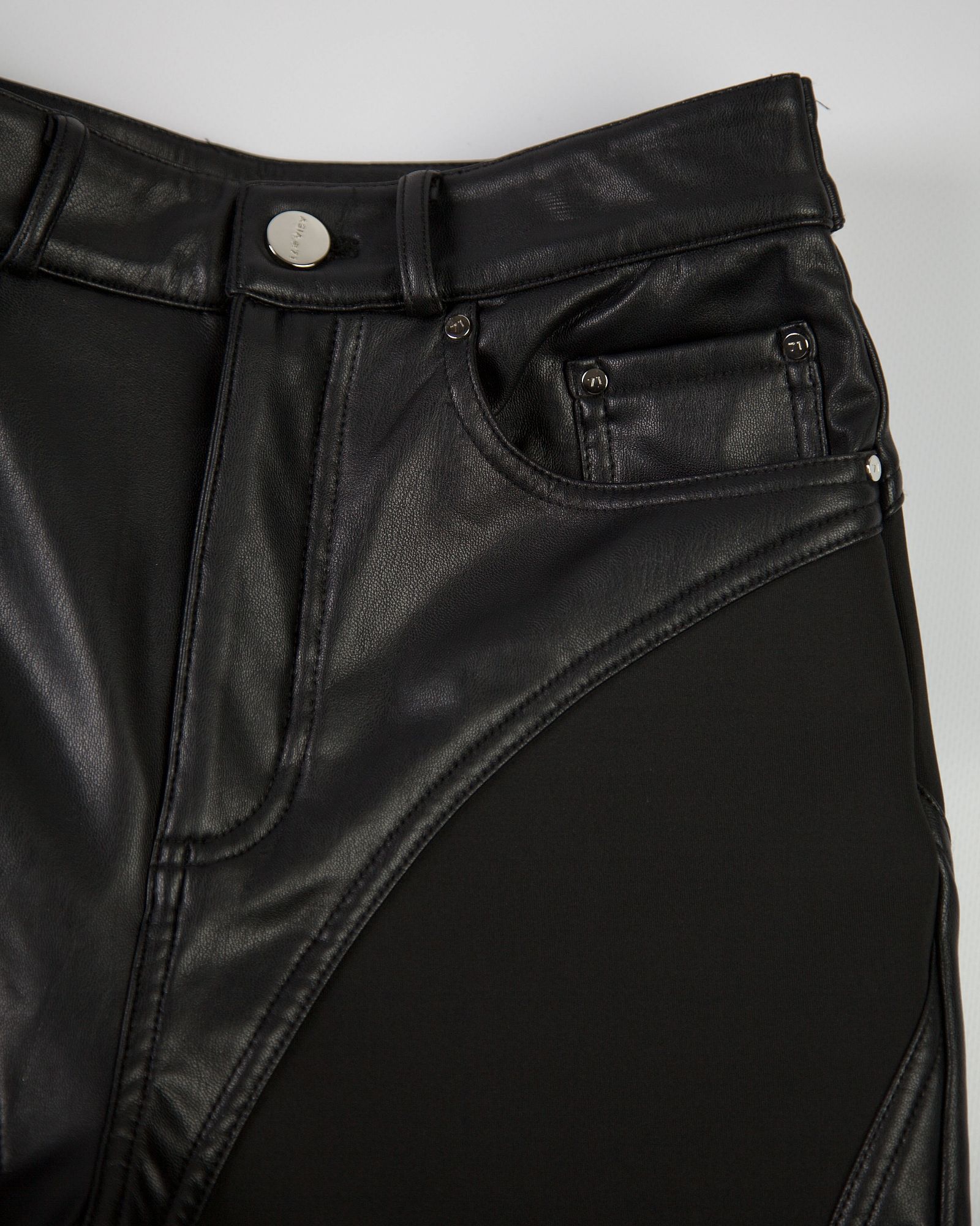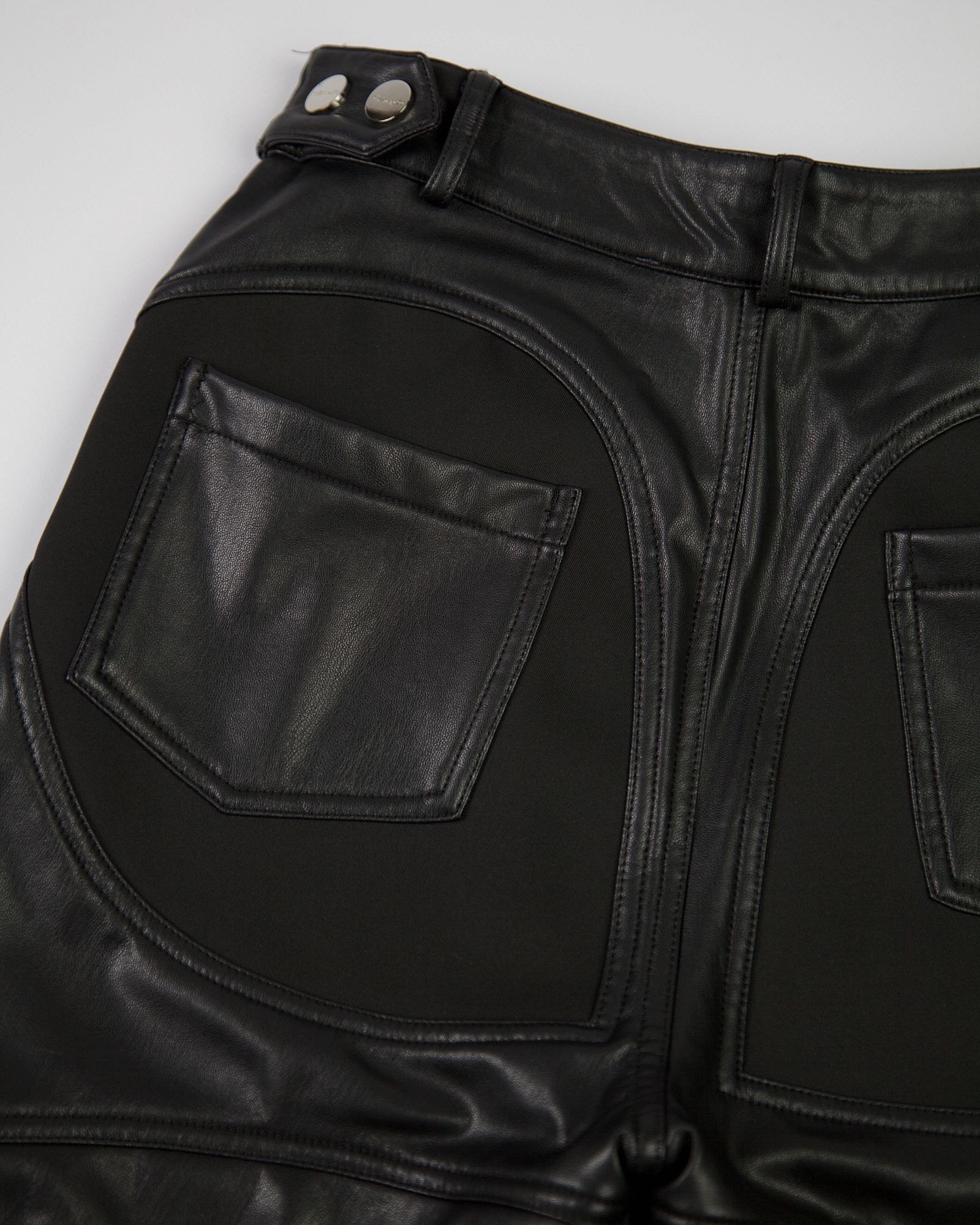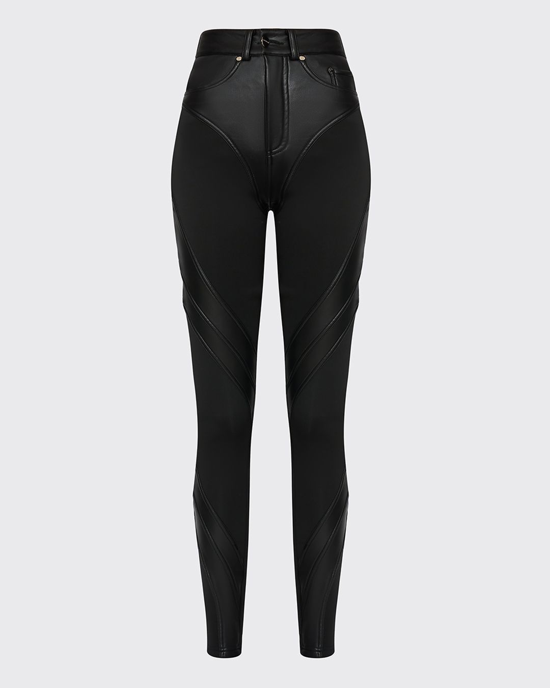 Леги с вставками из эко-кожи, обеспечивающие идеальную посадку. Модель имеет швы, подчеркивающие фигуру, и дополнена брендированной стальной фурнитурой для стильного акцента.