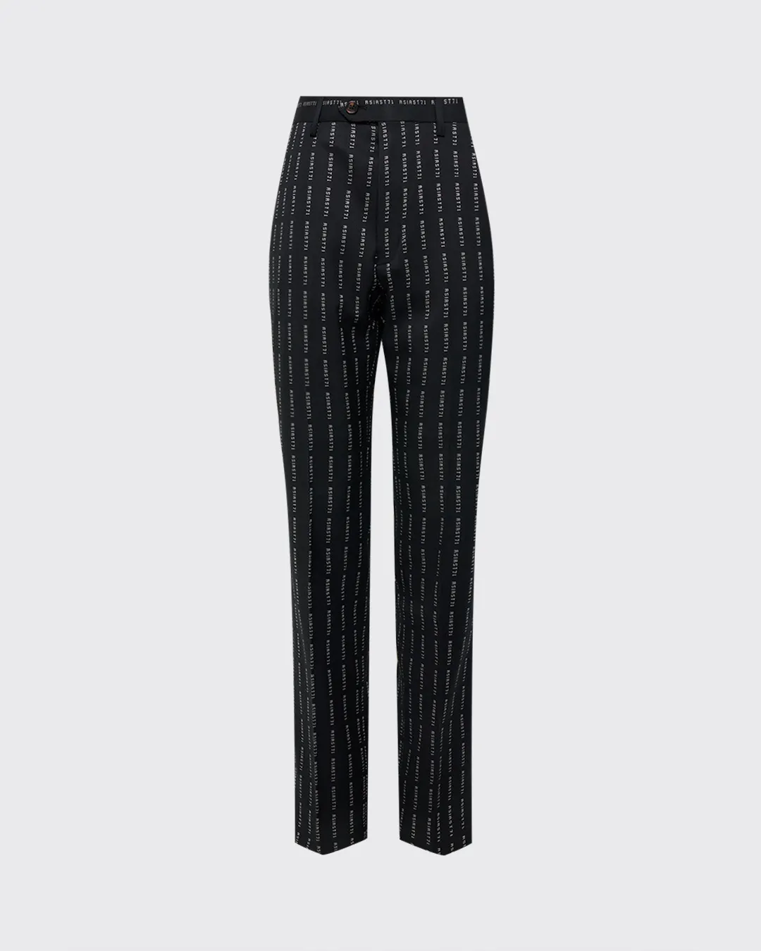 string(509) "Брюки из коллекции Classic Line прямого свободного кроя, выполнены из полушерсти. Паттерн лого Asia st 71. Низкая посадка, комфортный пояс на пуговице с гульфиком. Мы рекомендуем сочетать брюки с пиджаком с аналогичным принтом для total look или разбавить образ однотонной рубашкой или топом. "