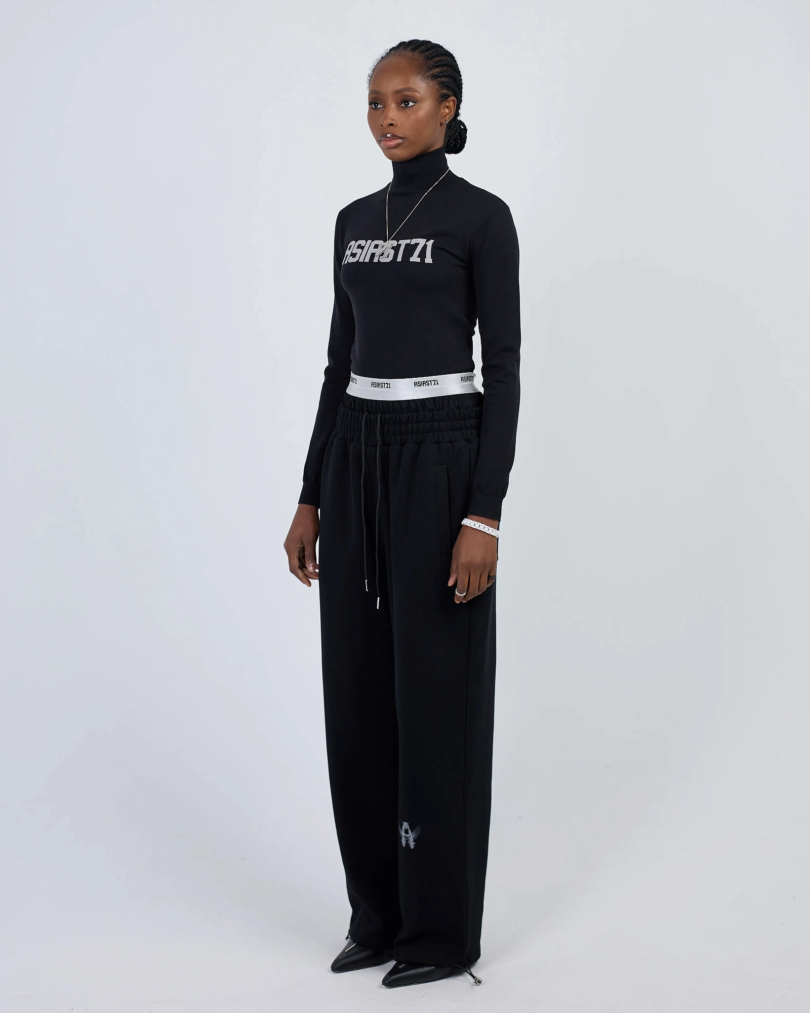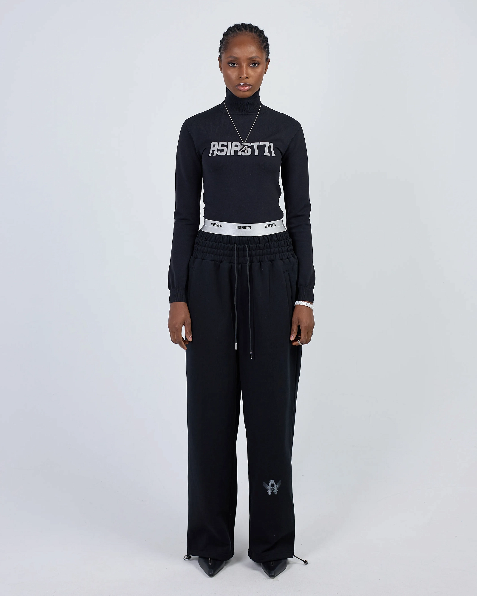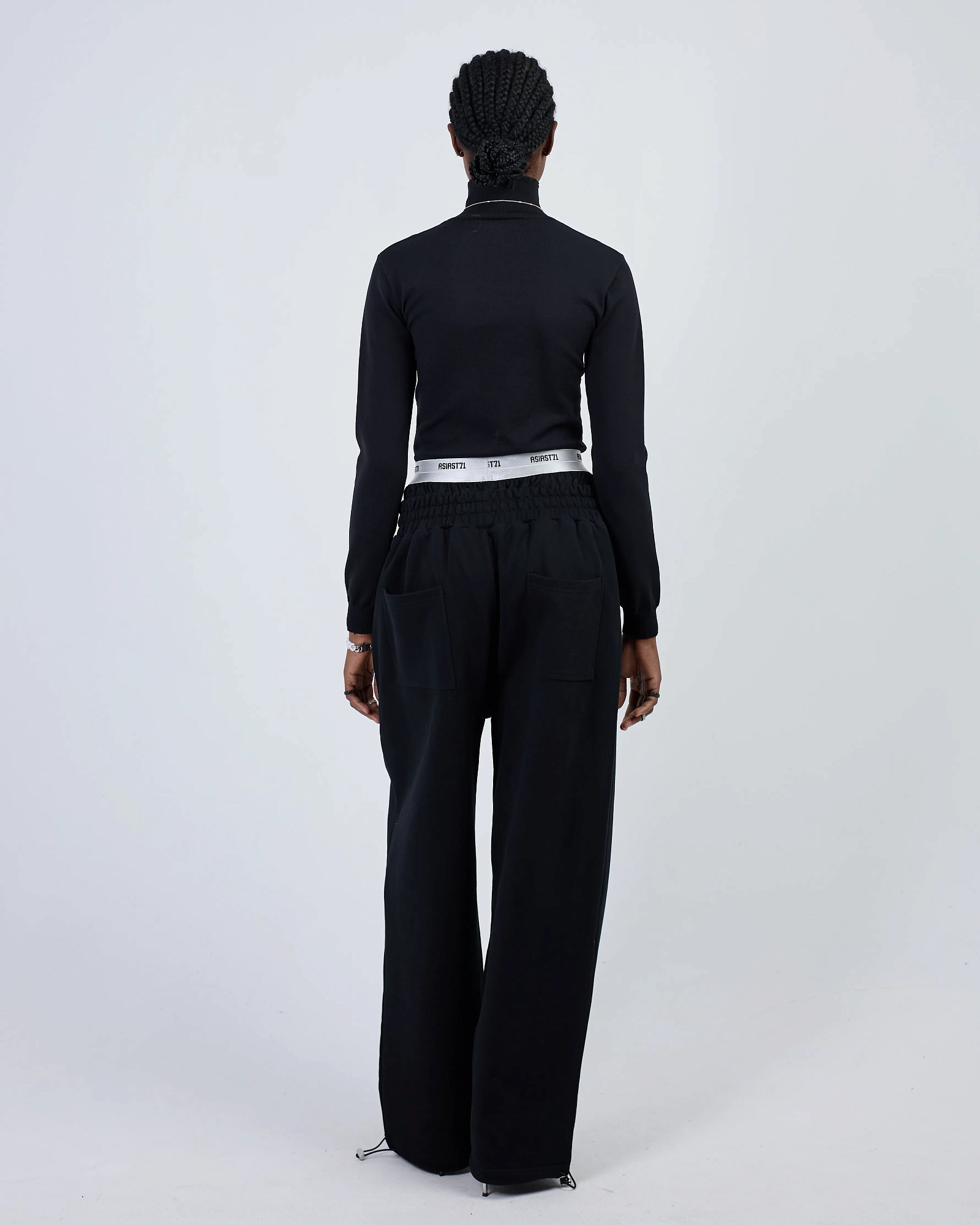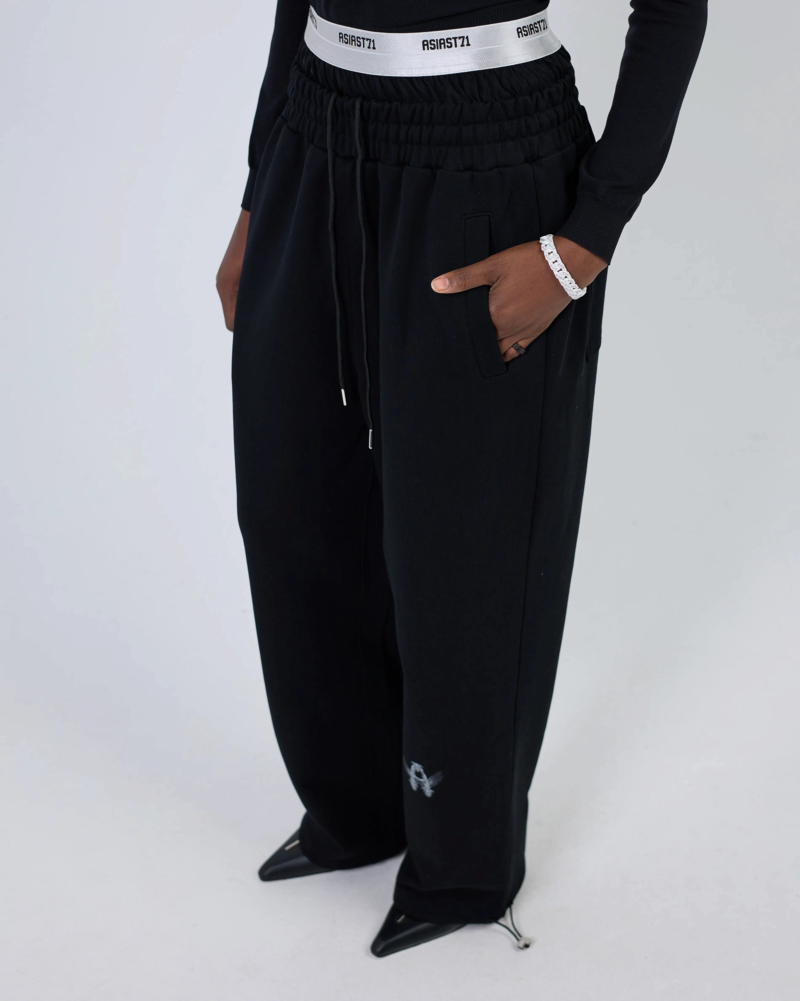 ШИРОКИЕ ДЖОГГЕРЫ ИЗ ПЛОТНОГО ХЛОПКА СВОБОДНОГО КРОЯ ПРЕДСТАВЛЕНЫ В ЧЕРНОМ И ПЫЛЬНО-СИНЕМ ЦВЕТАХ. ДВОЙНОЙ КОНТРАСТНЫЙ ПОЯС С ЛОГОТИПОМ ПАТТЕРНОМ. КОМФОРТНАЯ РЕЗИНКА НА ТАЛИИ И КУЛИСКА С ФИКСАТОРАМИ НА ЩИКОЛОТКАХ С ВОЗМОЖНОСТЬЮ УТЯЖКИ. СПЕРЕДИ ДВА ПРОРЕЗНЫХ КАРМАНА И СЗАДИ ДВА НАКЛАДНЫХ. БАЗОВАЯ ПАРА, КОТОРАЯ БУДЕТ СОЧЕТАТЬСЯ С ВАШИМ ГАРДЕРОБОМ. "