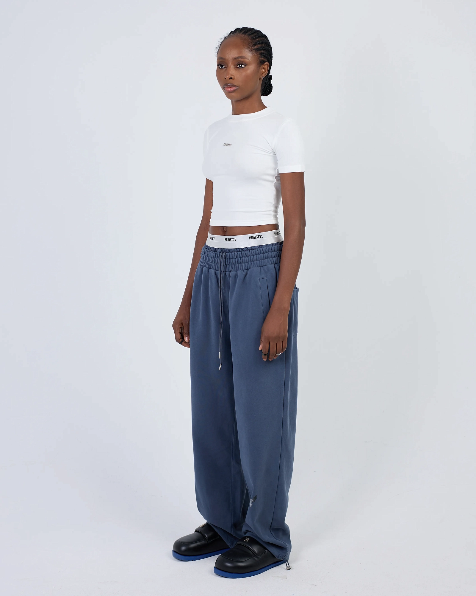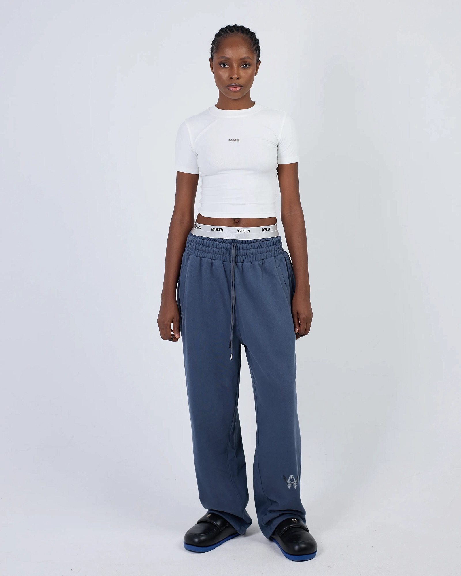 ШИРОКИЕ ДЖОГГЕРЫ ИЗ ПЛОТНОГО ХЛОПКА СВОБОДНОГО КРОЯ ПРЕДСТАВЛЕНЫ В ЧЕРНОМ И ПЫЛЬНО-СИНЕМ ЦВЕТАХ. ДВОЙНОЙ КОНТРАСТНЫЙ ПОЯС С ЛОГОТИПОМ ПАТТЕРНОМ. КОМФОРТНАЯ РЕЗИНКА НА ТАЛИИ И КУЛИСКА С ФИКСАТОРАМИ НА ЩИКОЛОТКАХ С ВОЗМОЖНОСТЬЮ УТЯЖКИ. СПЕРЕДИ ДВА ПРОРЕЗНЫХ КАРМАНА И СЗАДИ ДВА НАКЛАДНЫХ. БАЗОВАЯ ПАРА, КОТОРАЯ БУДЕТ СОЧЕТАТЬСЯ С ВАШИМ ГАРДЕРОБОМ. "