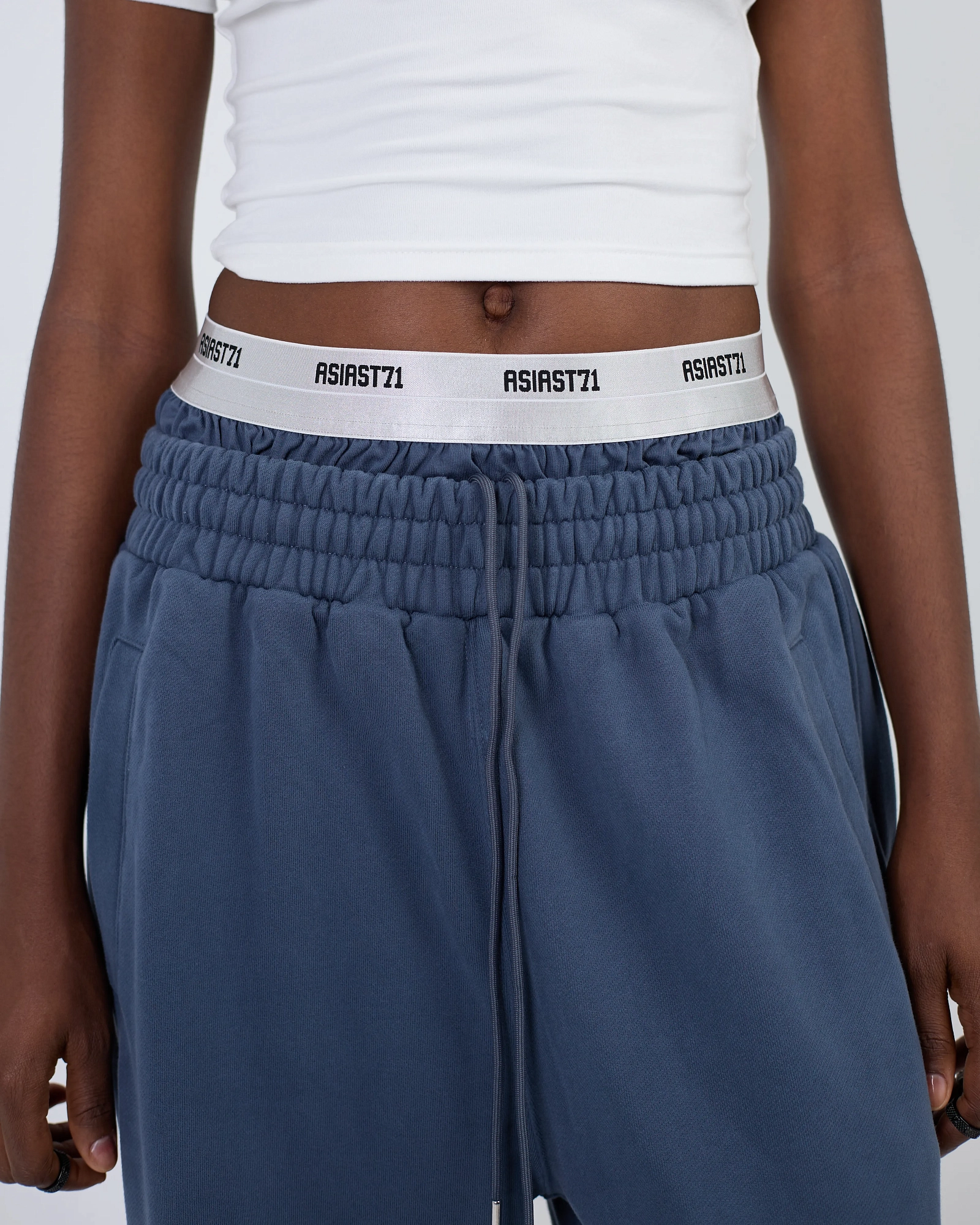 ДЖОГГЕРЫ В СИНЕМ ЦВЕТЕ, ВЫПОЛНЕННЫЕ ИЗ КОМФОРТНОГО И МЯГКОГО МАТЕРИАЛА. ИМЕЮТ СВОБОДНЫЙ КРОЙ, ЛОГОТИП, НАНЕСЕННЫЙ ВЫШИВКОЙ, КАРМАНЫ, КУЛИСКУ С ФИКСАТОРОМ ПО НИЖНЕМУ КРАЮ ДЛЯ УТЯЖКИ, БРЕНДИРОВАННУЮ СТАЛЬНУЮ ФУРНИТУРУ.