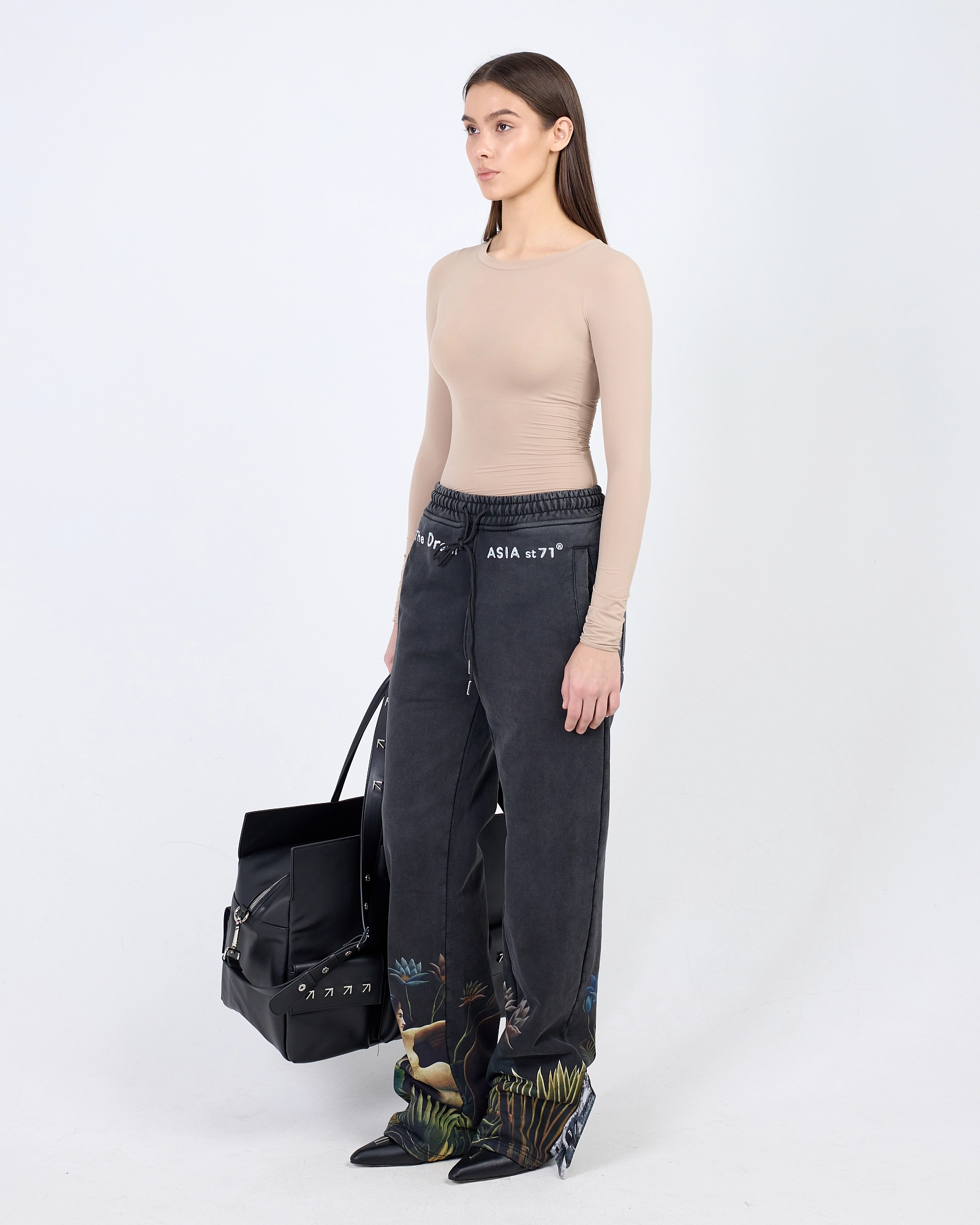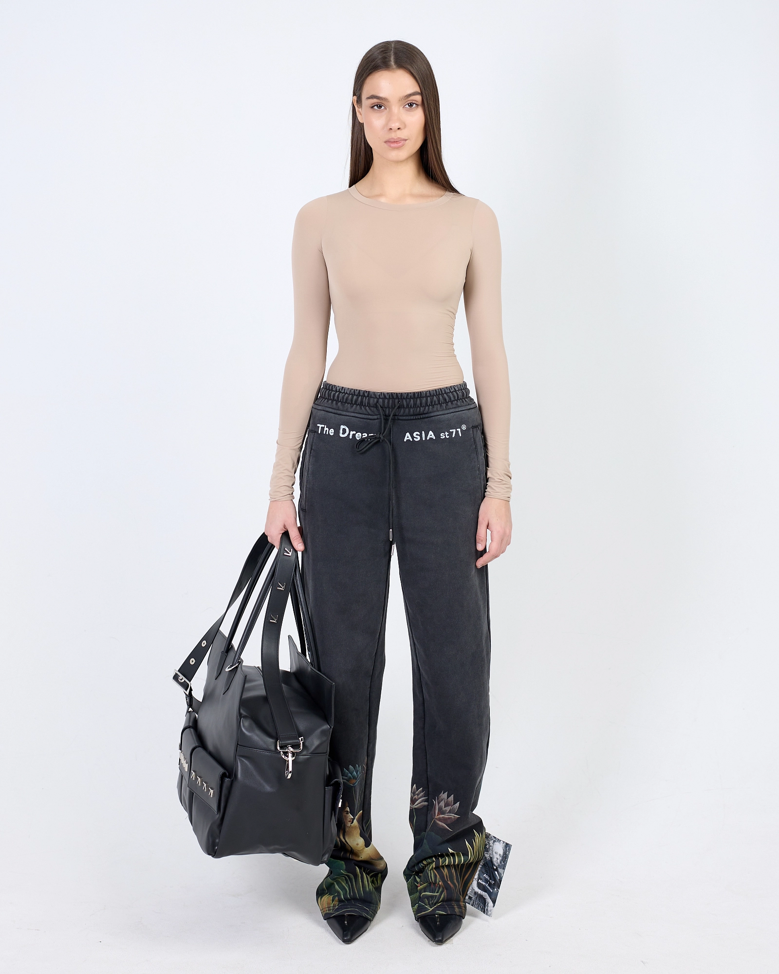 WASHED. СПУЩЕННЫЙ ПЛЕЧЕВОЙ ШОВ, МОЛНИЯ ПОД ЗАКРЫТОЙ ПЛАНКОЙ И КЛАССИЧЕСКИЕ ЛАЦКАНЫ. ПРИНТ НАНЕСЕН ЛАЗЕРНОЙ ПЕЧАТЬЮ И ПАТЧАМИ. БРЕНДИРОВАННАЯ СТАЛЬНАЯ ФУРНИТУРА.