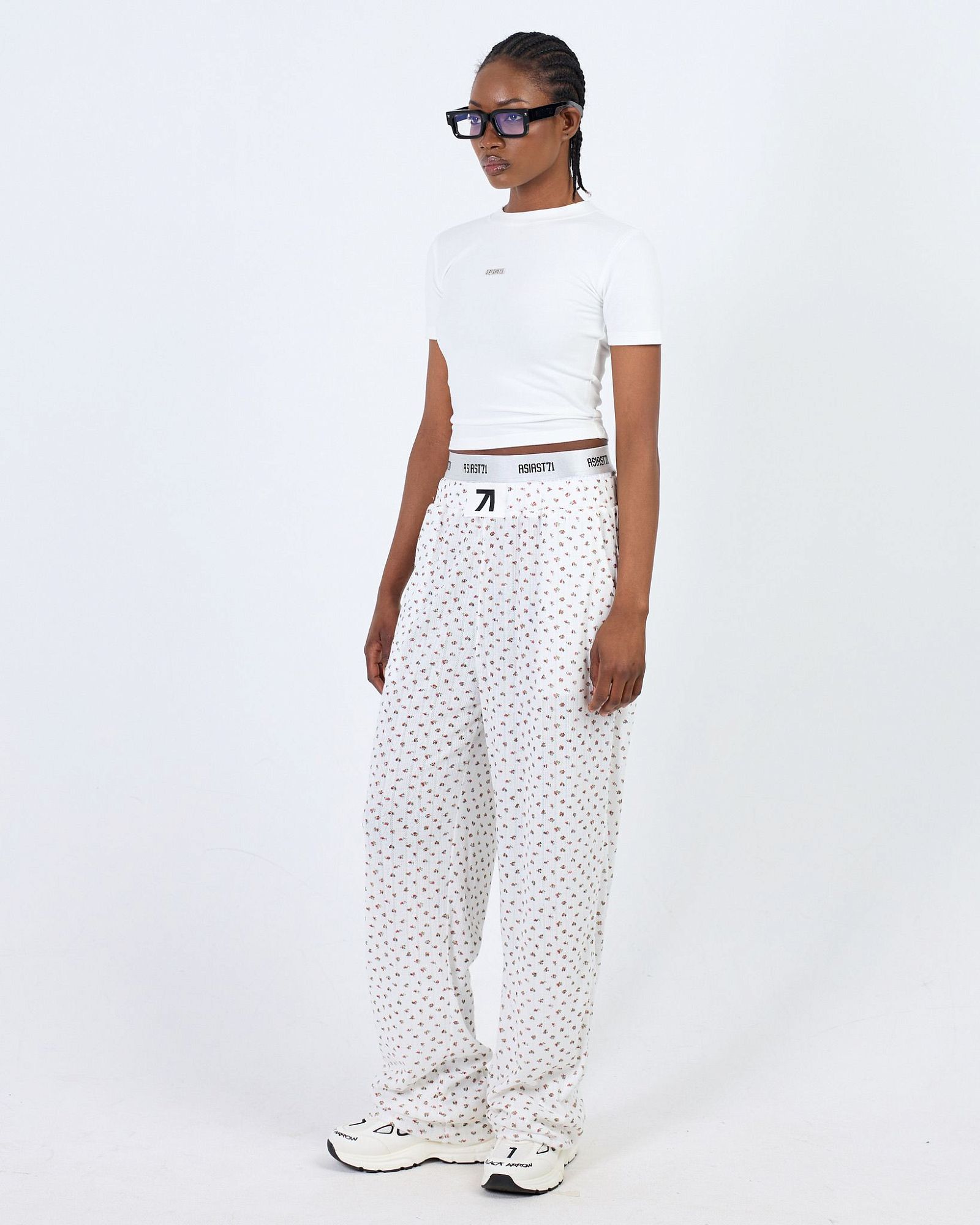 string(438) "Брюки свободного кроя выполнены из пуантеля с 3D вкраплениями контрастной нити. Двойной брендированный пояс на эластичной резинке, замшевая нашивка спереди и силиконовая черная стрелка создают стильный акцент, не перегружая летний образ."