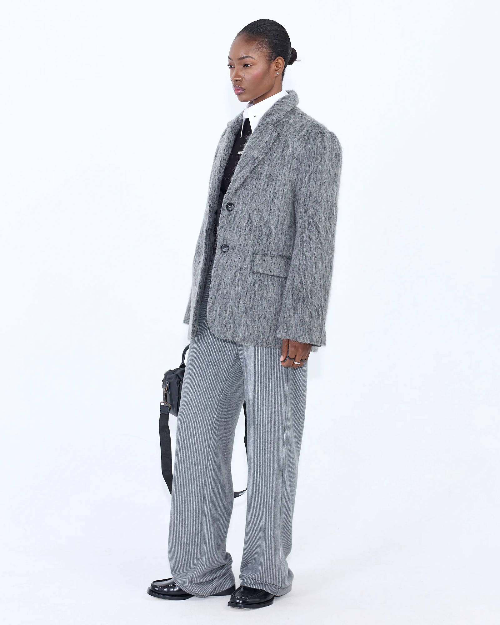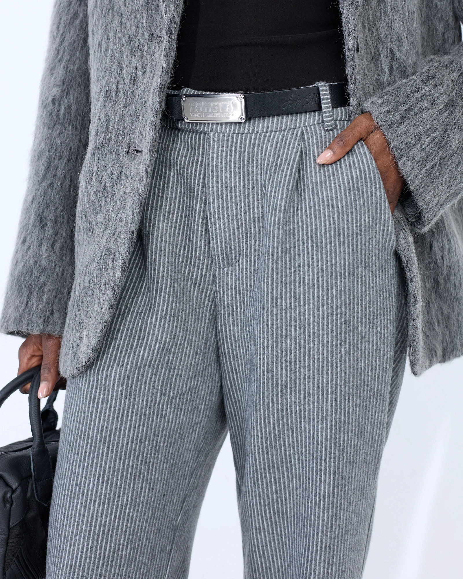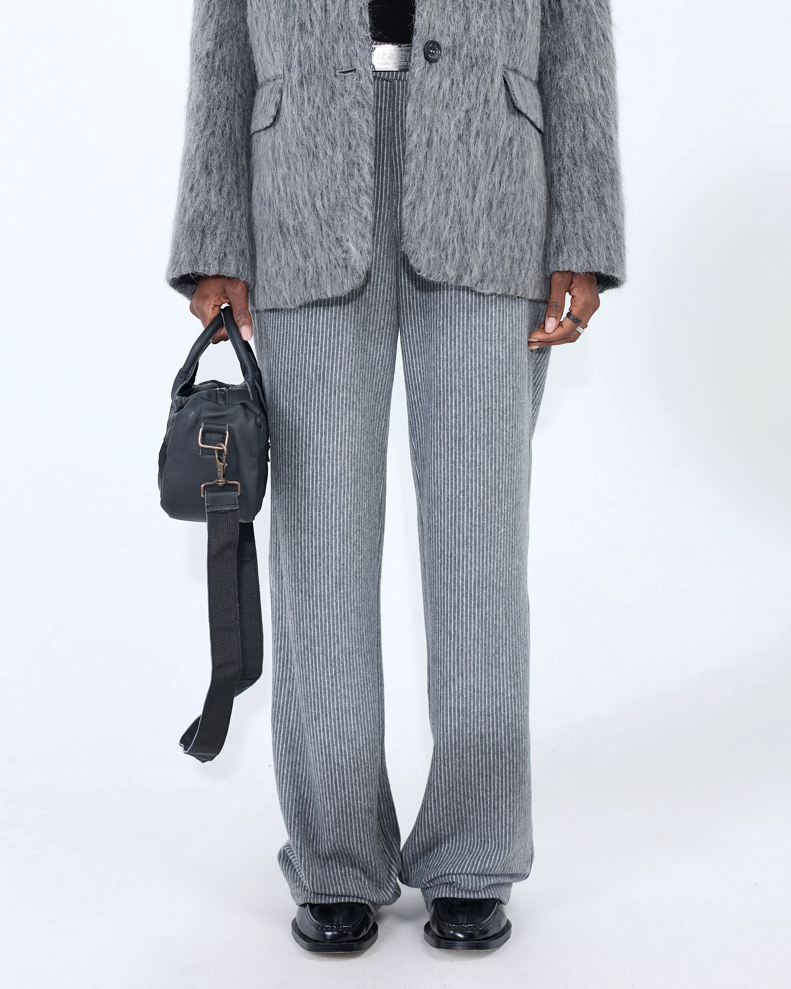 МАТЕРИАЛ SOFT TOUCH — ЭТО ПЛОТНЫЙ, НО МЯГКИЙ СМЕСОВЫЙ ТРИКОТАЖ С КОРОТКИМ ВОРСОМ, ПРИЯТНЫЙ НА ОЩУПЬ И С ЧУТЬ БАРХАТИСТОЙ ПОВЕРХНОСТЬЮ. БЛАГОДАРЯ ЭЛАСТИЧНОСТИ ТКАНЬ НЕ ДЕФОРМИРУЕТСЯ И НЕ ТЕРЯЕТ ФОРМУ, ОСТАЁТСЯ В ИЗНАЧАЛЬНОМ ВИДЕ ДАЖЕ ПРИ АКТИВНОЙ НОСКЕ. ТОНКАЯ ВЕРТИКАЛЬНАЯ ПОЛОСКА, ВЫТЯГИВАЮЩАЯ СИЛУЭТ. ЗАЩИПЫ У ПОЯСА ЗАДАЮТ ОБЪЁМ И ШИРИНУ ШТАНИНЫ. БРЮКИ В ПОЛ, КОТОРЫЕ ЛОЖАТСЯ МЯГКОЙ СКЛАДКОЙ НА ТУФЛИ. НОСИТЕ С ФАКТУРНЫМ ПАЛЬТО ИЛИ ПИДЖАКОМ FLUFFY ДЛЯ TOTAL LOOK."