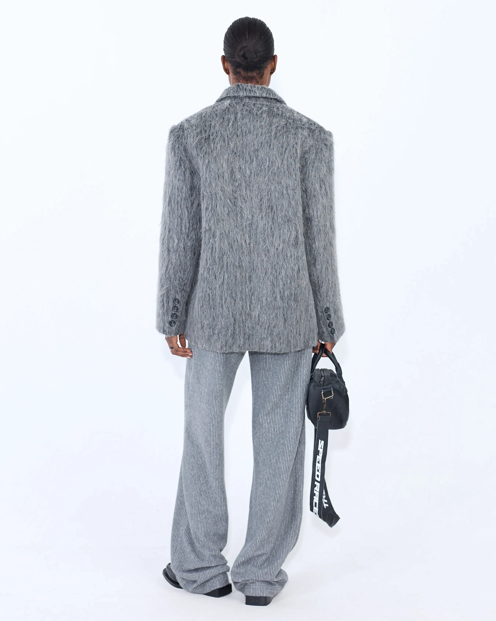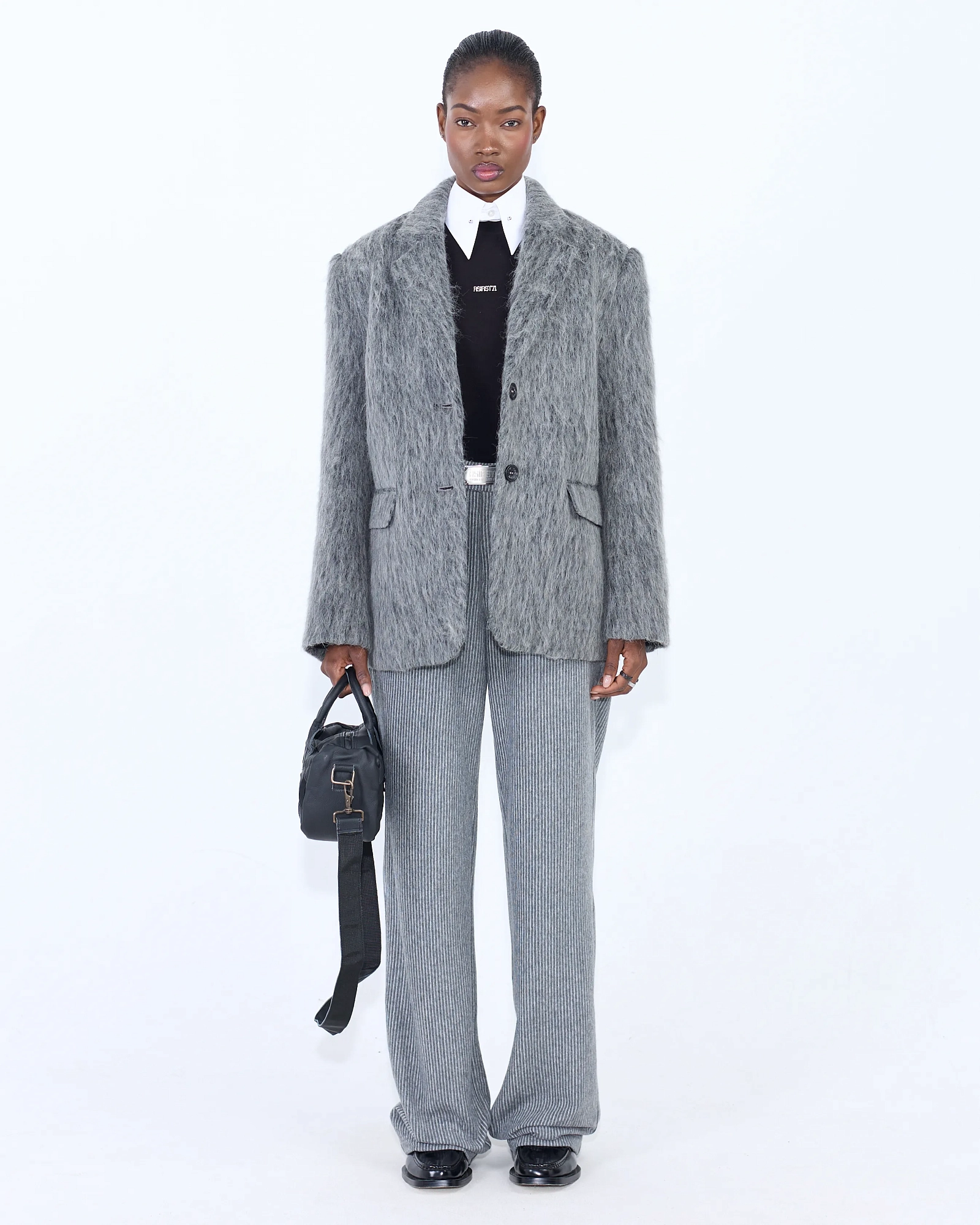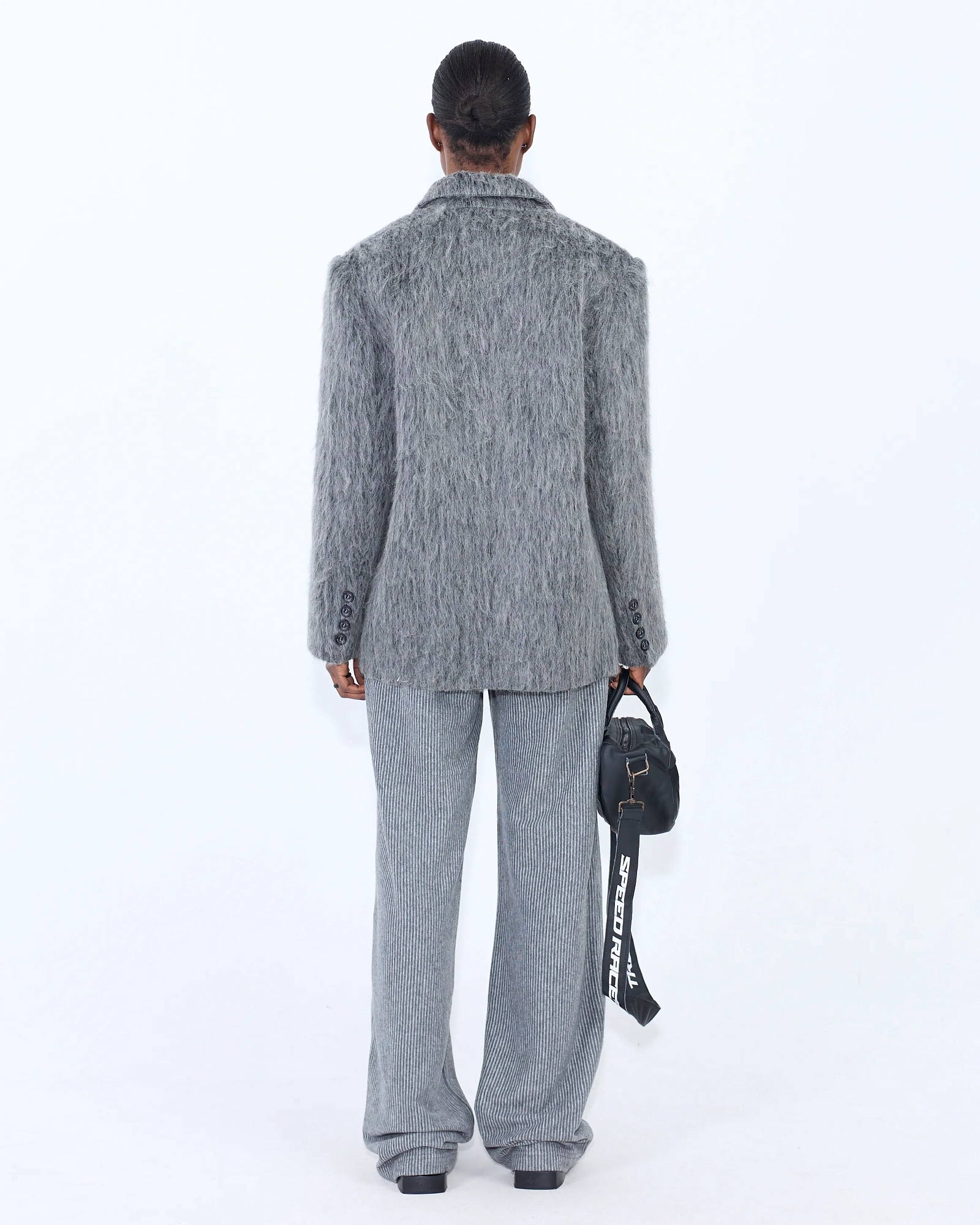 МАТЕРИАЛ SOFT TOUCH — ЭТО ПЛОТНЫЙ, НО МЯГКИЙ СМЕСОВЫЙ ТРИКОТАЖ С КОРОТКИМ ВОРСОМ, ПРИЯТНЫЙ НА ОЩУПЬ И С ЧУТЬ БАРХАТИСТОЙ ПОВЕРХНОСТЬЮ. БЛАГОДАРЯ ЭЛАСТИЧНОСТИ ТКАНЬ НЕ ДЕФОРМИРУЕТСЯ И НЕ ТЕРЯЕТ ФОРМУ, ОСТАЁТСЯ В ИЗНАЧАЛЬНОМ ВИДЕ ДАЖЕ ПРИ АКТИВНОЙ НОСКЕ. ТОНКАЯ ВЕРТИКАЛЬНАЯ ПОЛОСКА, ВЫТЯГИВАЮЩАЯ СИЛУЭТ. ЗАЩИПЫ У ПОЯСА ЗАДАЮТ ОБЪЁМ И ШИРИНУ ШТАНИНЫ. БРЮКИ В ПОЛ, КОТОРЫЕ ЛОЖАТСЯ МЯГКОЙ СКЛАДКОЙ НА ТУФЛИ. НОСИТЕ С ФАКТУРНЫМ ПАЛЬТО ИЛИ ПИДЖАКОМ FLUFFY ДЛЯ TOTAL LOOK."