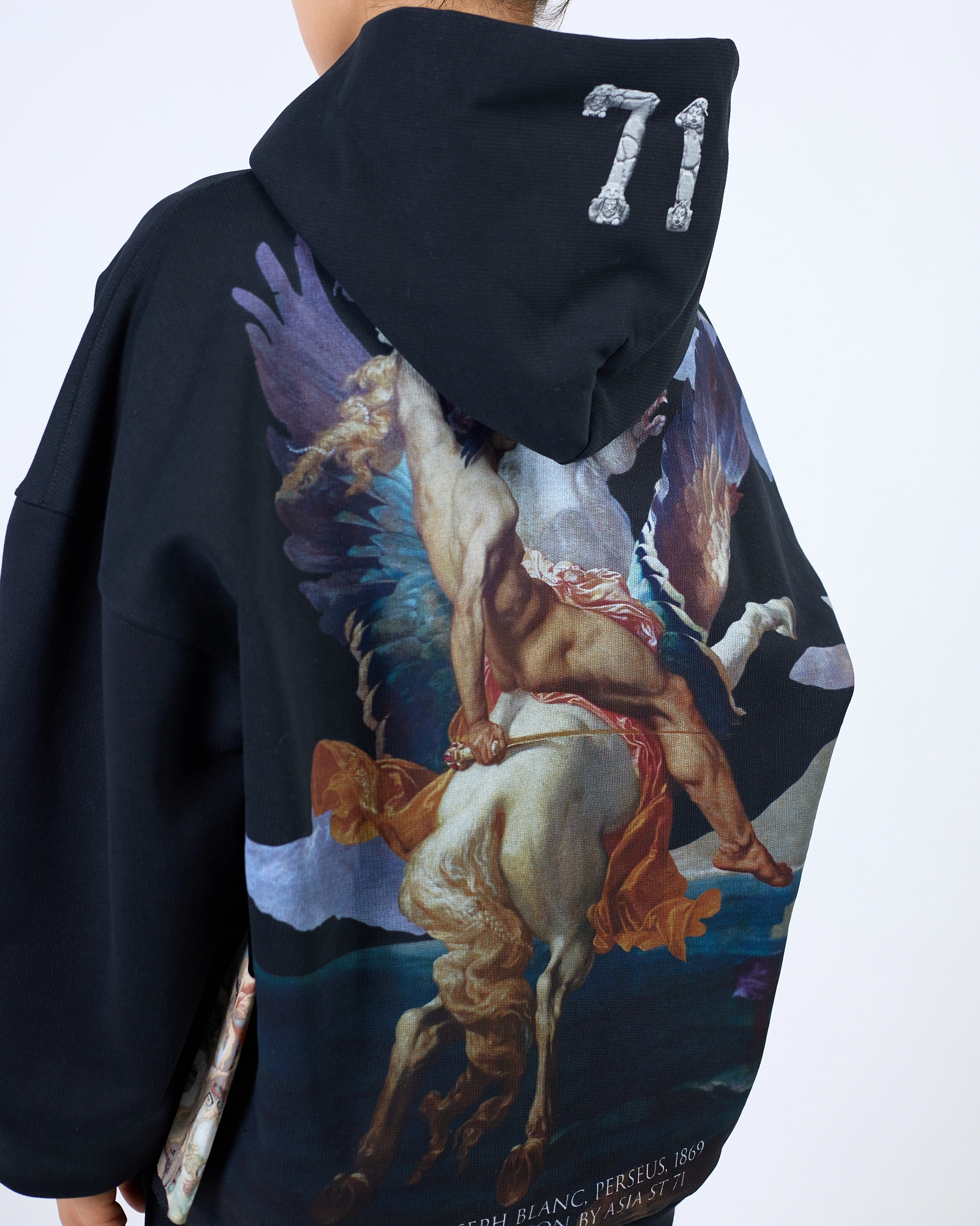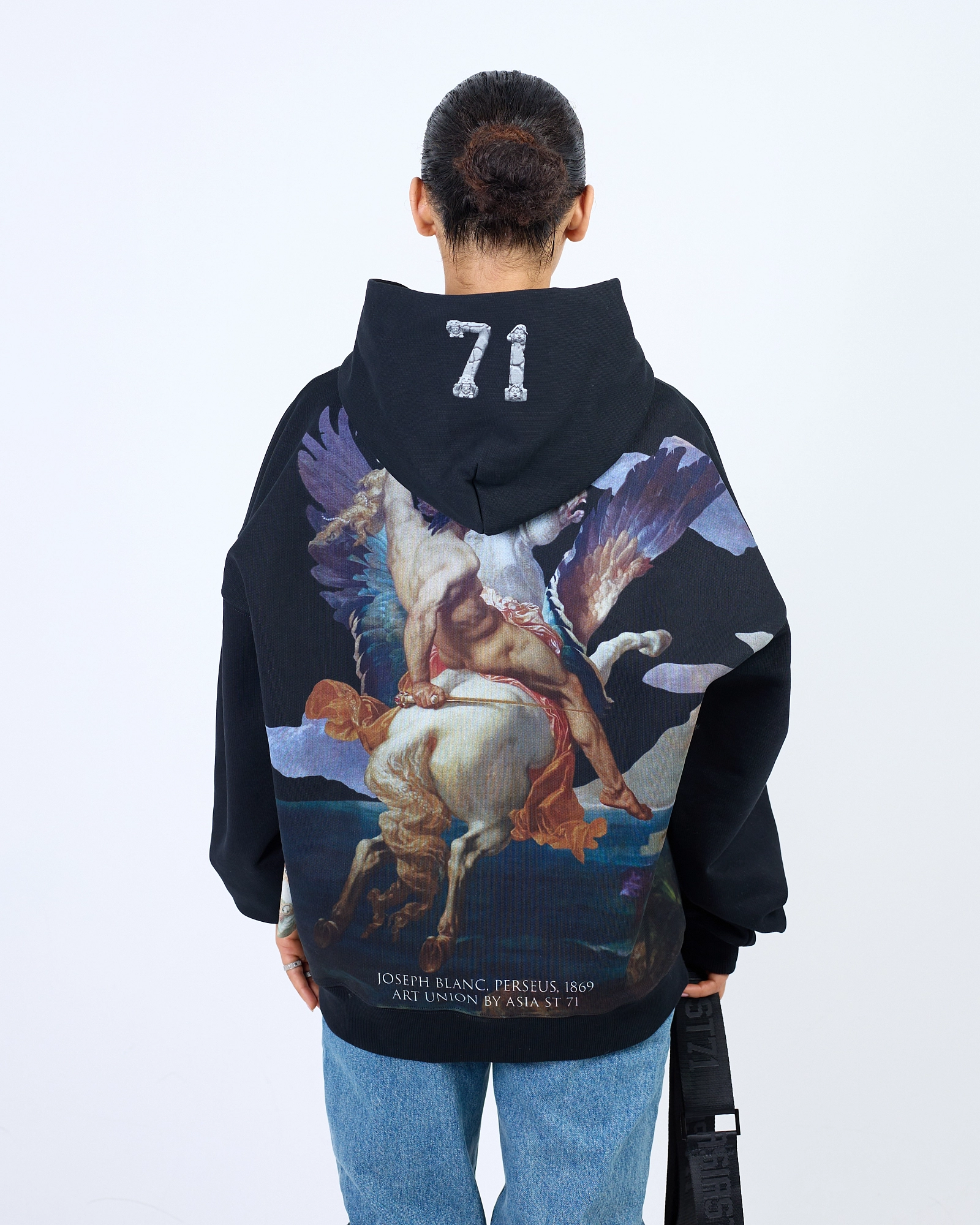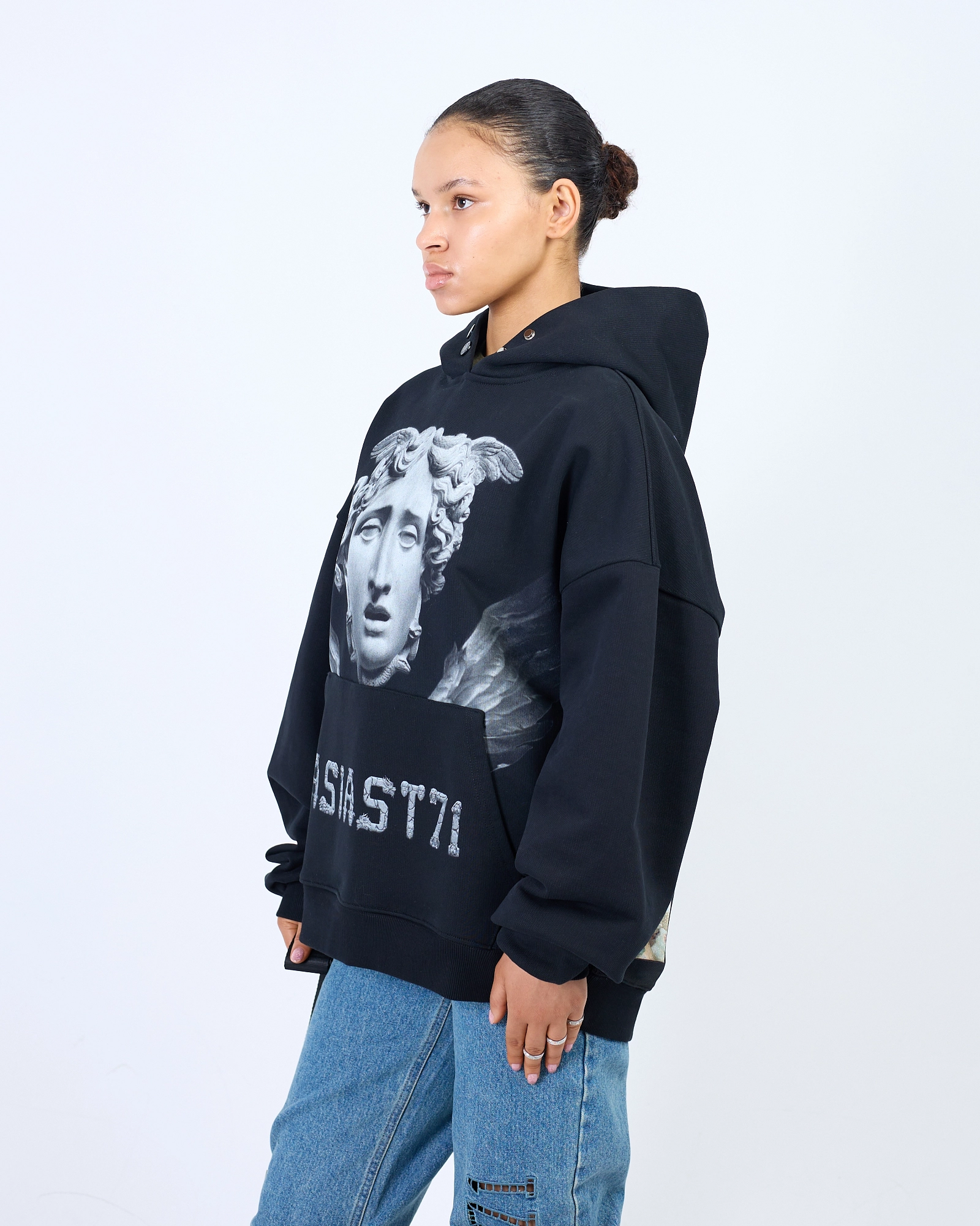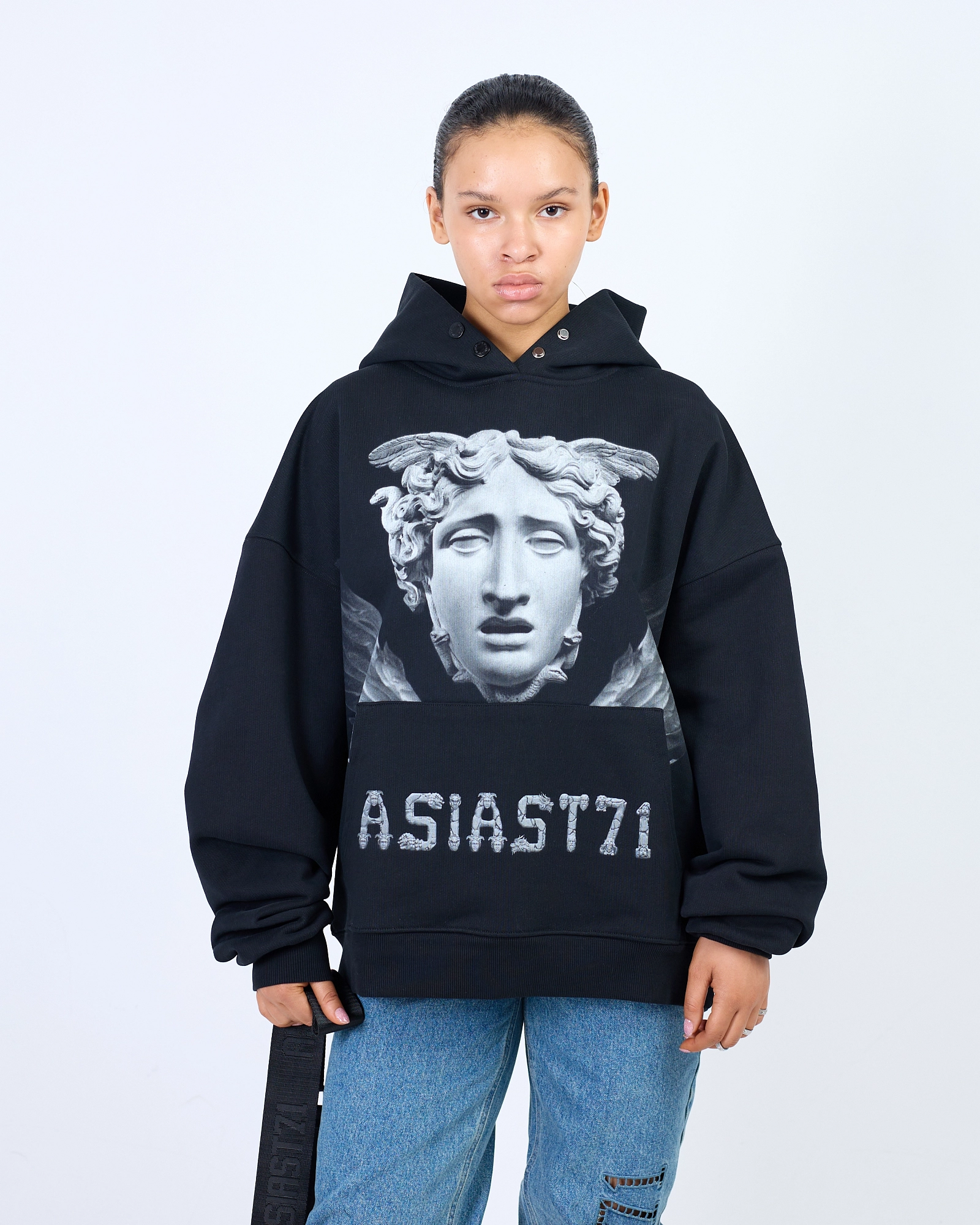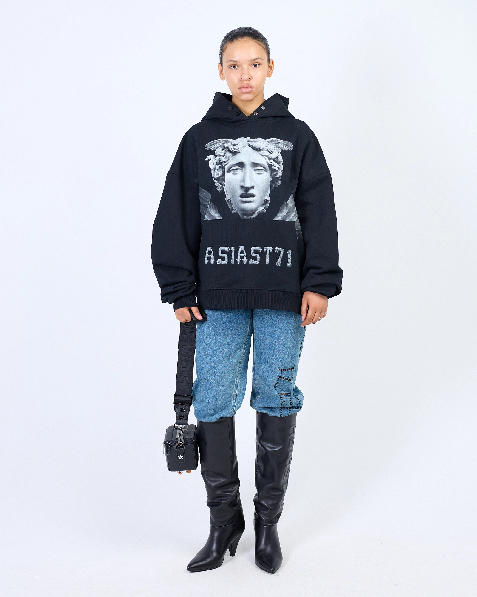 ХУДИ ПРЯМОГО СВОБОДНОГО КРОЯ ВЫПОЛНЕНА ИЗ ПЛОТНОГО ХЛОПКА, ДЕРЖИТ ФОРМУ. ПРИНТ НАНЕСЕН ТЕРМОТРАНСФЕРНОЙ ПЕЧАТЬЮ, СТАЛЬНАЯ БРЕНДИРОВАННАЯ ФУРНИТУРА И ВНЕШНИЙ ИМИДЖЕВЫЙ ЛЕЙБЛ. МЫ РЕКОМЕНДУЕМ РАССТАВИТЬ АКЦЕНТ В TOTAL BLACK, ДОПОЛНИВ ЕГО ТАКЖЕ АКСЕССУАРАМИ. "