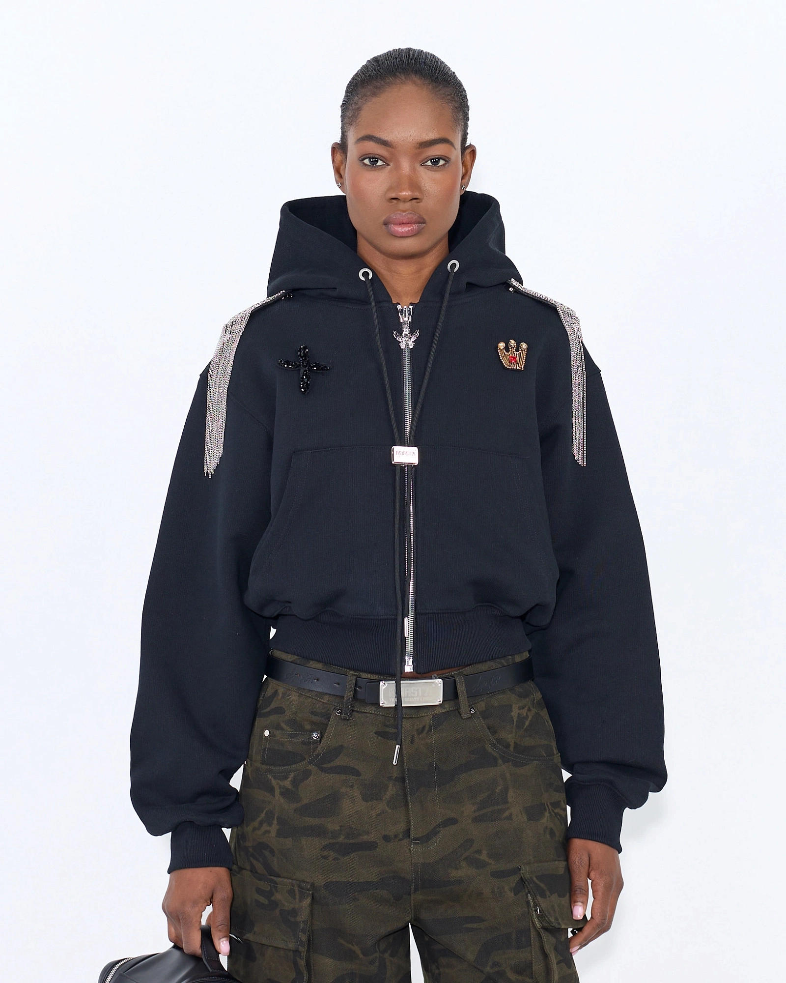 Сочетайте с рубашкой из линейки для выразительного монохромного образа, или добавьте базовый лонгслив и массивные аксессуары — для контрастного streetwear лука.