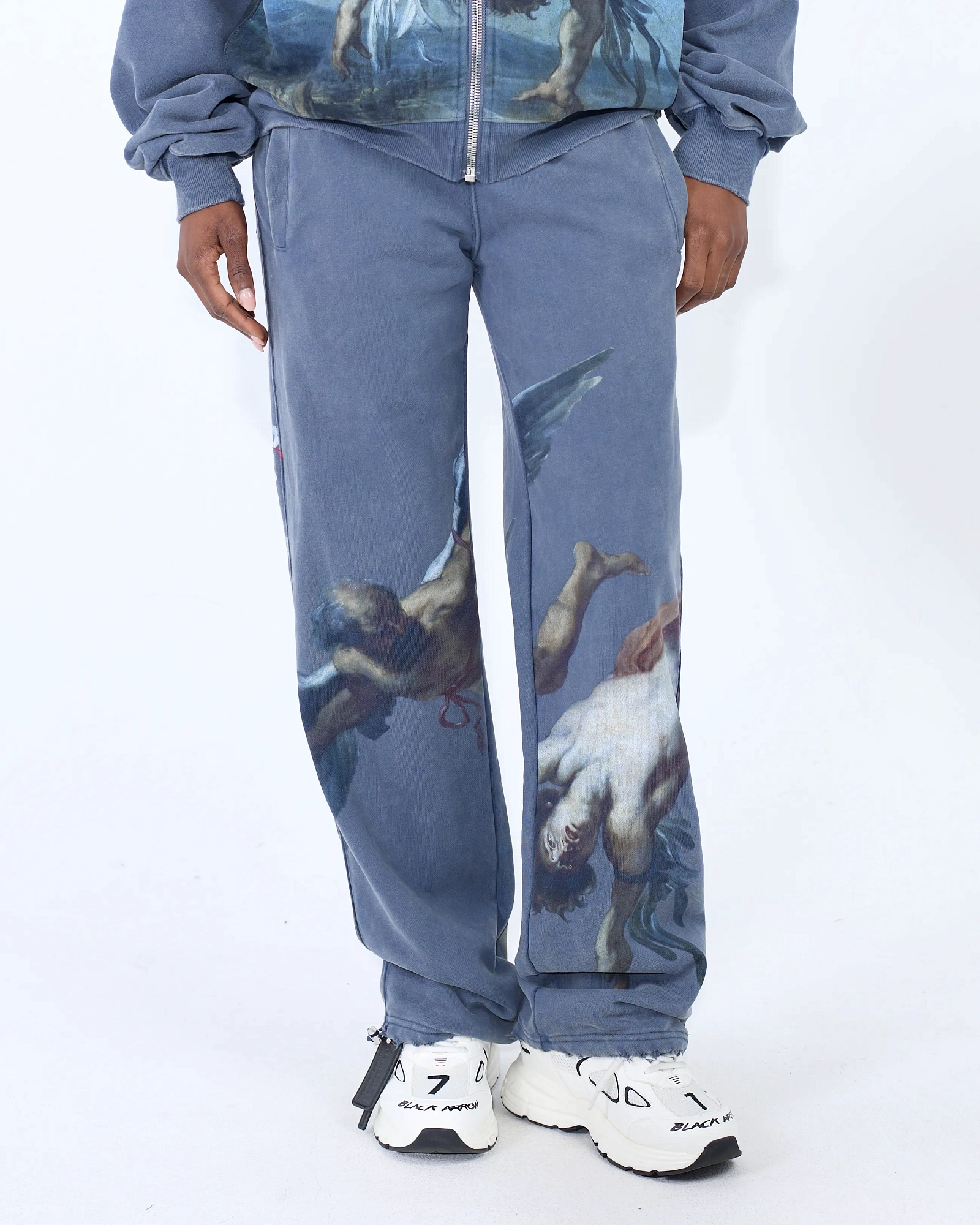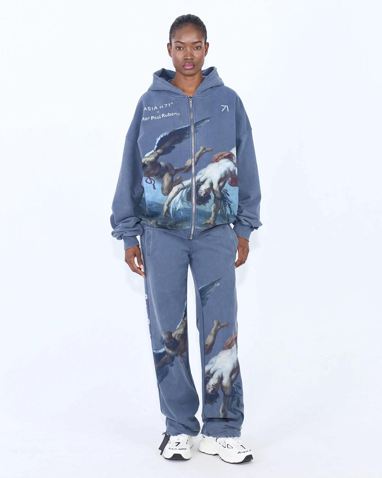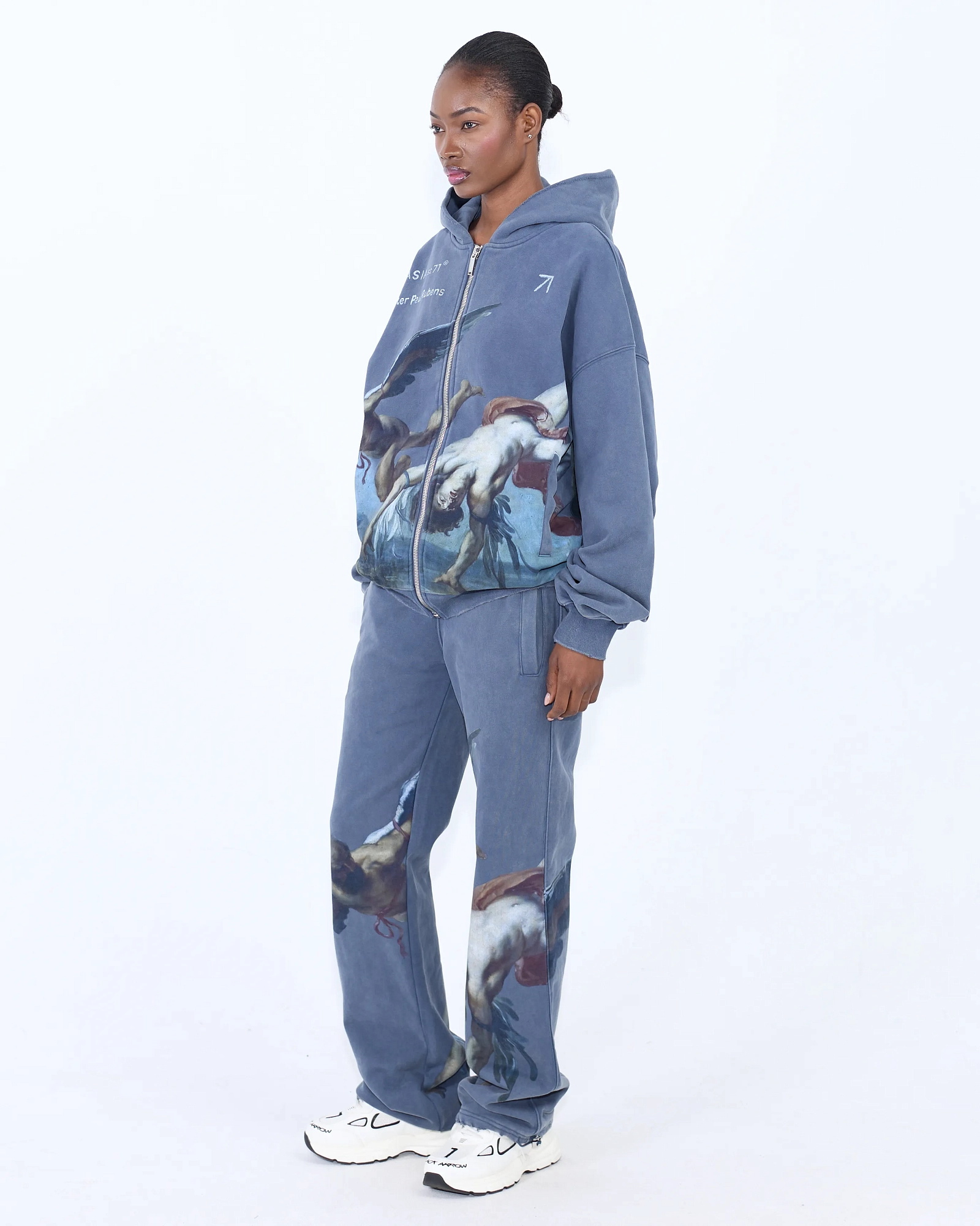 Свободные джоггеры прямого кроя и garment-wash эффектом, где живопись встречает спорт-лайфстайл: крупные принты по мотивам Рубенса расставляют акценты по штанинам. Плотный хлопок, пояс на широкой резинке, боковые карманы. Посадка расслабленная, длина даёт эффект лёгкого «пула» на обуви. Собираем тотал-лук с худи из капсулы или смело сочетаем с лоферами и бомбером.