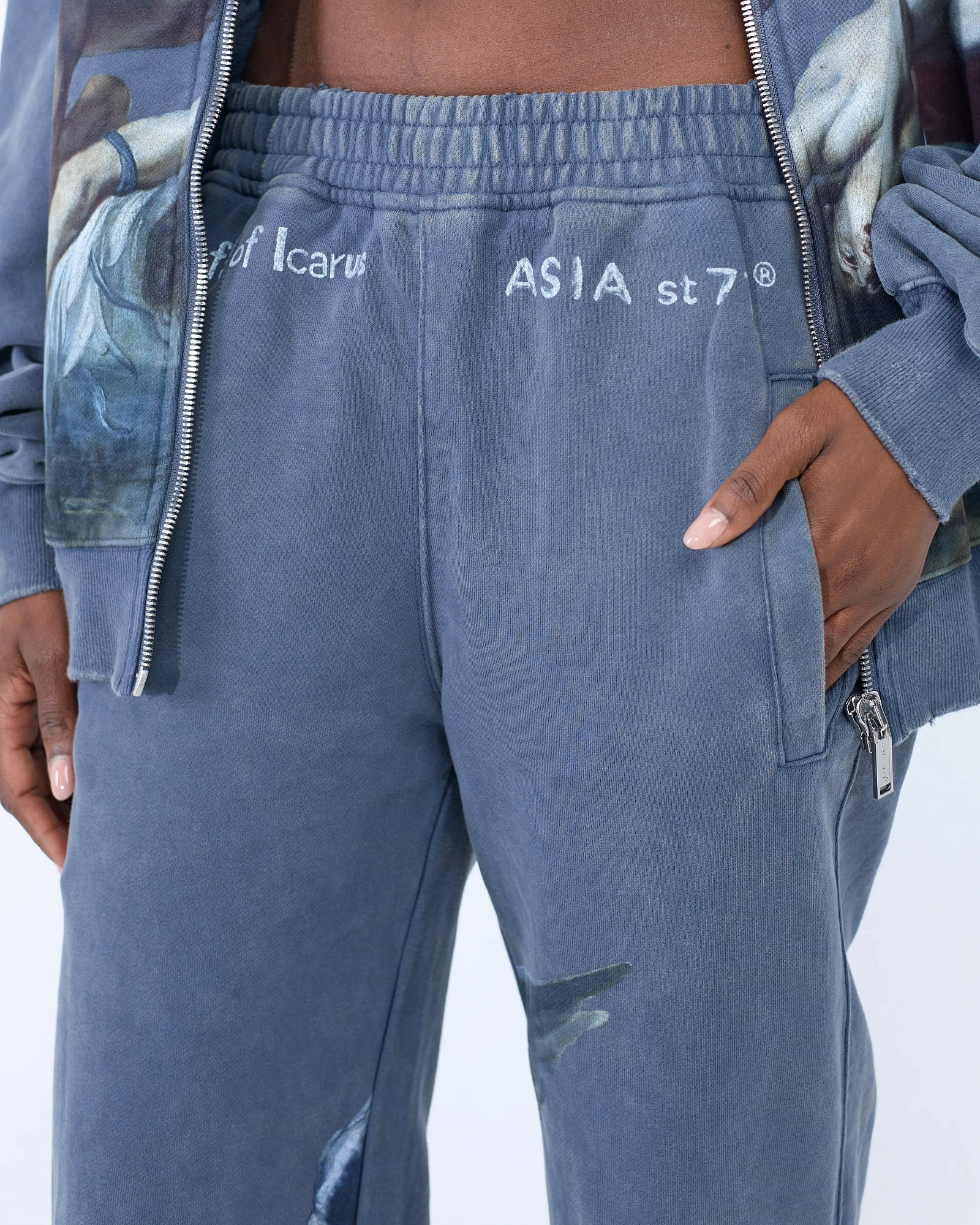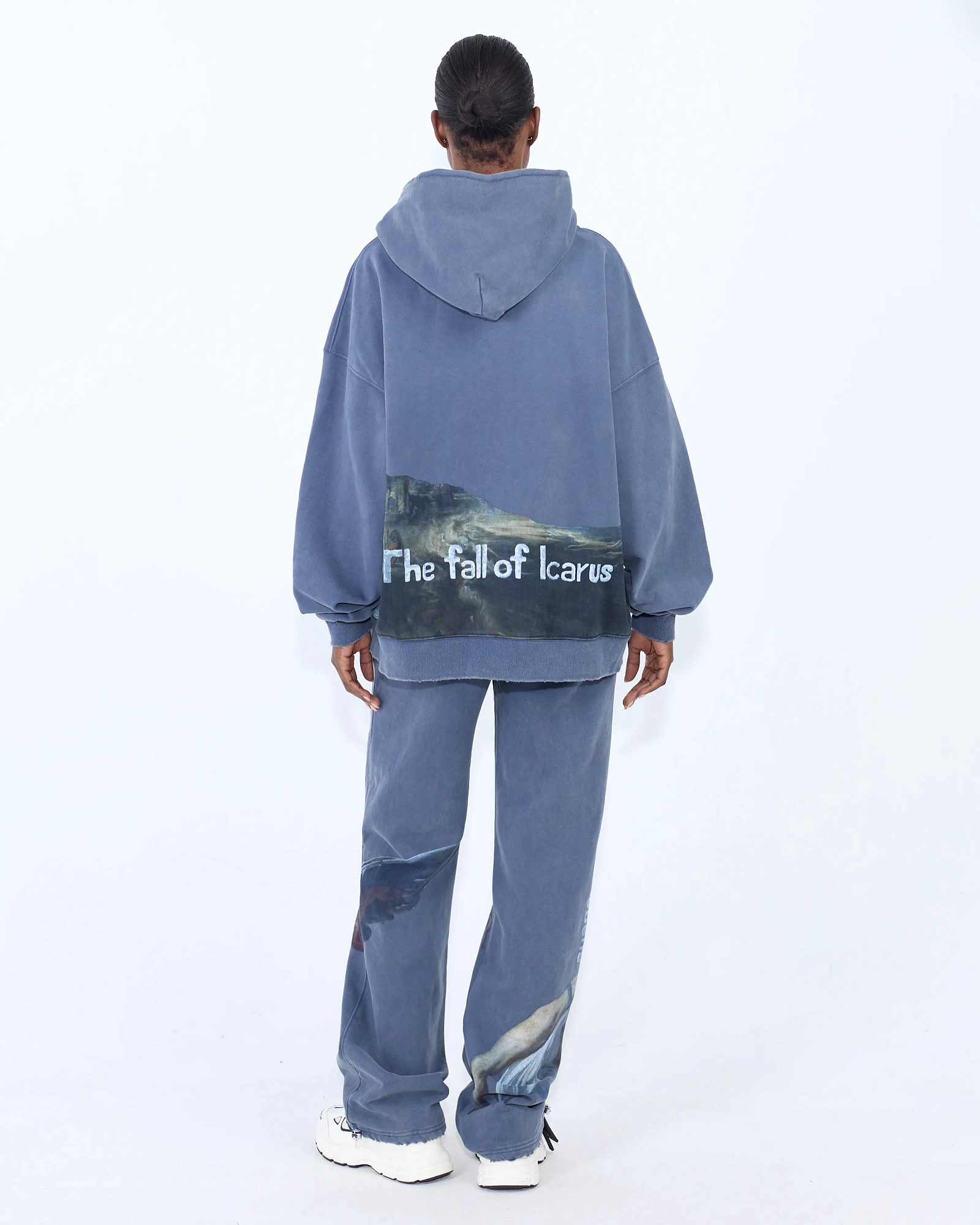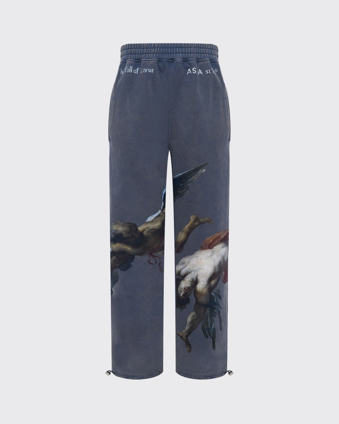 Свободные джоггеры прямого кроя и garment-wash эффектом, где живопись встречает спорт-лайфстайл: крупные принты по мотивам Рубенса расставляют акценты по штанинам. Плотный хлопок, пояс на широкой резинке, боковые карманы. Посадка расслабленная, длина даёт эффект лёгкого «пула» на обуви. Собираем тотал-лук с худи из капсулы или смело сочетаем с лоферами и бомбером.