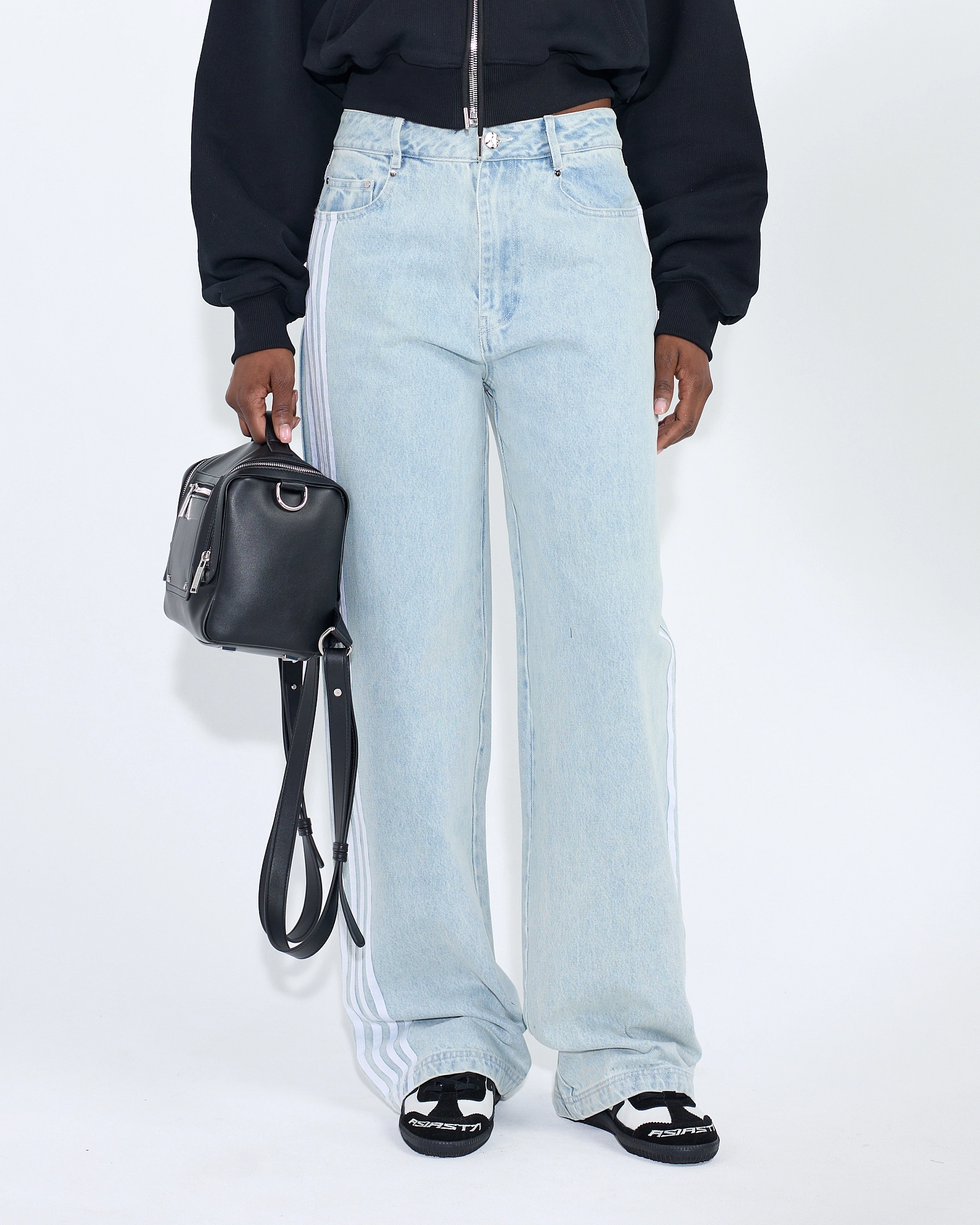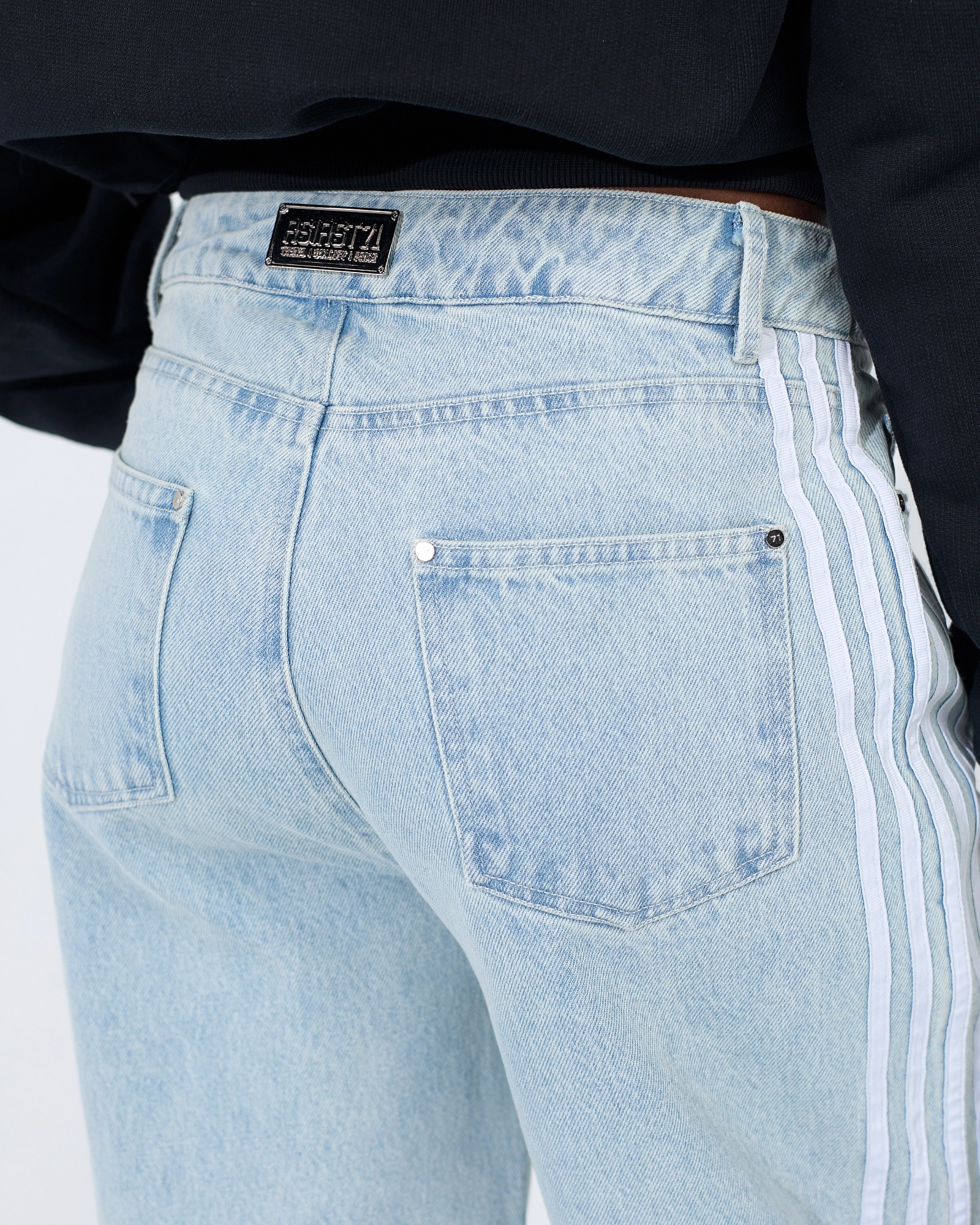 ДЖИНСЫ КЛАССИЧЕСКОГО СИЛУЭТА, ОТСЫЛАЮЩИЕ К СПОРТИВНОЙ ЭСТЕТИКЕ БЛАГОДАРЯ ДЕКОРАТИВНЫМ ЭЛЕМЕНТАМ. ЧЕРНАЯ НЕОБРАБОТАННАЯ ДЖИНСА С ВЫРАЖЕННОЙ ФАКТУРОЙ ДОПОЛНЕНА АССИМЕТРИЧНЫМИ ЛАМПАСАМИ И ПОТЕРТОСТЬЮ В ЗОНЕ БЕДЕР, ПО КРАЮ ШТАНИН, А ШВЫ ОБРАБОТАНЫ АКЦЕНТНЫМИ СТРОЧКАМИ. ПОЛНАЯ ДЛИНА ПОЗВОЛЯЕТ НОСИТЬ ИХ КАК С КРОССОВКАМИ, ТАК И С ОБУВЬЮ НА ВЫСОКОМ КАБЛУКЕ, СОЗДАВАЯ ОБРАЗЫ В ДУХЕ SPORT CHIC.