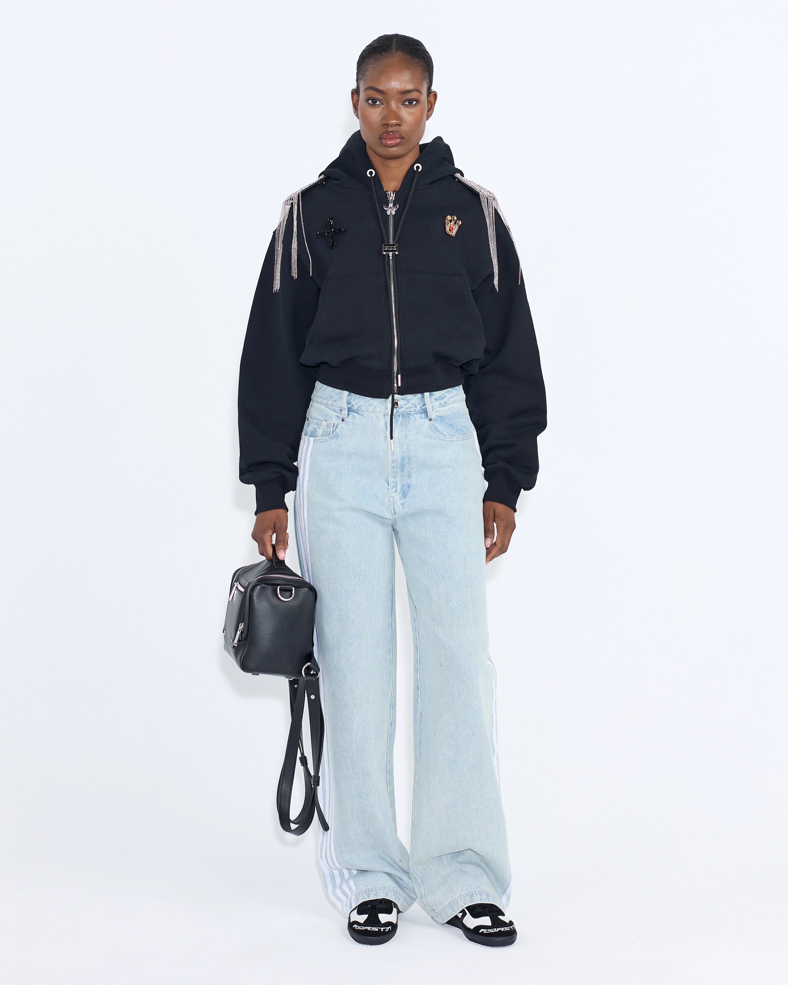 ДОПОЛНИТЕ АУТФИТ СУМКОЙ В МОТО-СТИЛЕ И ОБЪЕМНЫМ ХУДИ С ПОВТОРЯЮЩИМСЯ ПРИНТОМ."