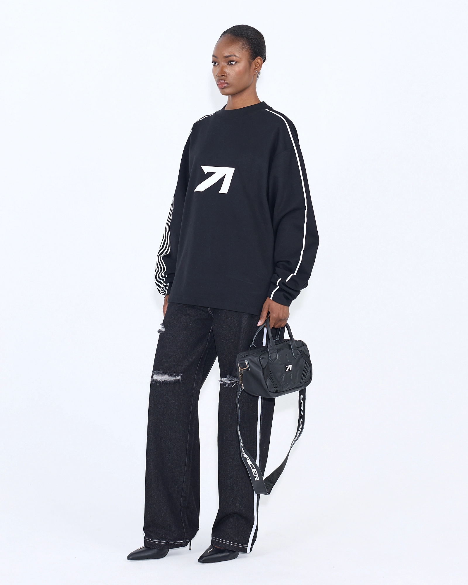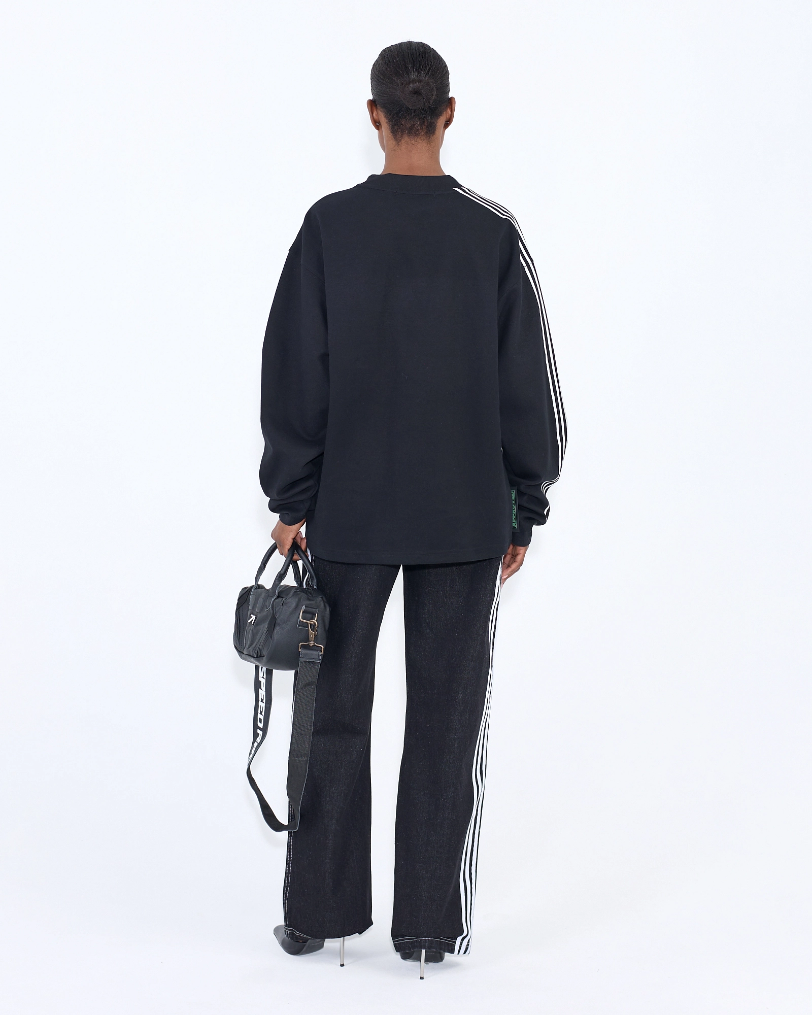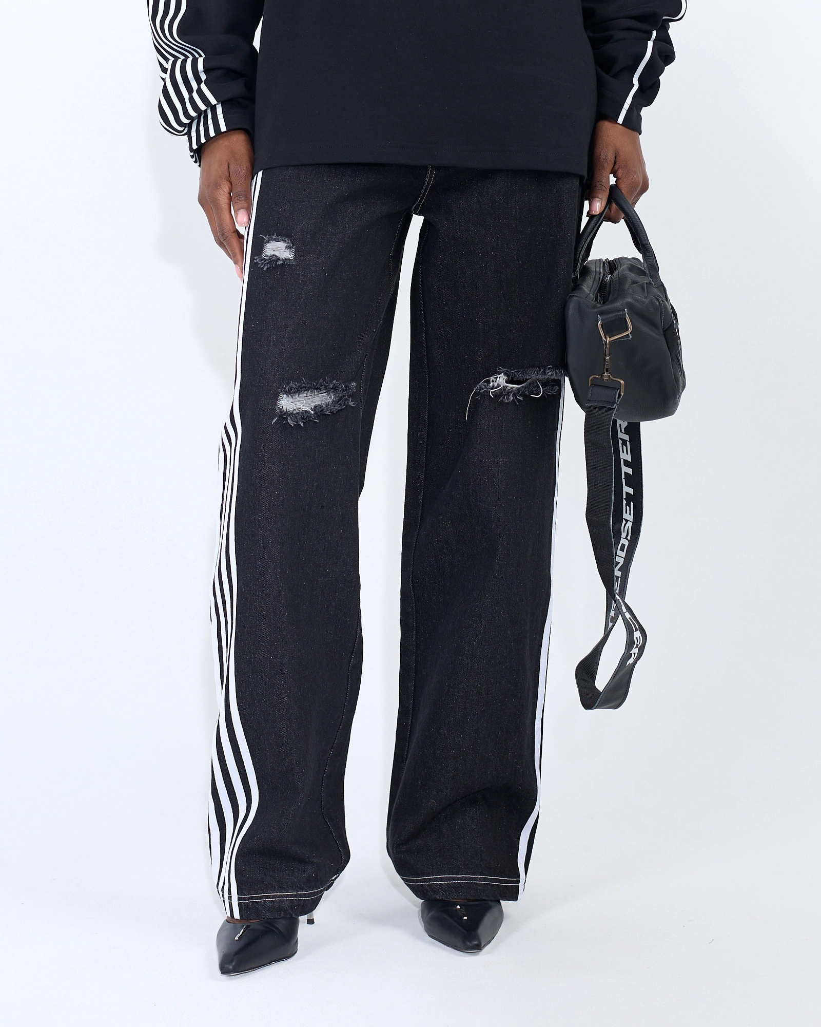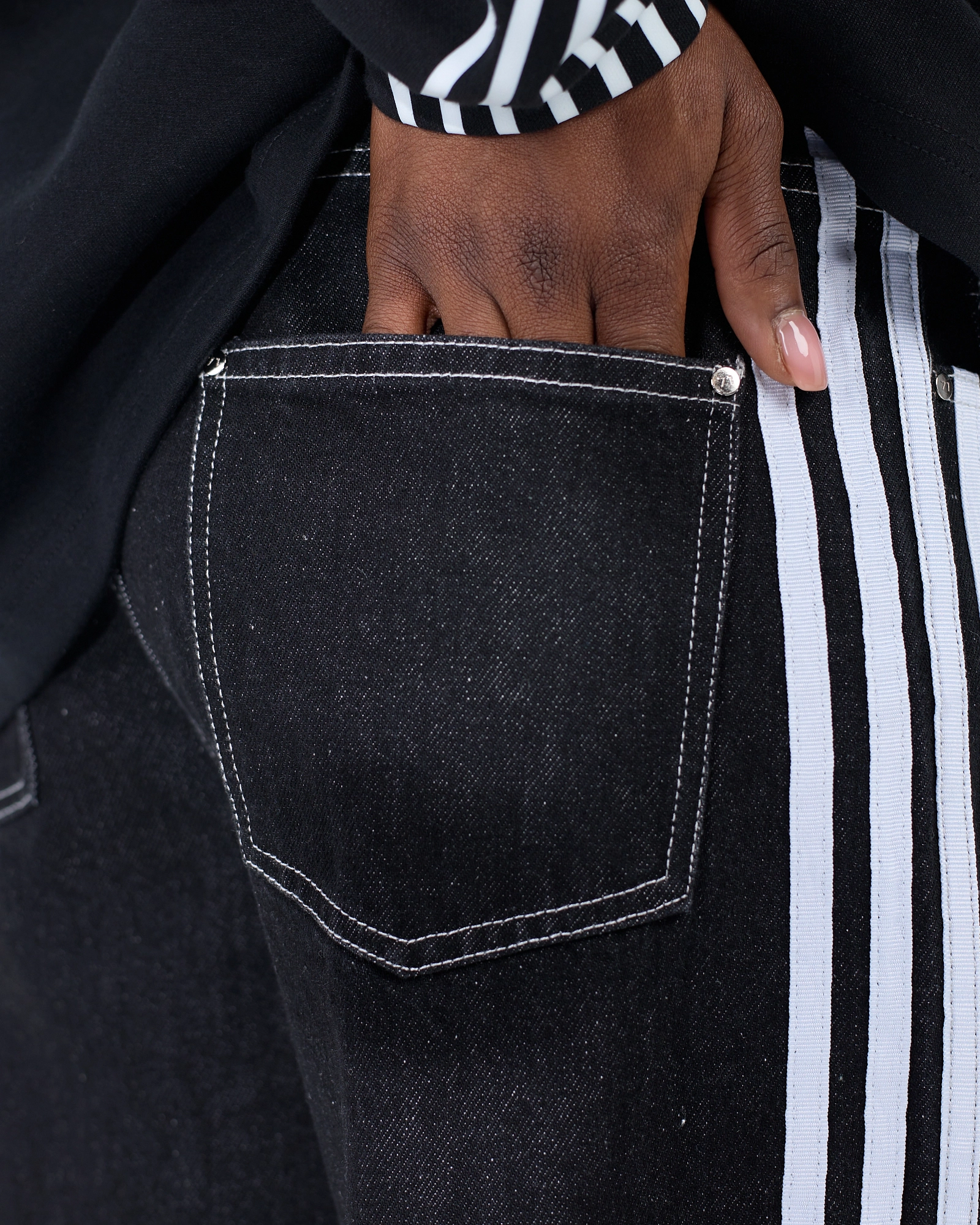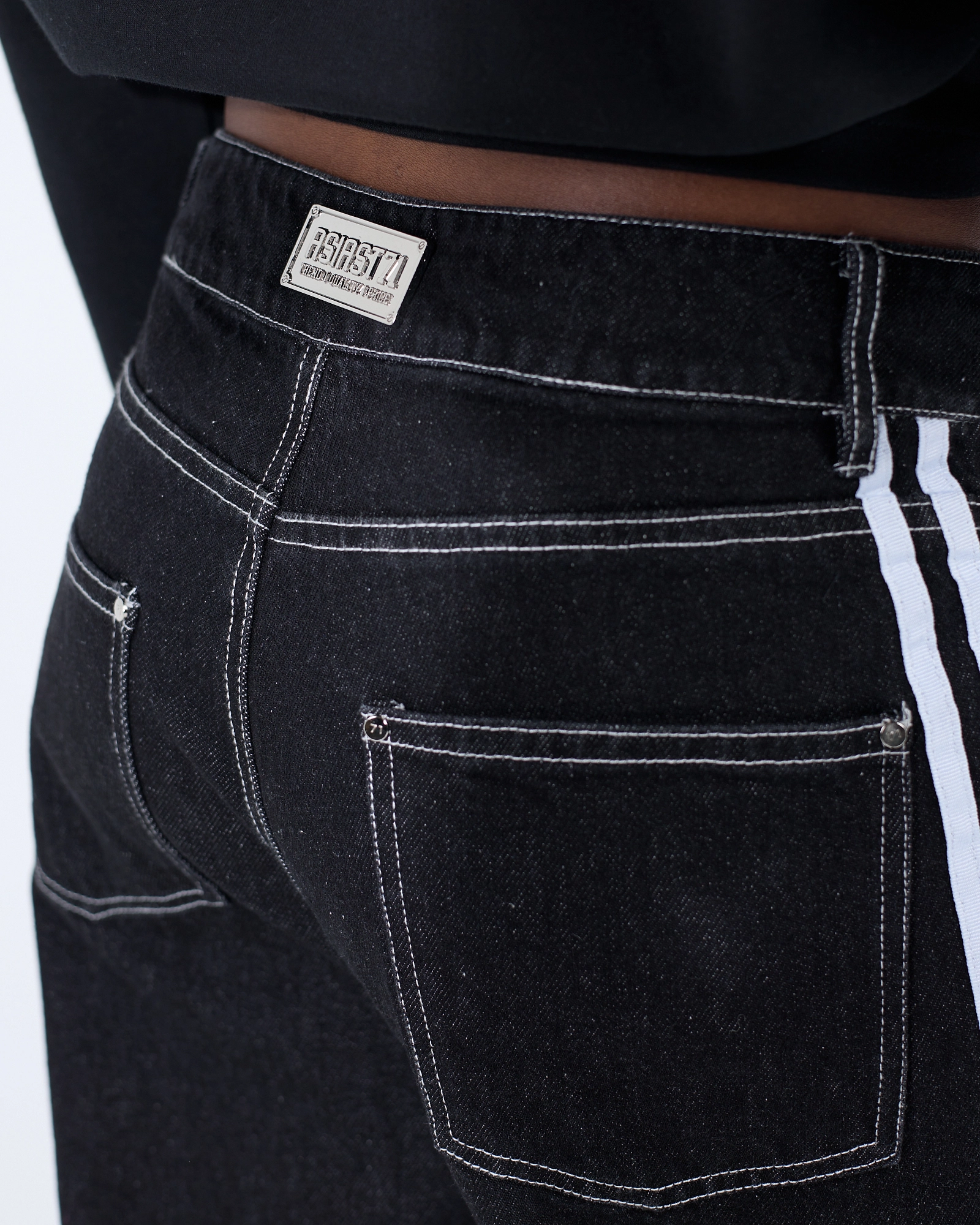 ДЖИНСЫ КЛАССИЧЕСКОГО СИЛУЭТА, ОТСЫЛАЮЩИЕ К СПОРТИВНОЙ ЭСТЕТИКЕ БЛАГОДАРЯ ДЕКОРАТИВНЫМ ЭЛЕМЕНТАМ. ПРАВИЛЬНАЯ ГОЛУБАЯ ДЖИНСА ДОПОЛНЕНА АССИМЕТРИЧНЫМИ ЛАМПАСАМИ. ПОЛНАЯ ДЛИНА И ВЫСОКАЯ ПОДСАДКА ПОЗВОЛЯЮТ НОСИТЬ ИХ КАК С КРОССОВКАМИ, ТАК И С ОБУВЬЮ НА ВЫСОКОМ КАБЛУКЕ, СОЗДАВАЯ ОБРАЗЫ В ДУХЕ SPORT CHIC.