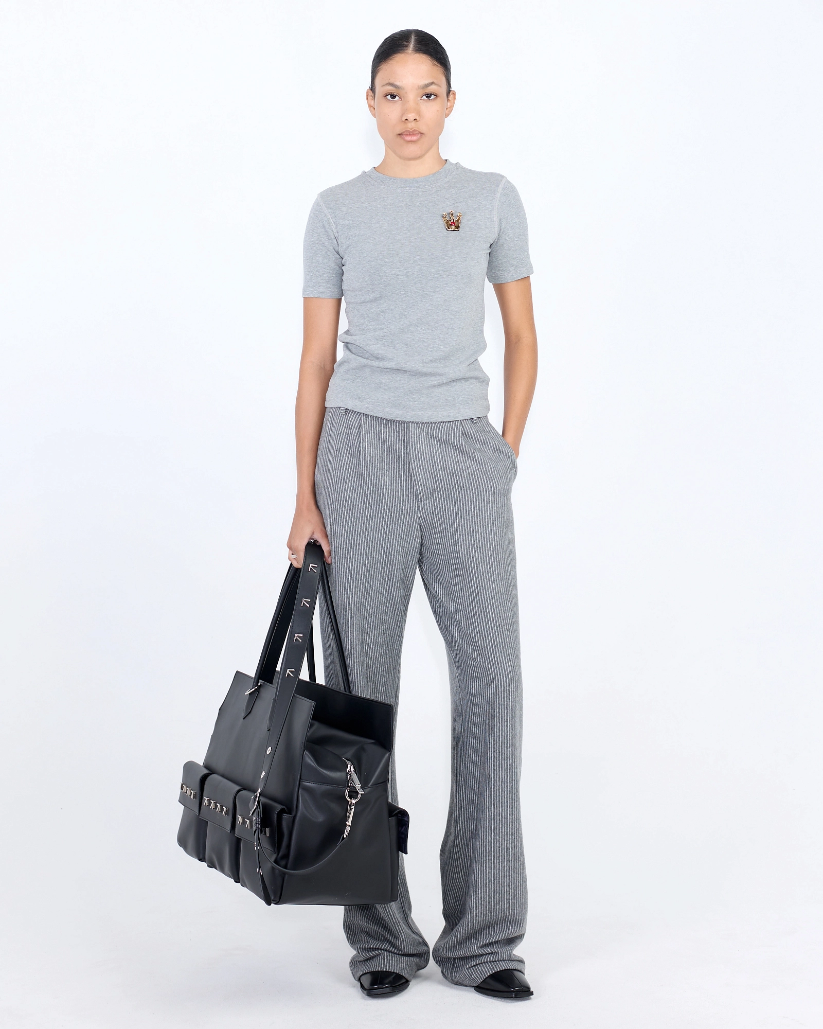 ПРИНТОМ, НАНЕСЁННЫЙ ТЕРМОТРАНСФЕРНОЙ ПЕЧАТЬЮ. ЛОГОТИП ВЫПОЛНЕН С ИСПОЛЬЗОВАНИЕМ ТЕХНОЛОГИИ ПЛОСКОЙ МНОГОЦВЕТНОЙ ВЫШИВКИ. НА ГОРЛОВИНЕ НАХОДЯТСЯ МЕТАЛЛИЧЕСКИЕ КОНУСЫ, А СБОКУ РАСПОЛОЖЕН БРЕНДИРОВАННЫЙ АКЦЕНТНЫЙ ЛЕЙБЛ."