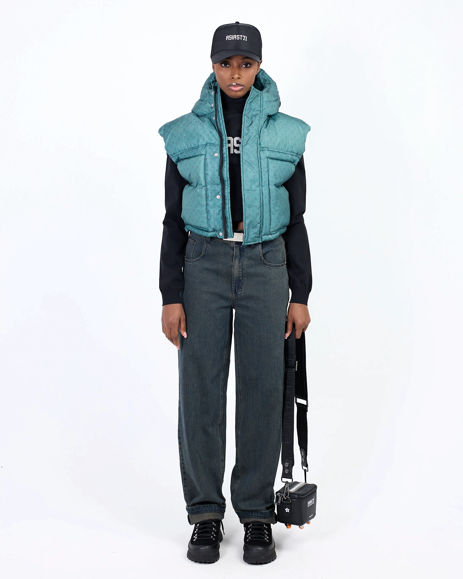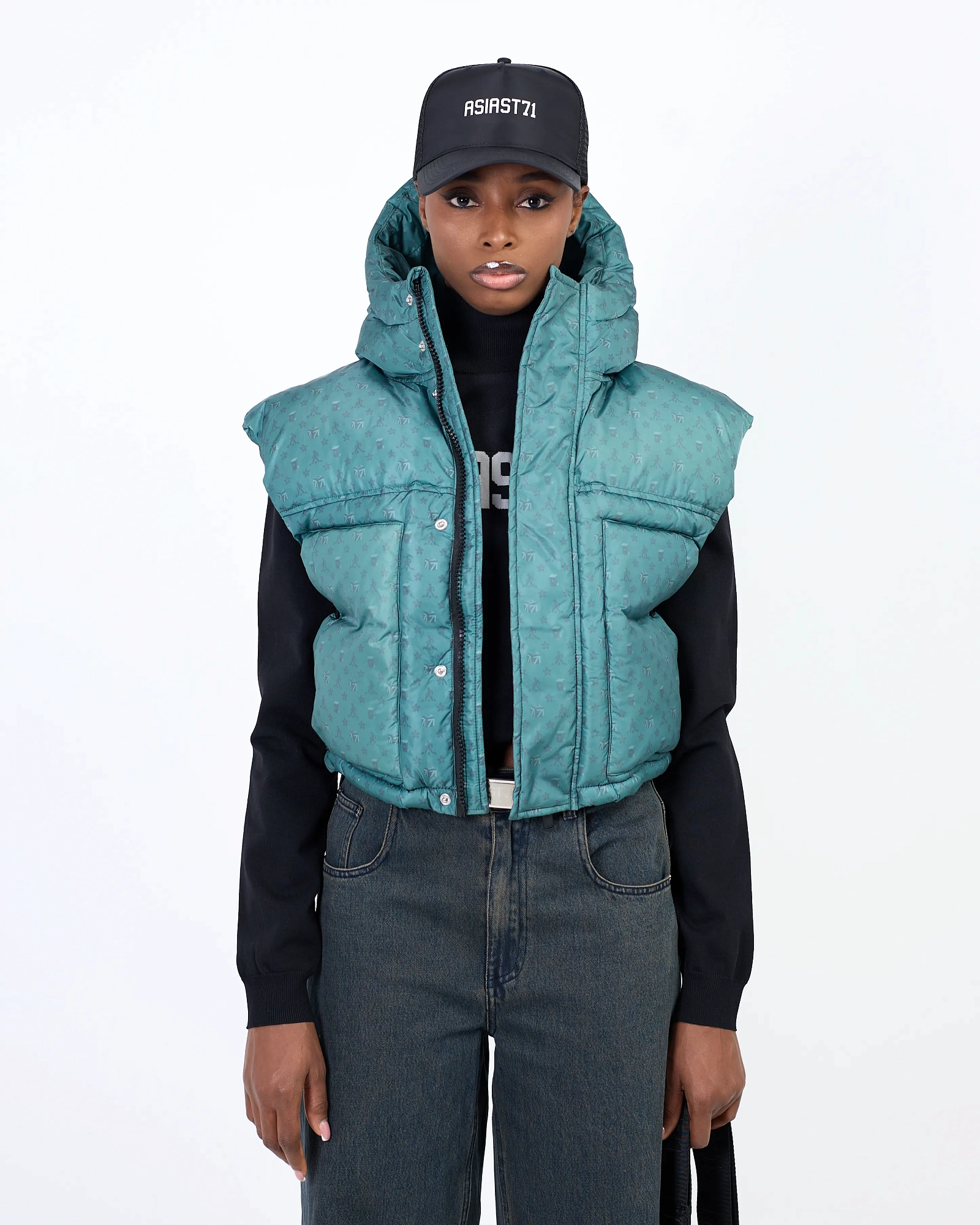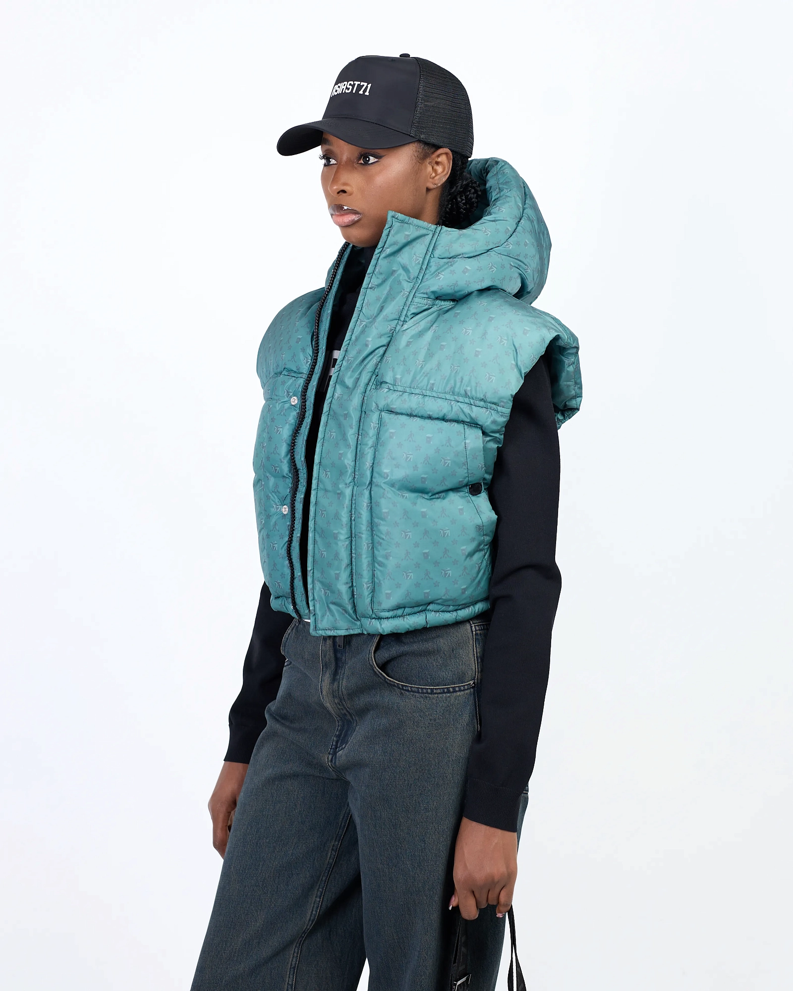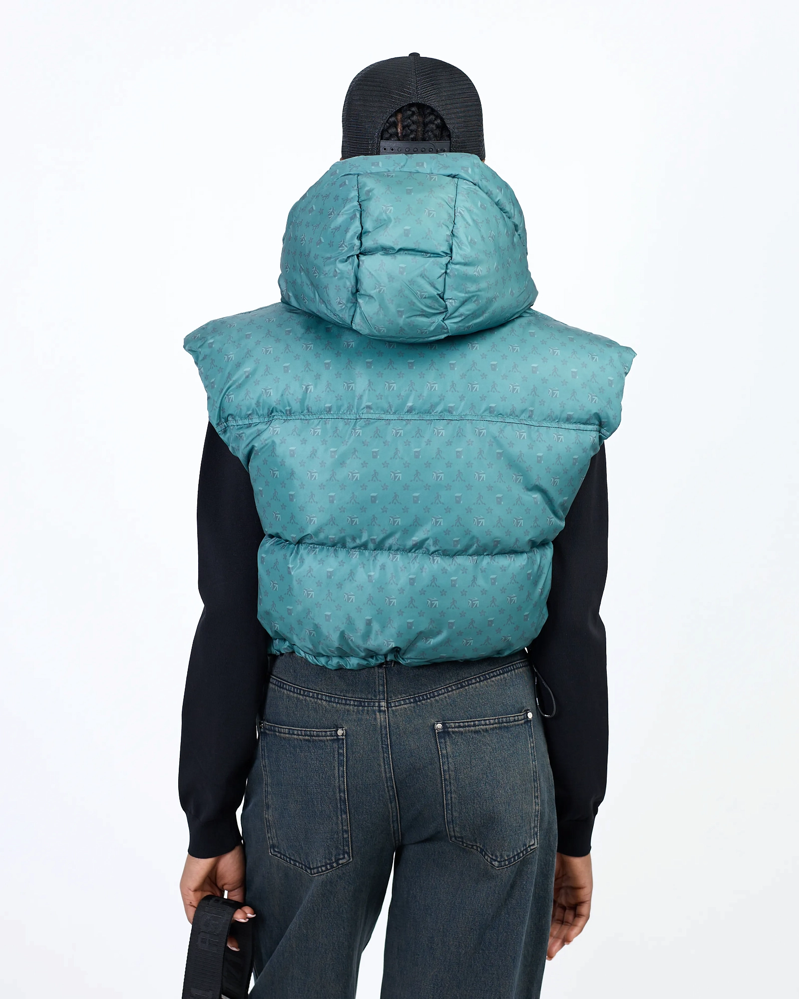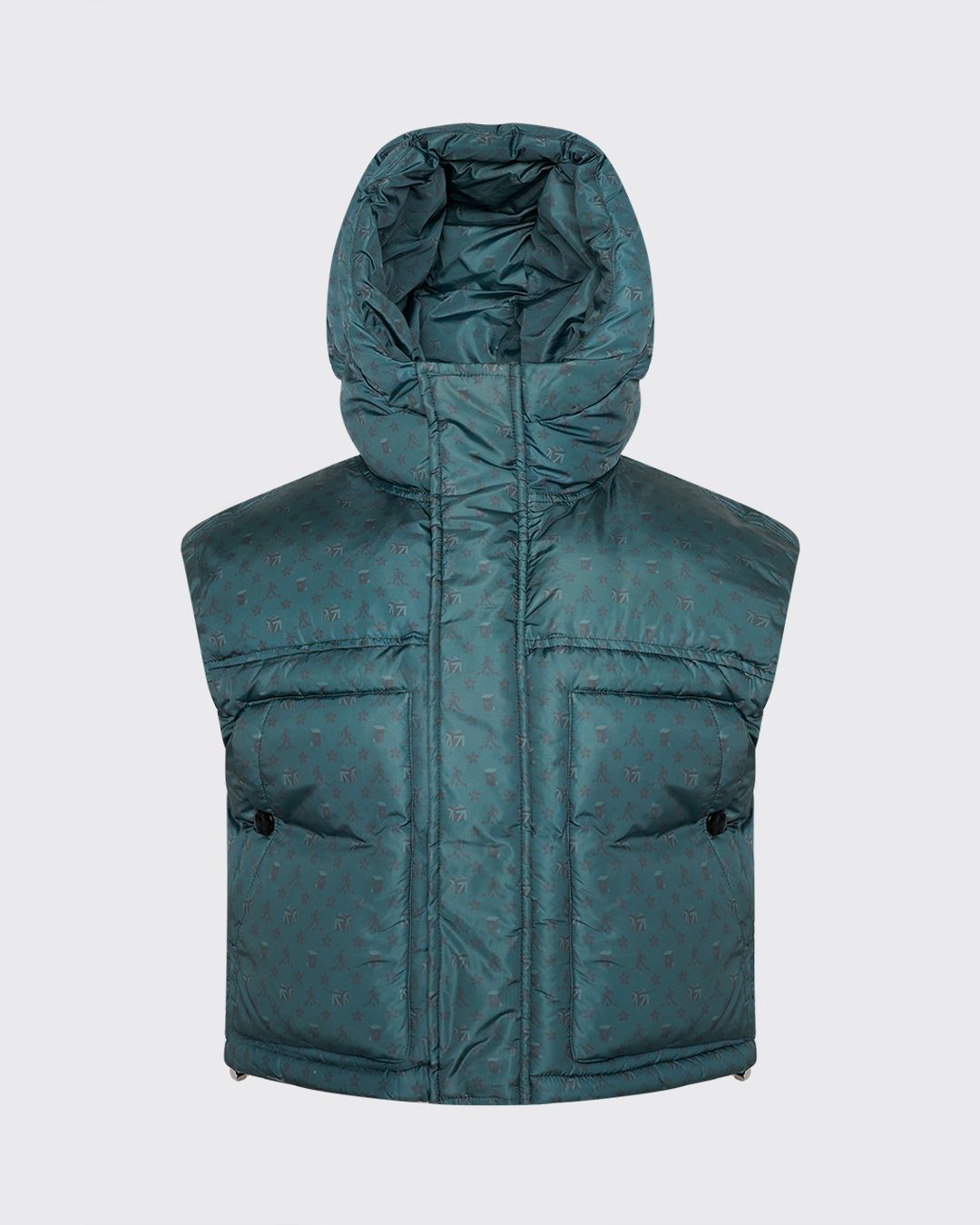Дутый жилет с фирменной монограммой в укороченном варианте. Внутри гипоаллергенный утеплитель холлофайбер, жилет дополнительно простеган. Широкая линия плеча создает правильный оверсайз силуэт, а благодаря широким проймам его можно надеть на объемный джемпер или худи. Глубокий несъемный капюшон и накладные карманы спереди. Помимо брендированной молнии добавлена планка, защищающая от ветра. По нижнему краю кулиска с фиксаторами для возможности утяжки.