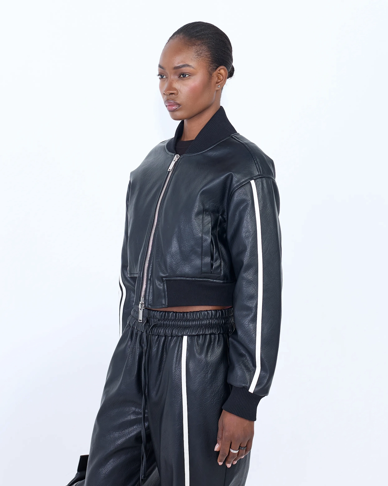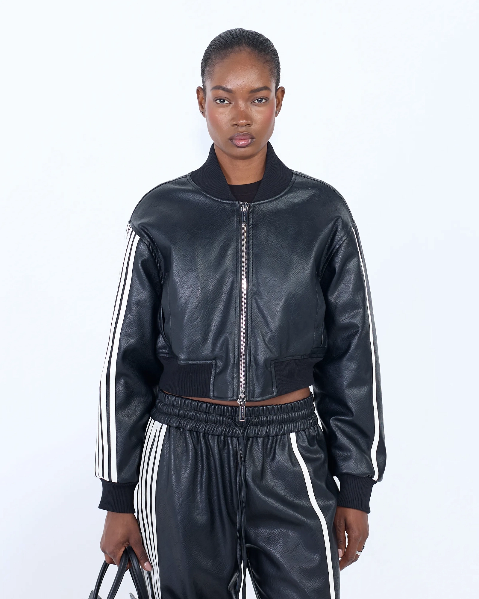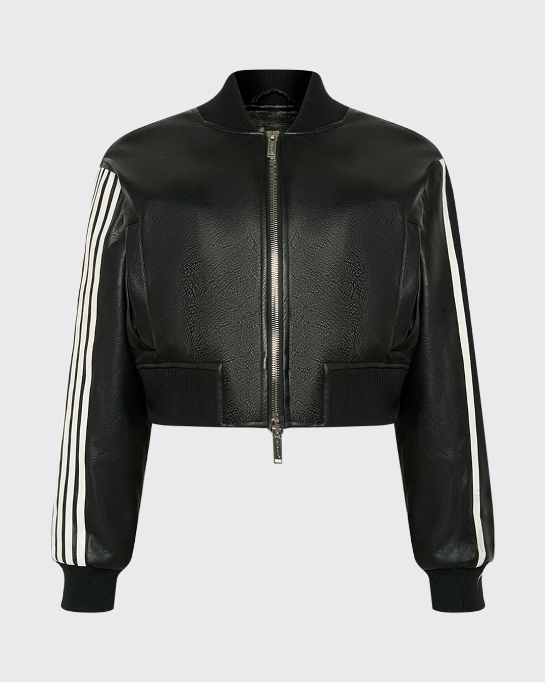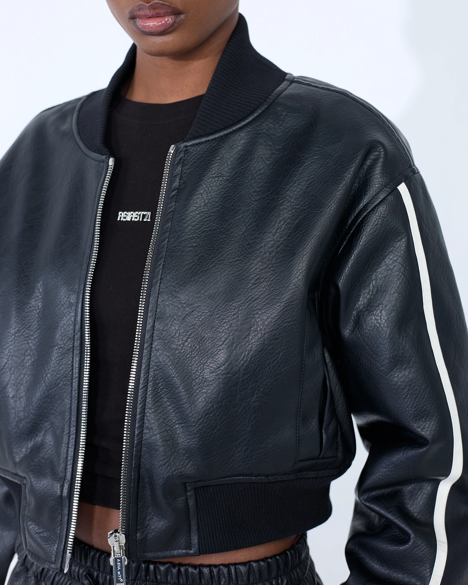 КУРТКА ИЗ КАЧЕСТВЕННОЙ ЭКО-КОЖИ В УКОРОЧЕННОМ ВАРИАНТЕ С СВОБОДНЫМ КРОЕМ, ОБЪЕМНЫМИ ПЛЕЧАМИ И ВОРОТНИКОМ СТОЙКОЙ, ДОПОЛНЕННАЯ БРЕНДИРОВАННОЙ СТАЛЬНОЙ ФУРНИТУРОЙ В ВИДЕ СИМВОЛА НАШЕГО БРЕНДА, ПРЕДСТАВЛЯЮЩЕГО СОБОЙ СОВМЕЩЕННЫЕ ЦИФРЫ 7 И 1, СТАНЕТ ЯРКИМ АКЦЕНТОМ В ВАШЕМ ГАРДЕРОБЕ.